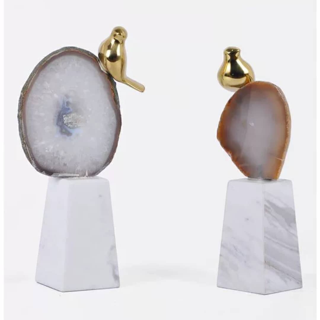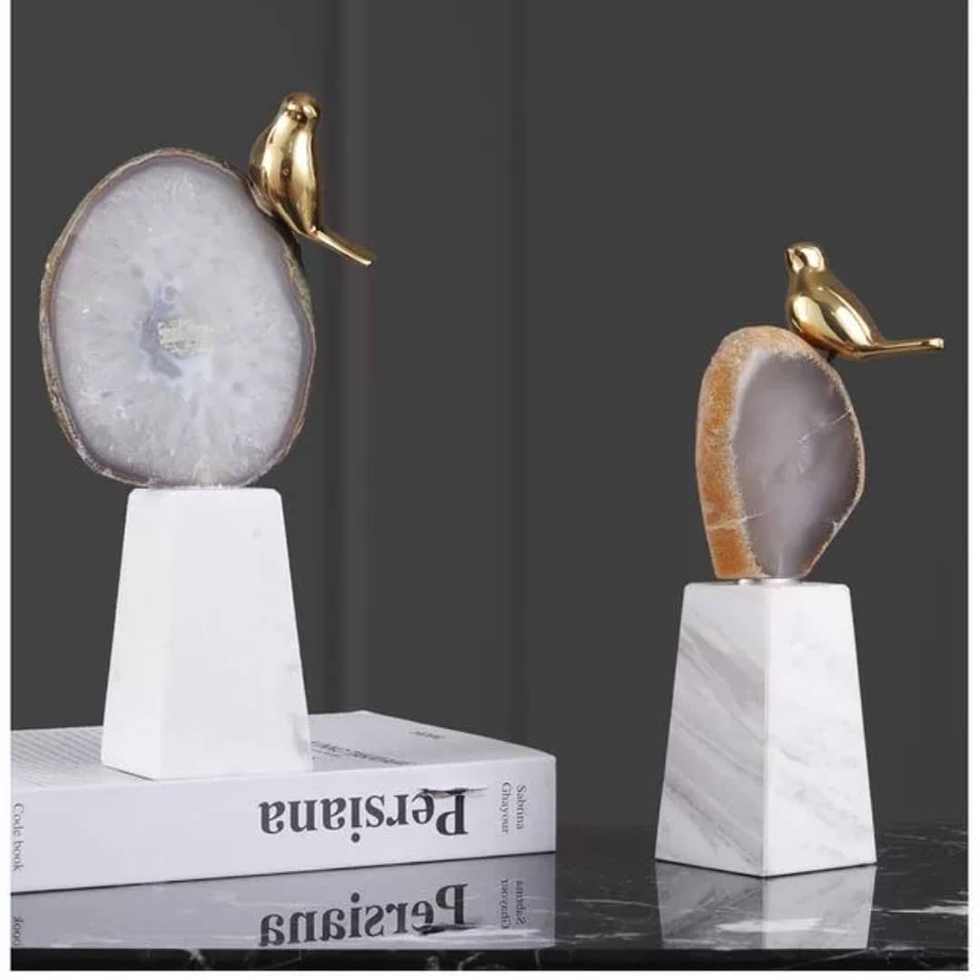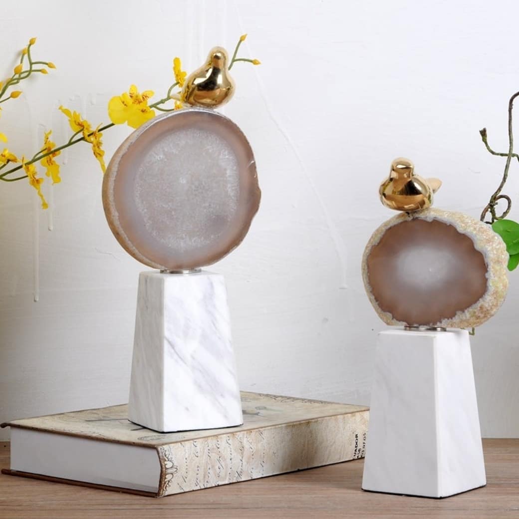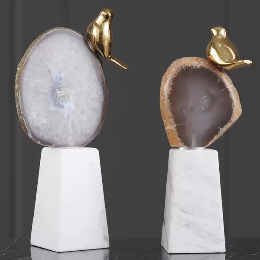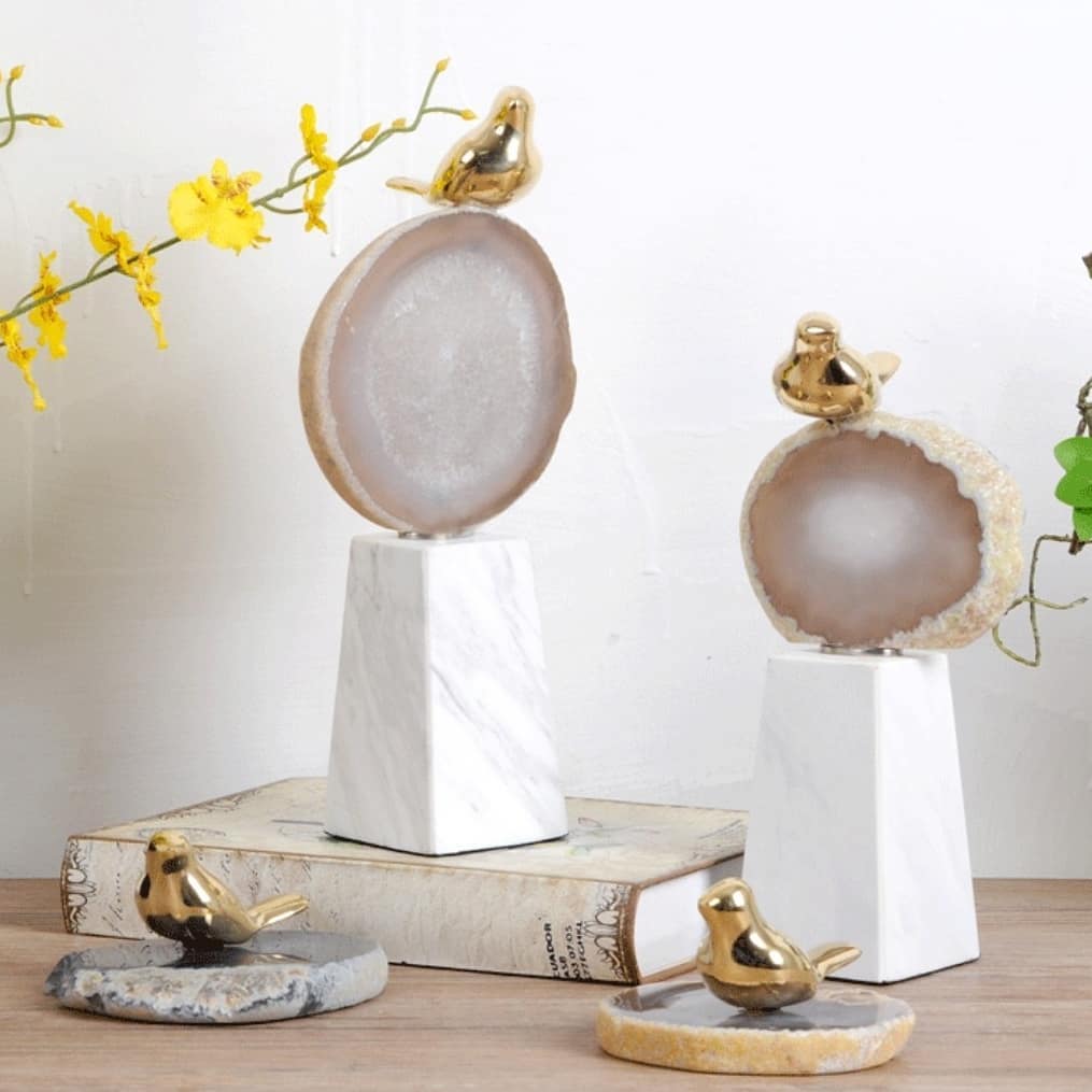 Держатели книг и красивый декор – одновременно! Срез жеоды агата, покрытой чудесными кристаллами, очаровательная птичка из латуни и основание – из натурального мрамора.