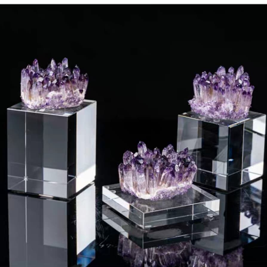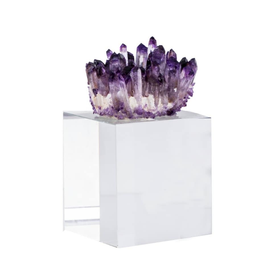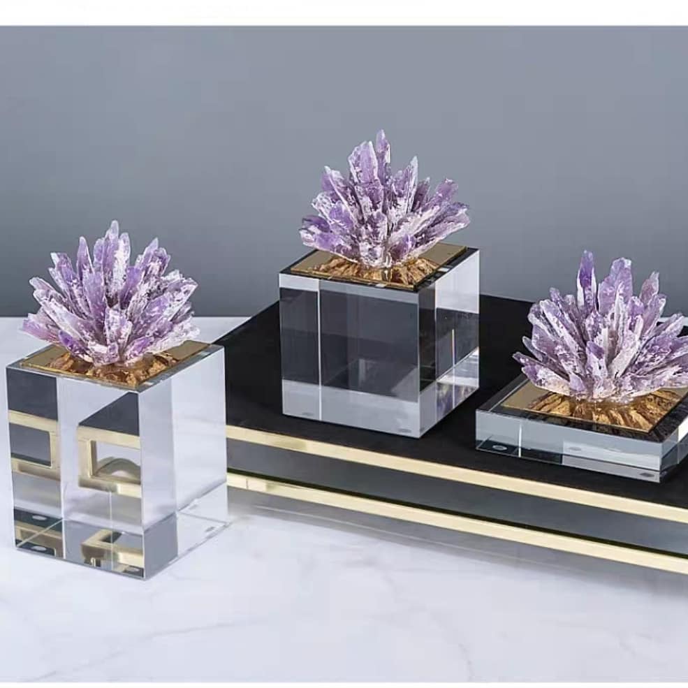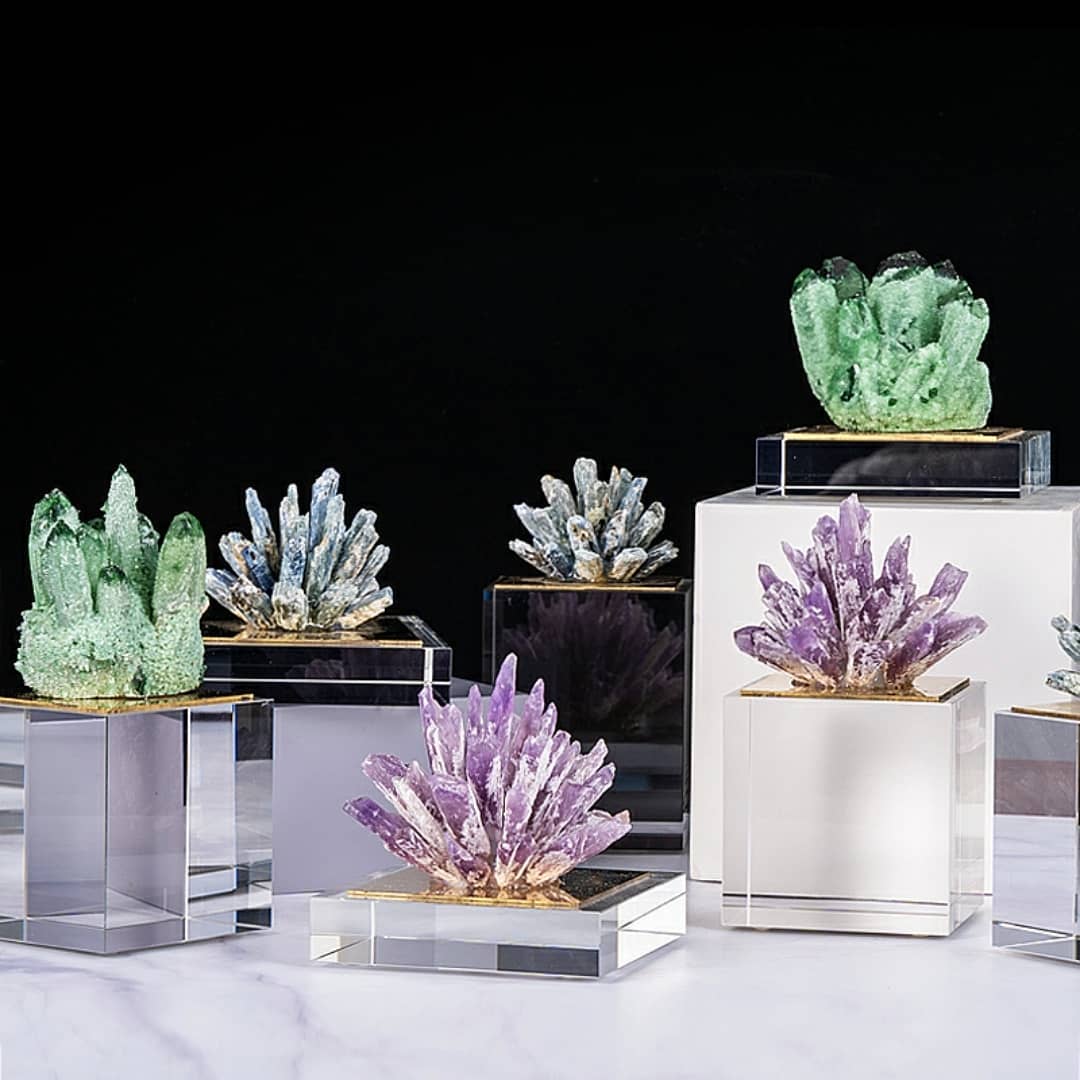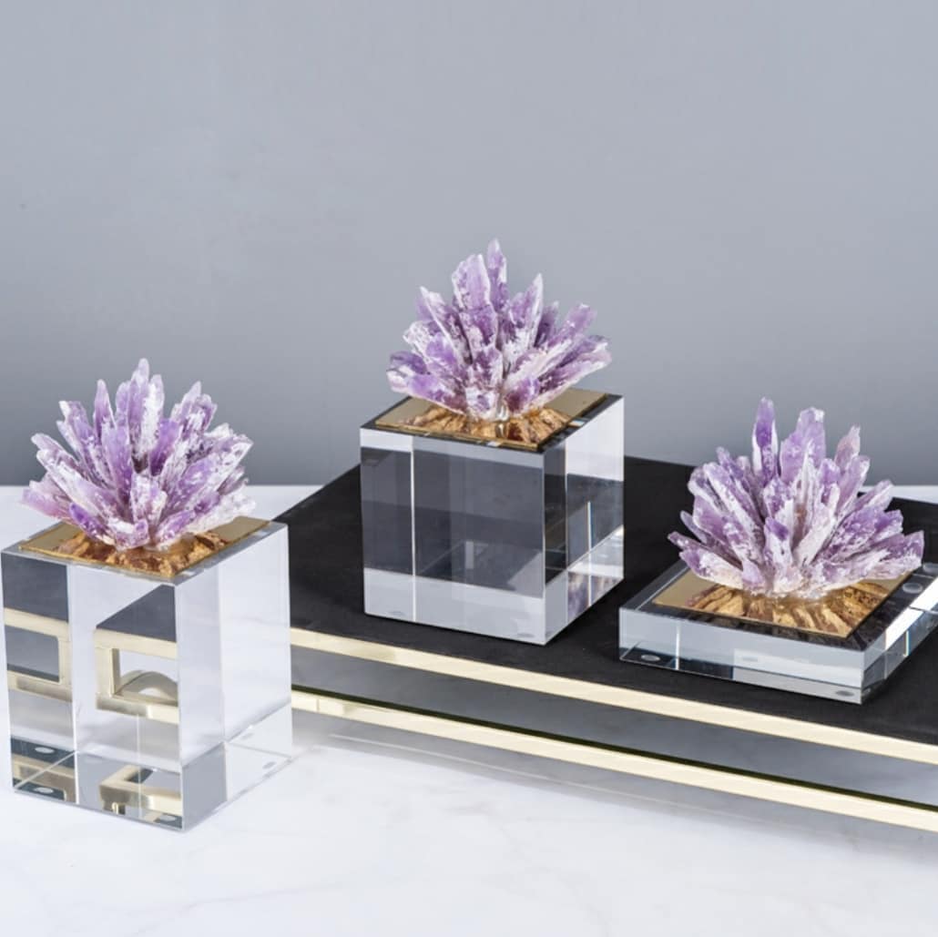Красота натуральных, отборных кристаллов аметиста, селенита и флюорита – в роскошном декоре Monsterior Gems. Подставка – стекло, латунь.
