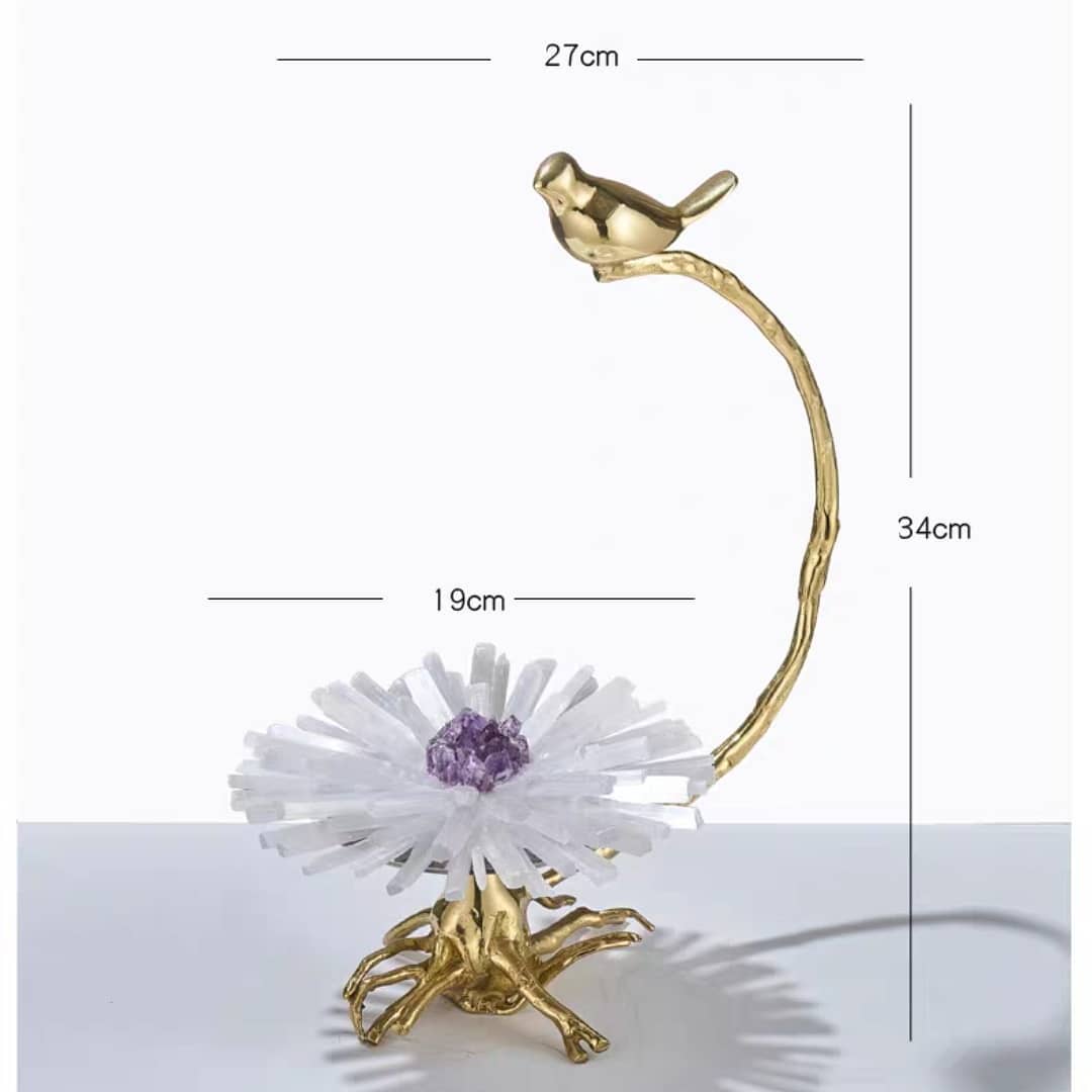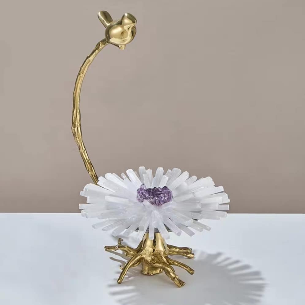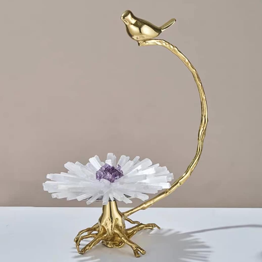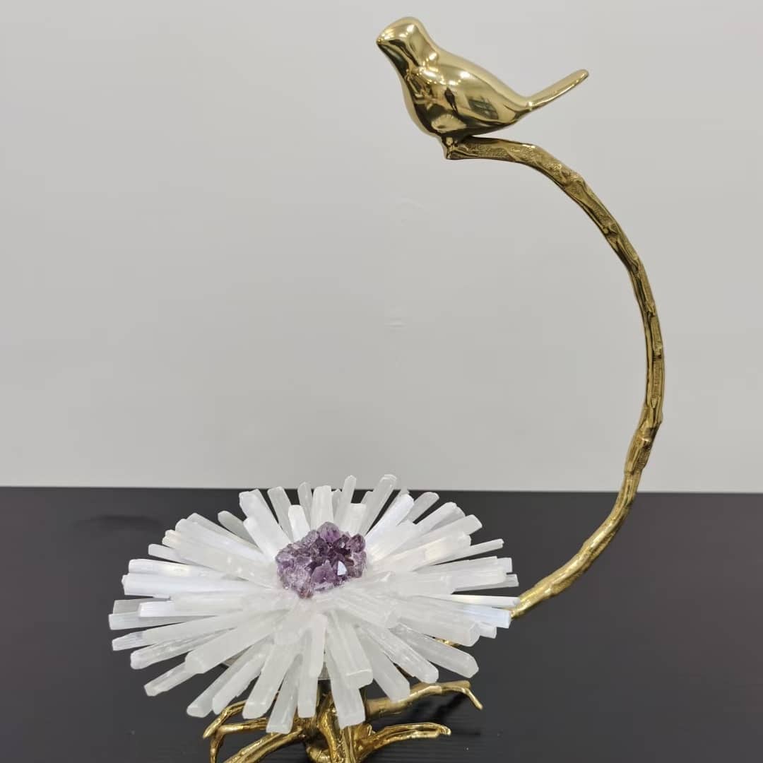 Статуэтка Экзотический цветок из кристаллов горного хрусталя и аметиста на ветке латуни с птичкой