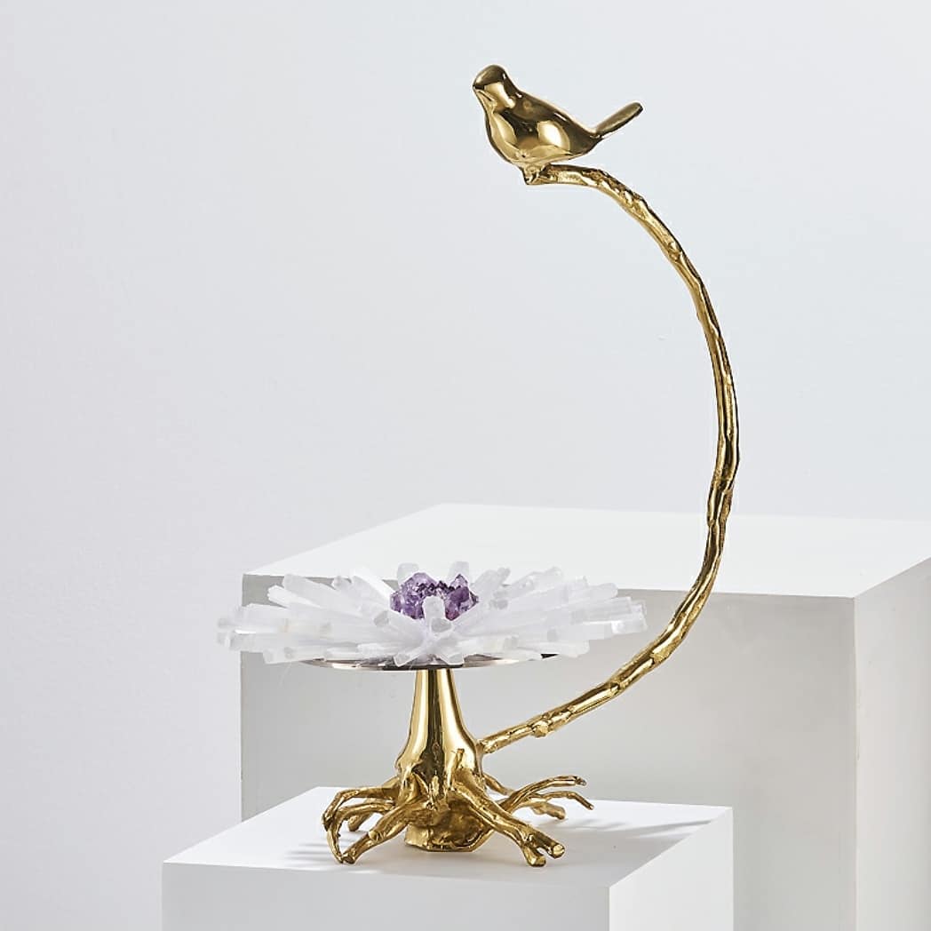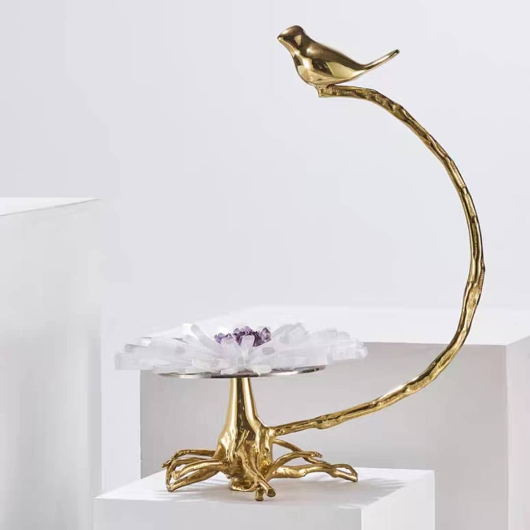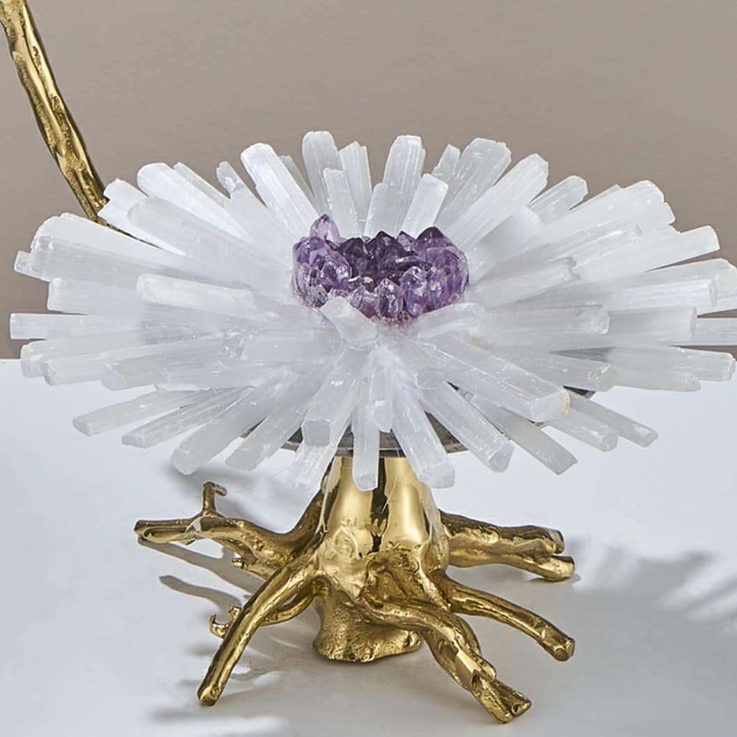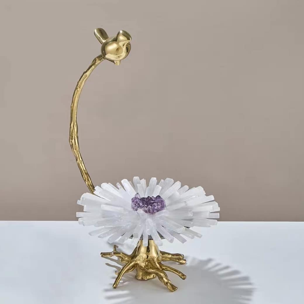 Статуэтка Экзотический цветок из кристаллов горного хрусталя и аметиста на ветке латуни с птичкой
