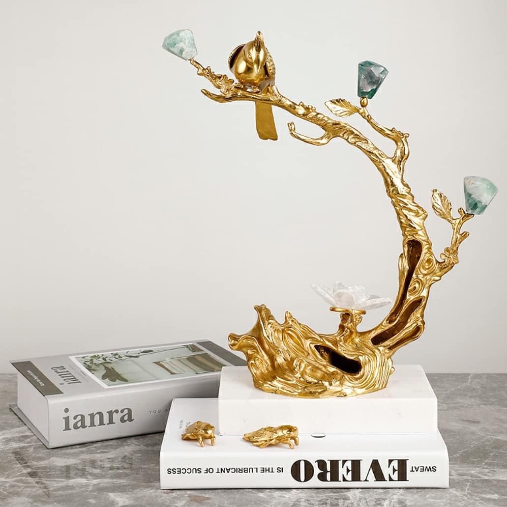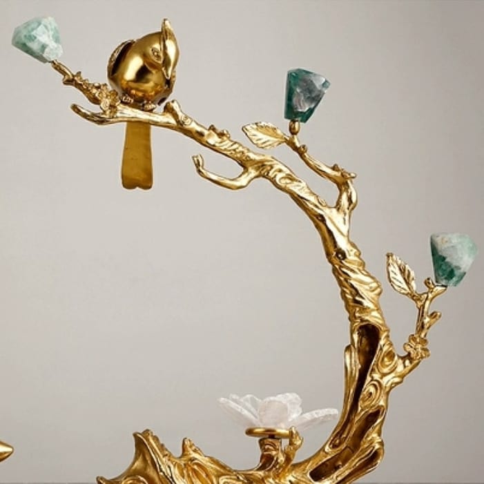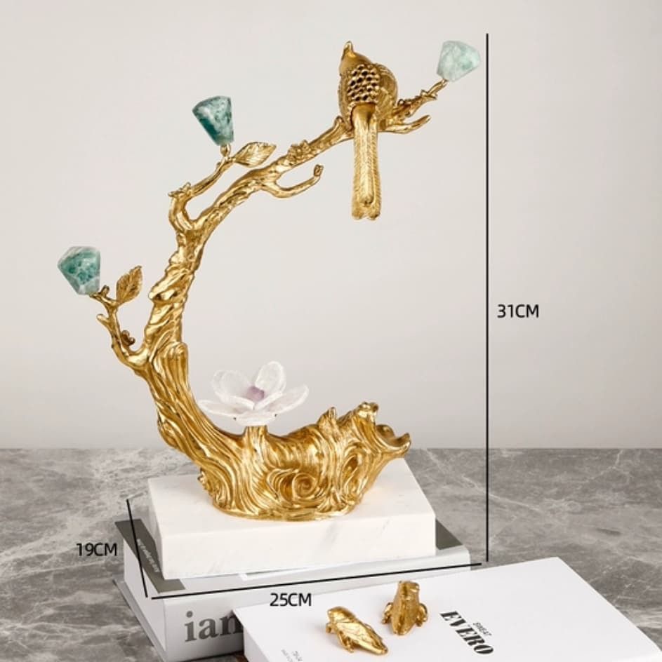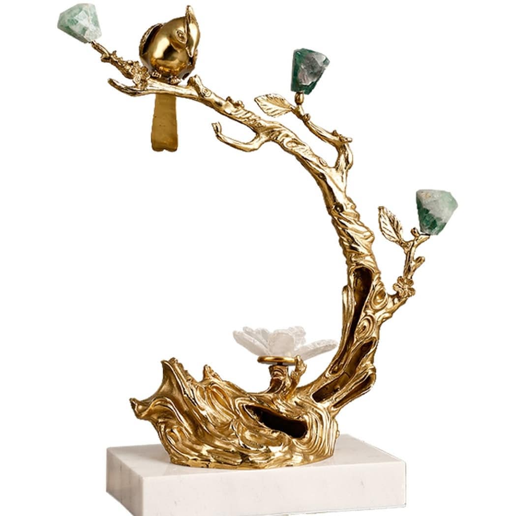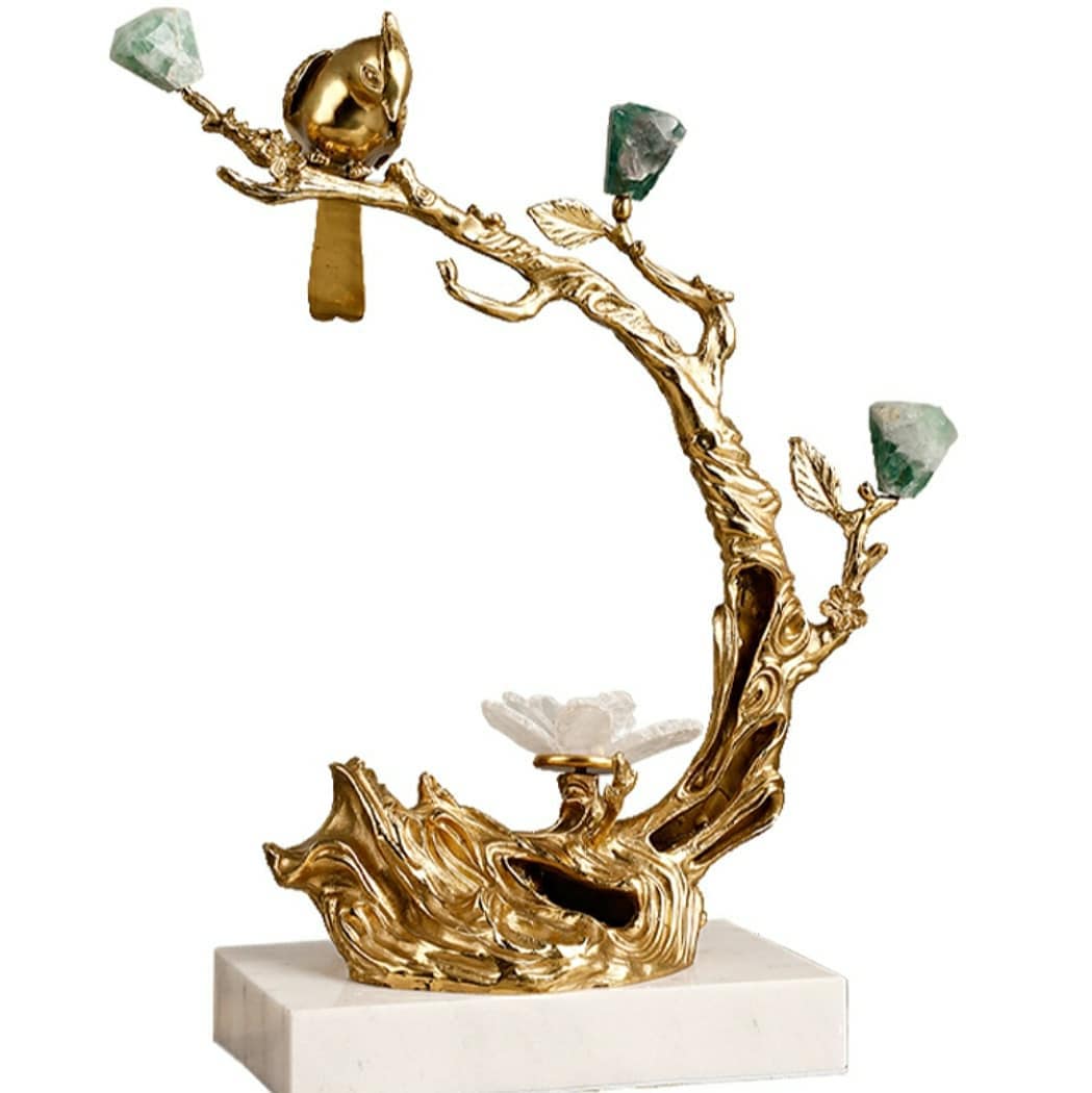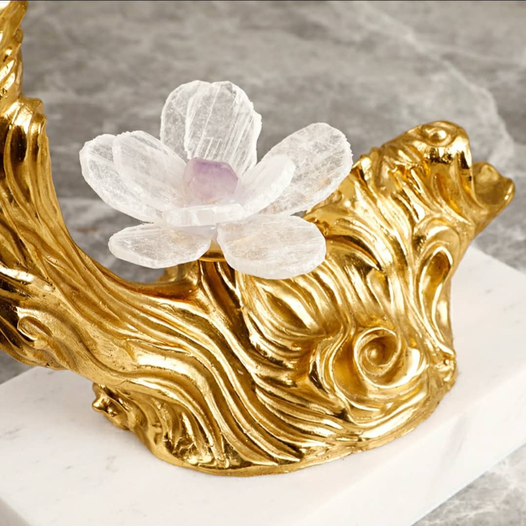 Романтическая композиция из благородной латуни, флюорита, аметиста, кварца и мрамора. Очаровательный декор, который украсит интерьер – домашний или рабочий, и добавит в жизнь позитивных эмоций и хорошего настроения.