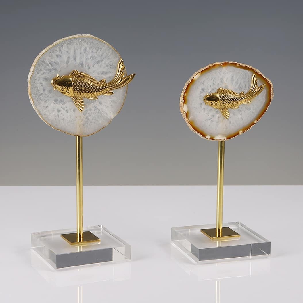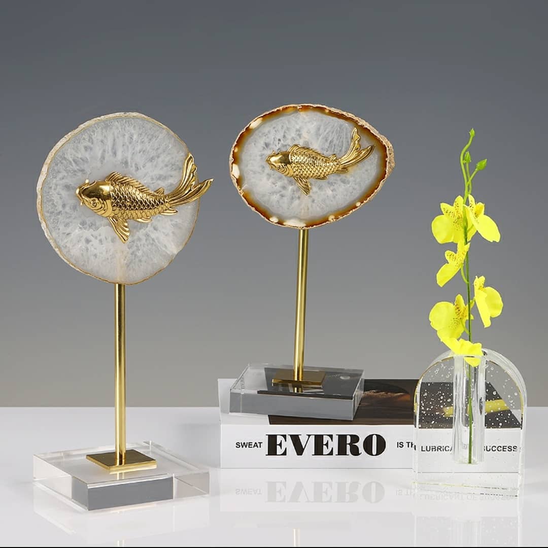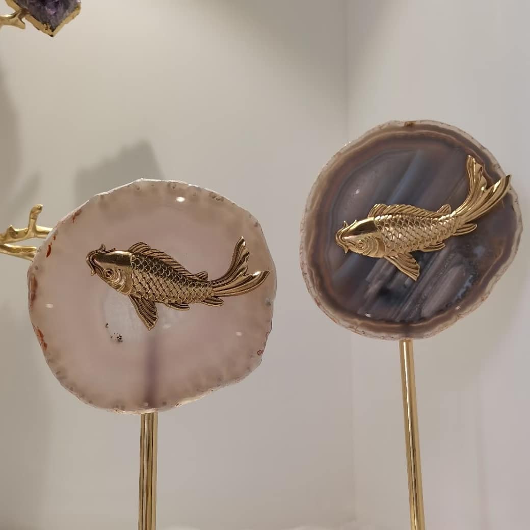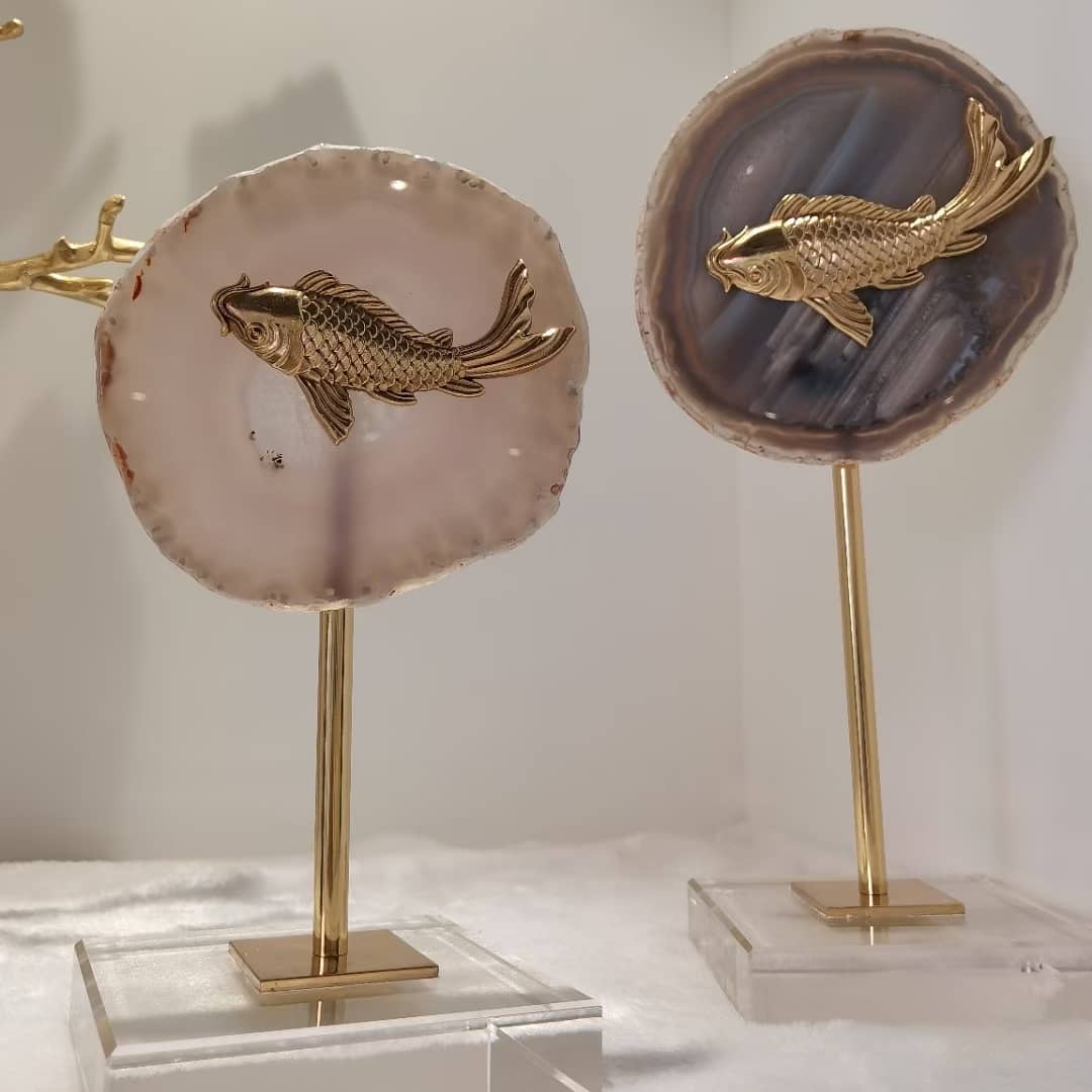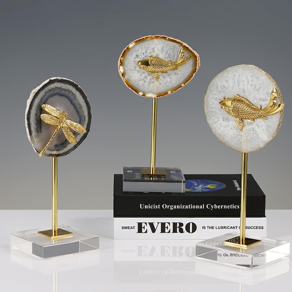 Аккуратные срезы агаты и благородная латунь – основа изящного декора, которым обязательно стоит побаловать себя. Яркие рыбки и стрекозки в сочетании с самоцветами – подарят позитивные эмоции и помогут качественно переключить сознание во время работы. Просто поставьте их на рабочий стол, на полочку, и пространство немного изменится, расширится. И новые продуктивные идеи обязательно вдохновят вас.