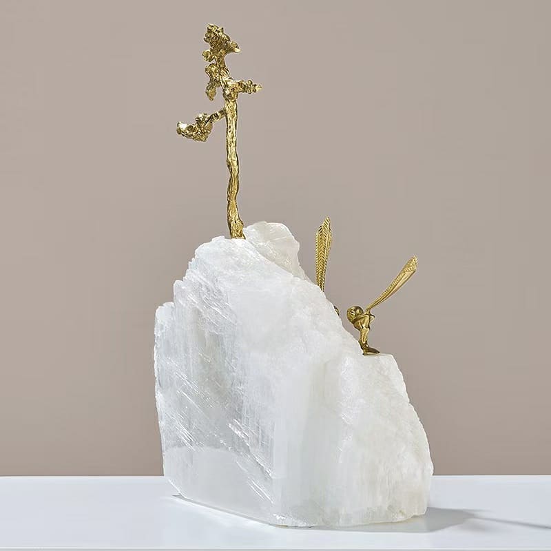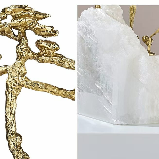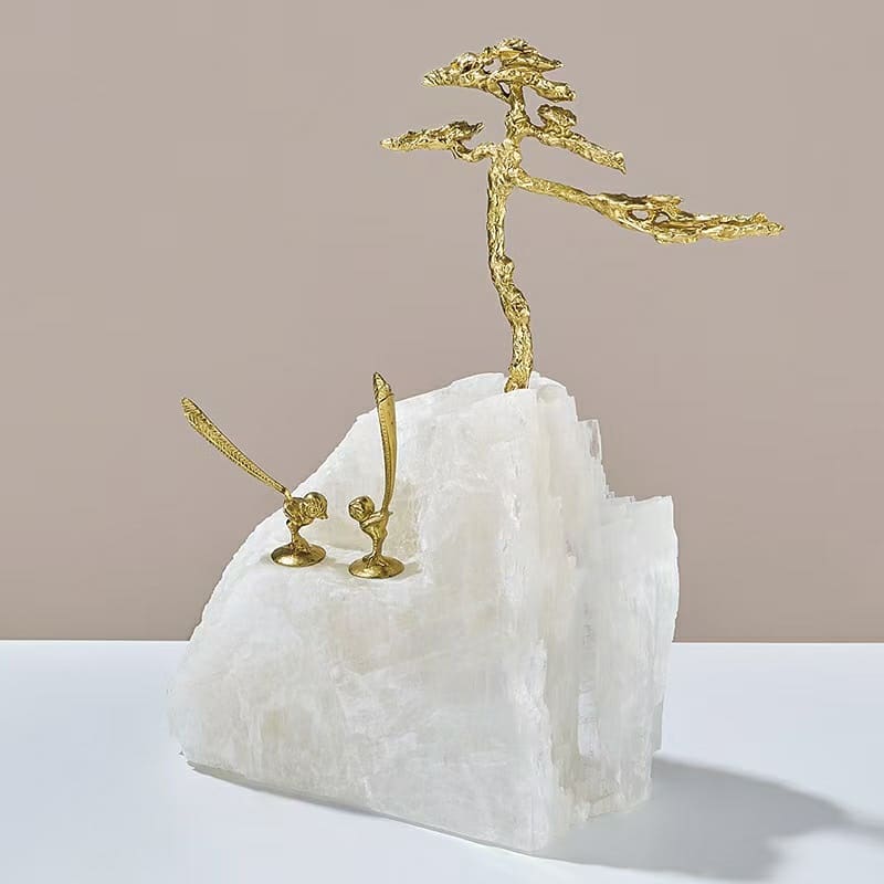 Яркая композиция из натурального белоснежного кварца и благородной латуни. Сосна на скале, как вечный сюжет восточной поэзии, и две птички, обсуждающие какие-то важные новости.