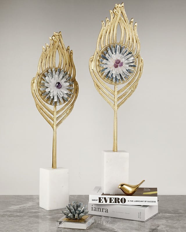 Статуэтка Павлинье перо с кристаллами селенита, горного хрусталя и аметиста на мраморной подставке