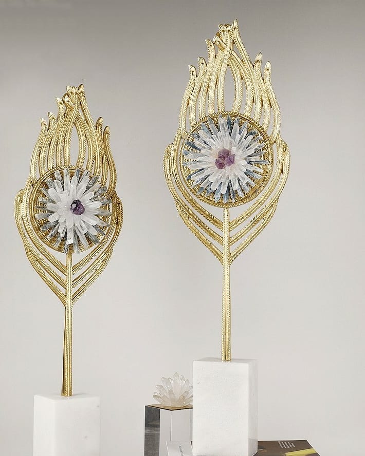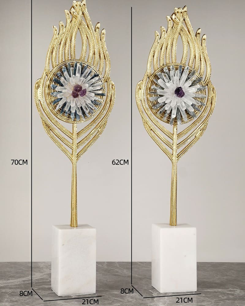 Роскошный декор, в котором моментально узнается прекрасное, сверкающее павлинье перо – символ неземной красоты и бессмертия. Благородная латунь и натуральные отборные кристаллы – селенита, горного хрусталя и аметиста. Великолепное украшение для самых разных столиков, полочек и т.д. Подойдет как для домашнего, так и для делового интерьера.