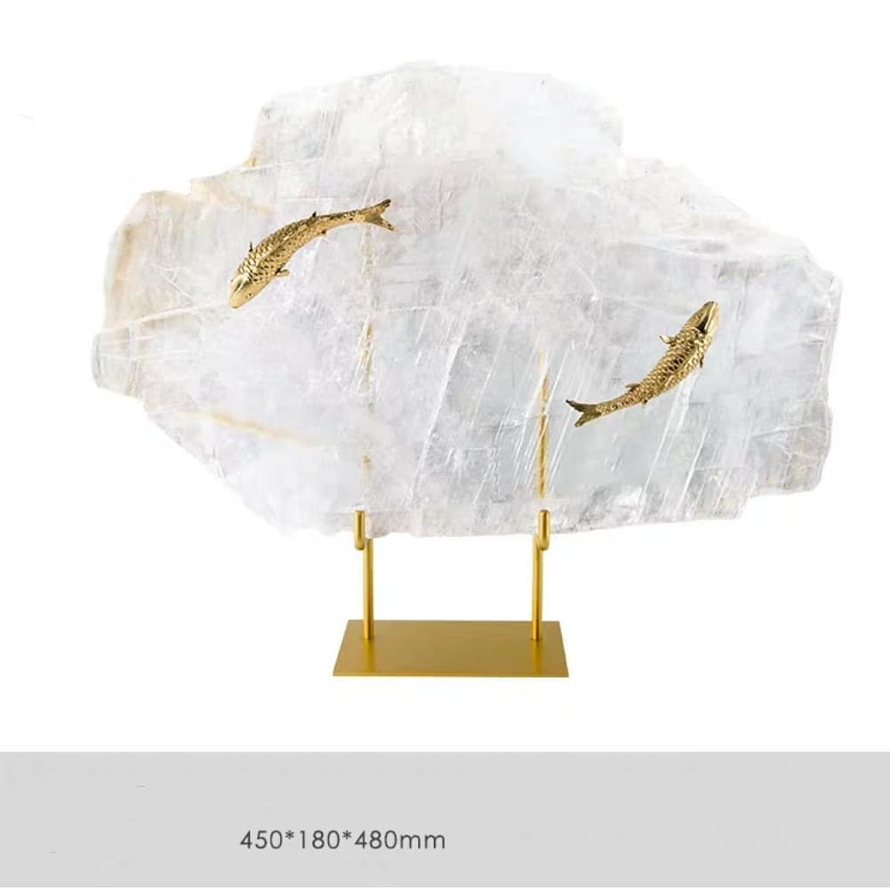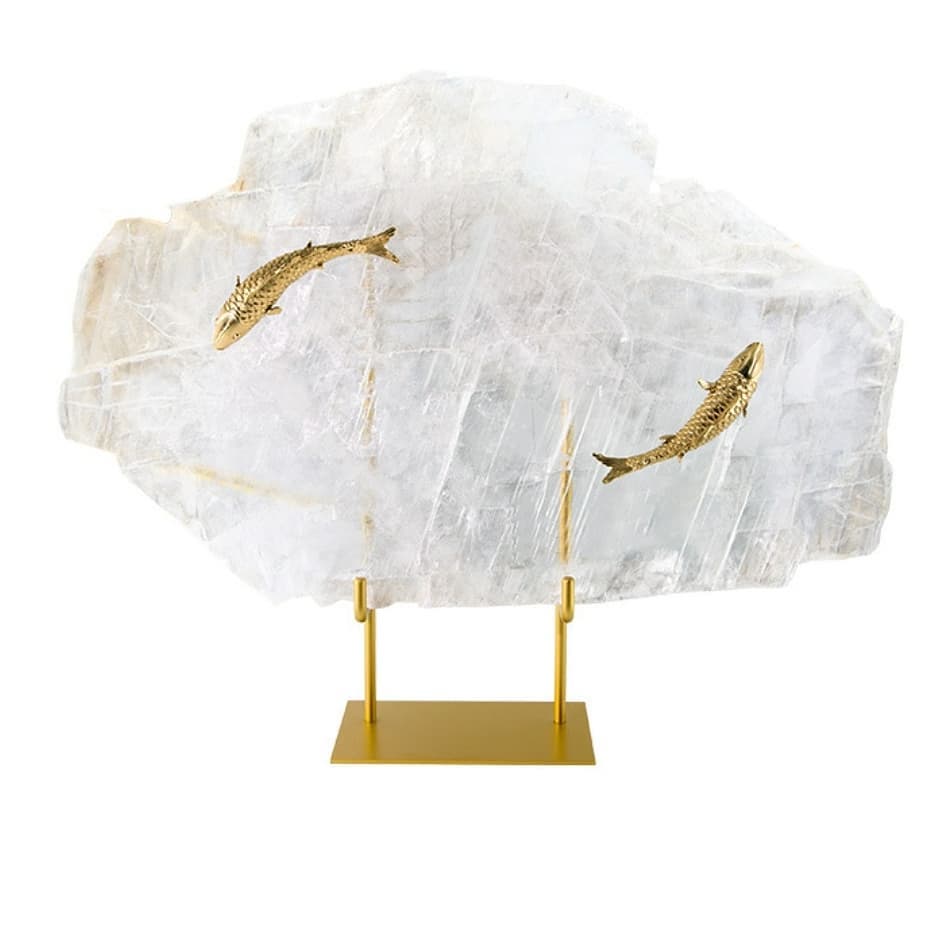 Прекрасные рыбки из блестящей латуни, в зодиакальном символизме, словно совершают вечное круговое вращение друг за другом. Массивный отборный кварц, символизирующий чистую воду. Оригинальная подставка. И всё это – шикарный декор, который украсит домашний и (или) рабочий интерьер не только представителям этого знака Зодиака.
