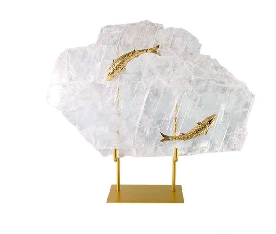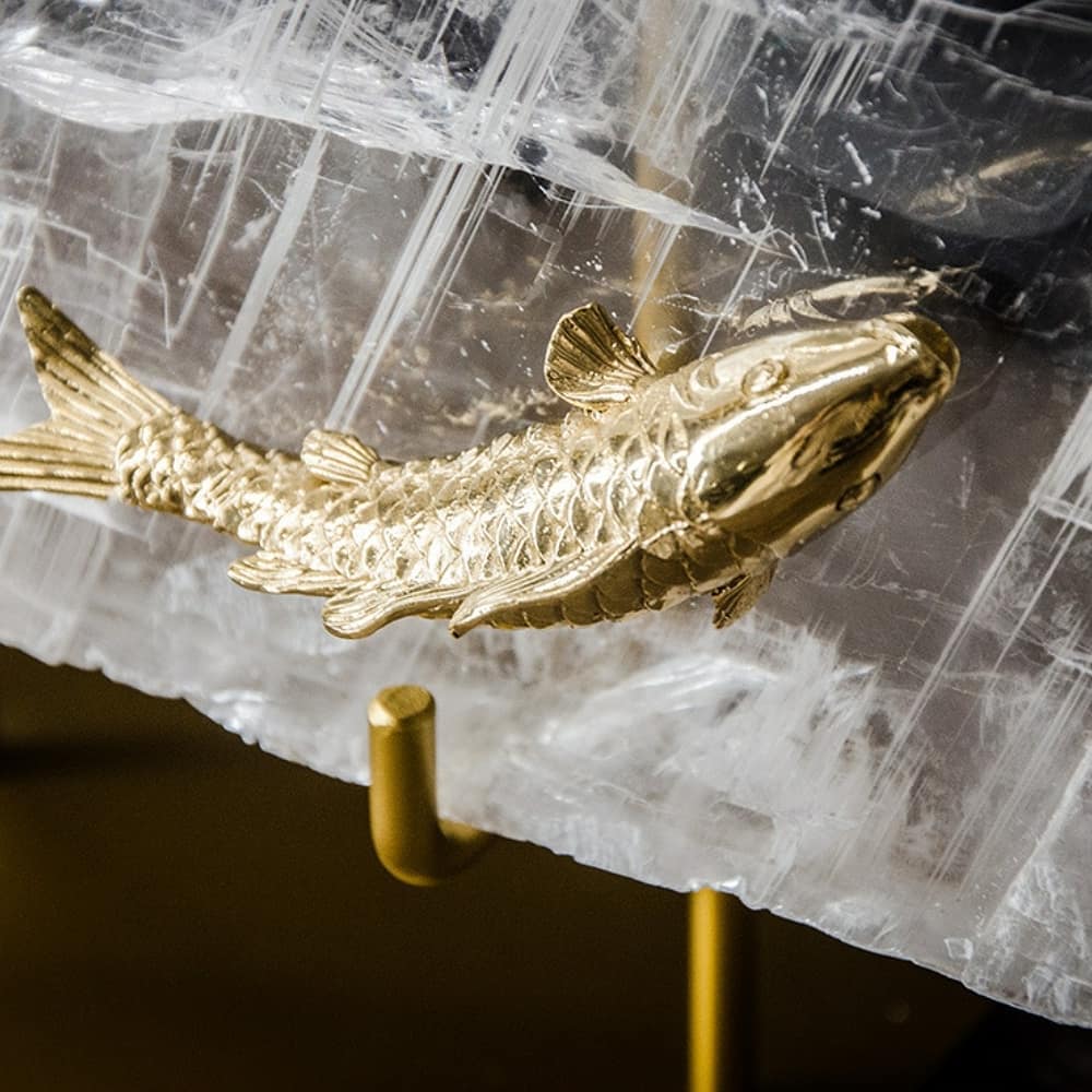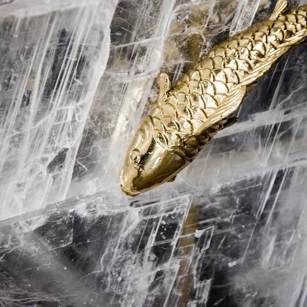 Прекрасные рыбки из блестящей латуни, в зодиакальном символизме, словно совершают вечное круговое вращение друг за другом. Массивный отборный кварц, символизирующий чистую воду. Оригинальная подставка. И всё это – шикарный декор, который украсит домашний и (или) рабочий интерьер не только представителям этого знака Зодиака.