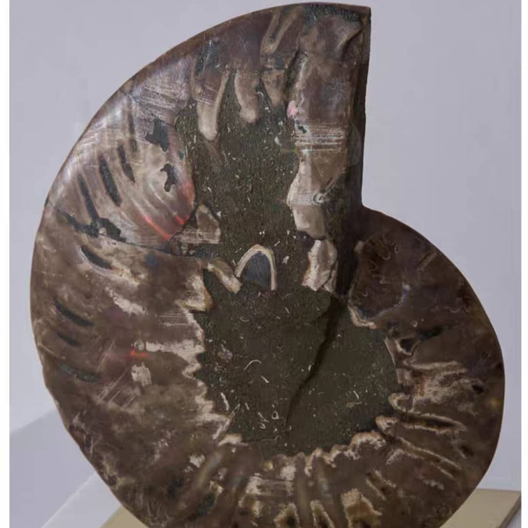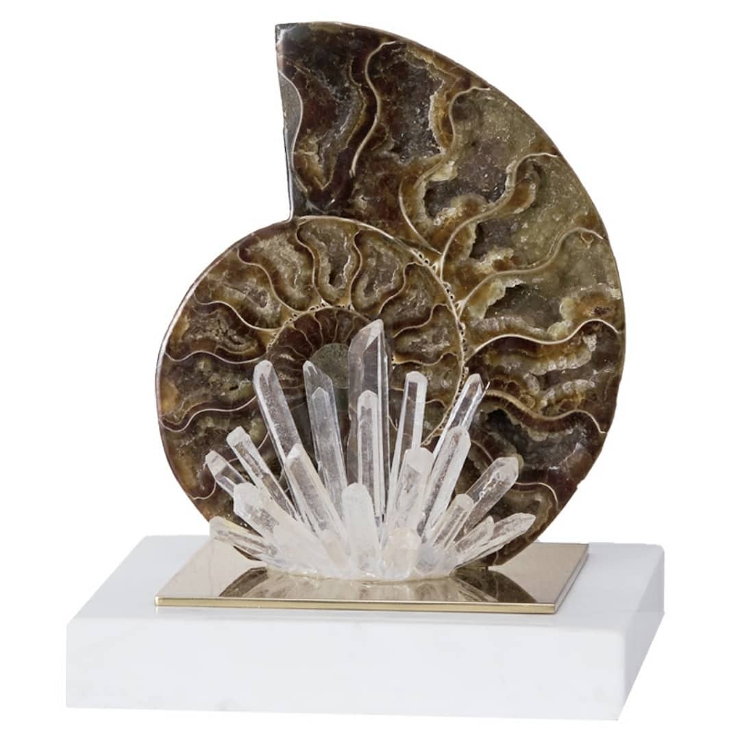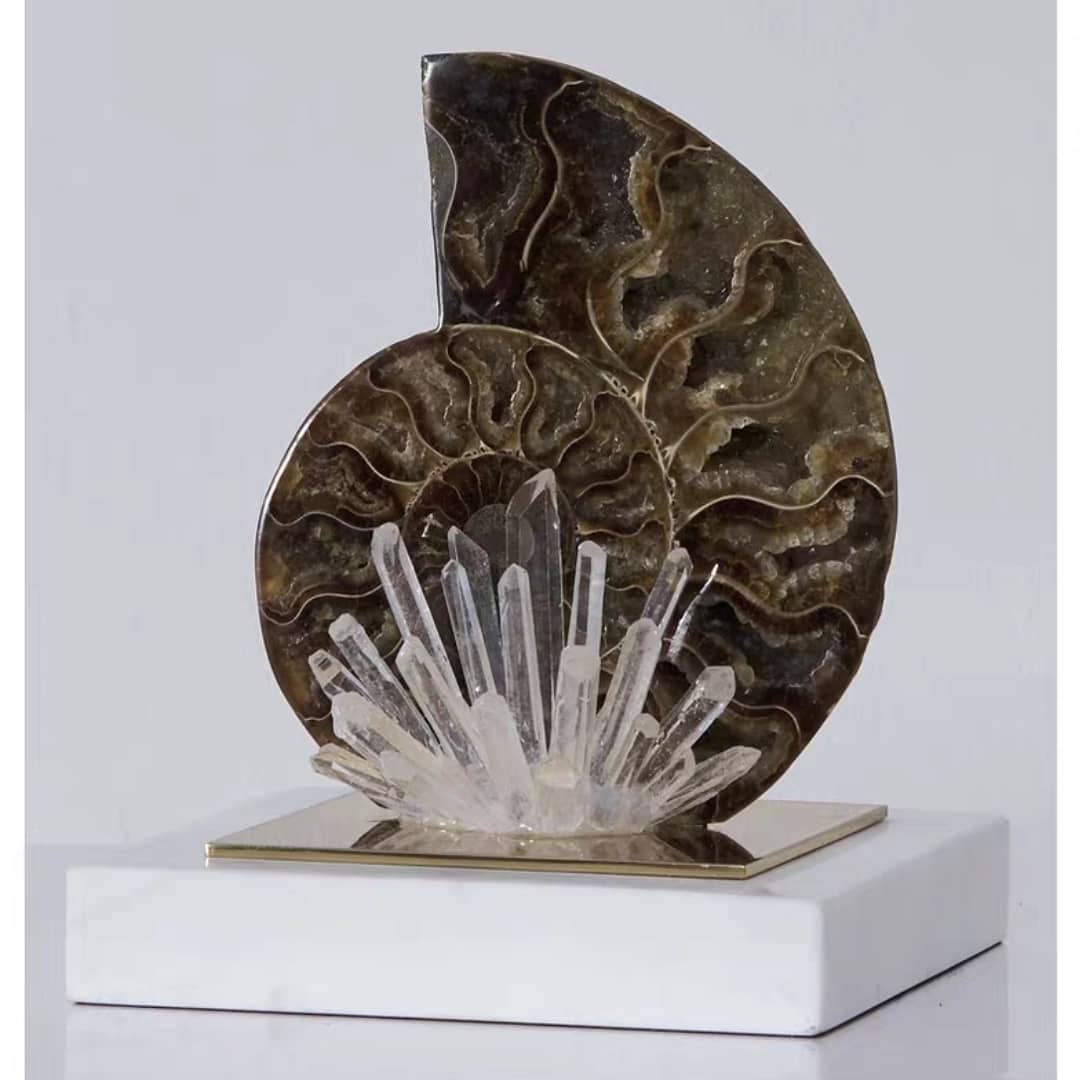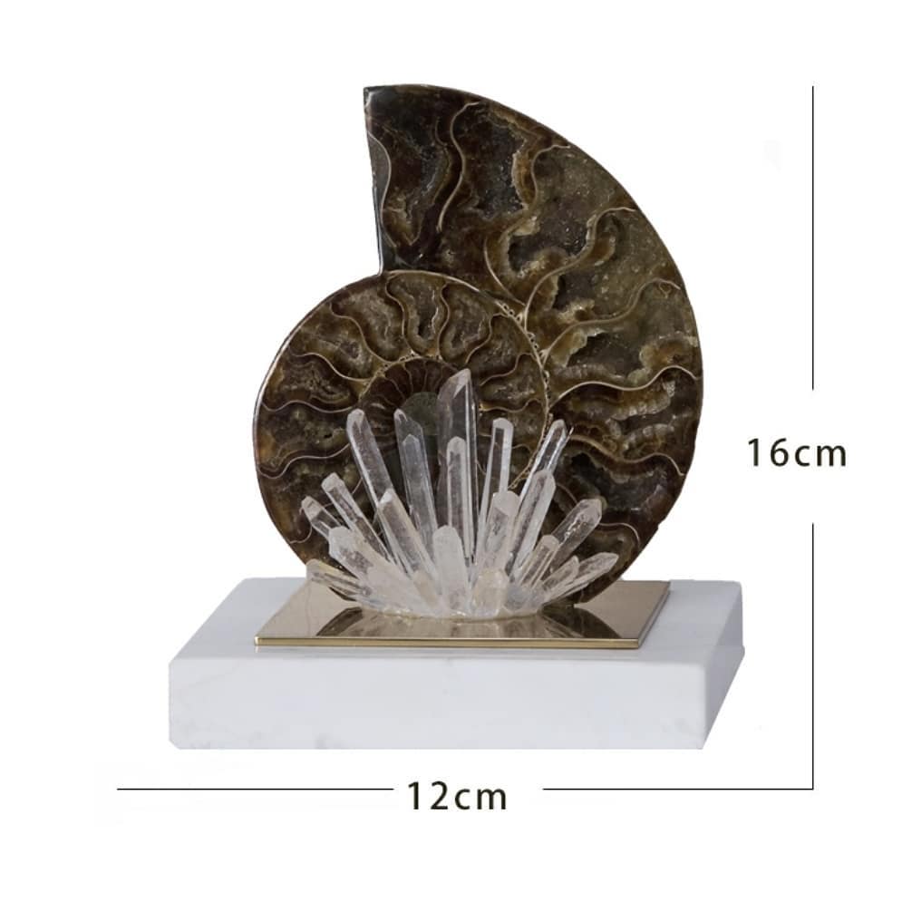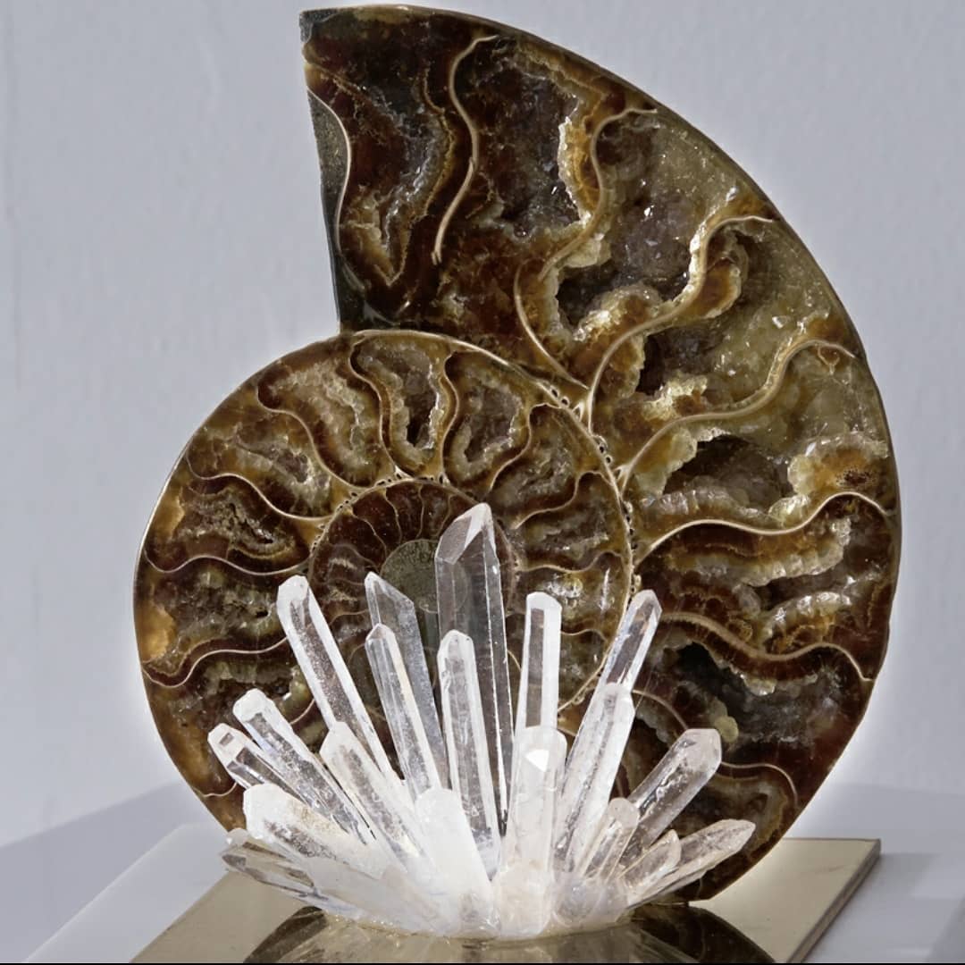 Роскошная мономорфная раковина настоящего аммонита, чем возраст запределен – от 45 до 400 млн лет. Отборные кристаллы чистейшего горного хрусталя – минерала, который всегда остается холодным. Натуральный, белоснежный мрамор. Благородная латунь. И всё это вместе – потрясающий, роскошный декор, с глубоким символическим смыслом, который напрямую касается смысла жизни. Спираль, разделенная на сектора, словно на жизненные этапы развития личности, и одновременно – единая, неразрывная! И всё это подсознательно ощущается и даже переживается человеком, даруя различные прозрения.