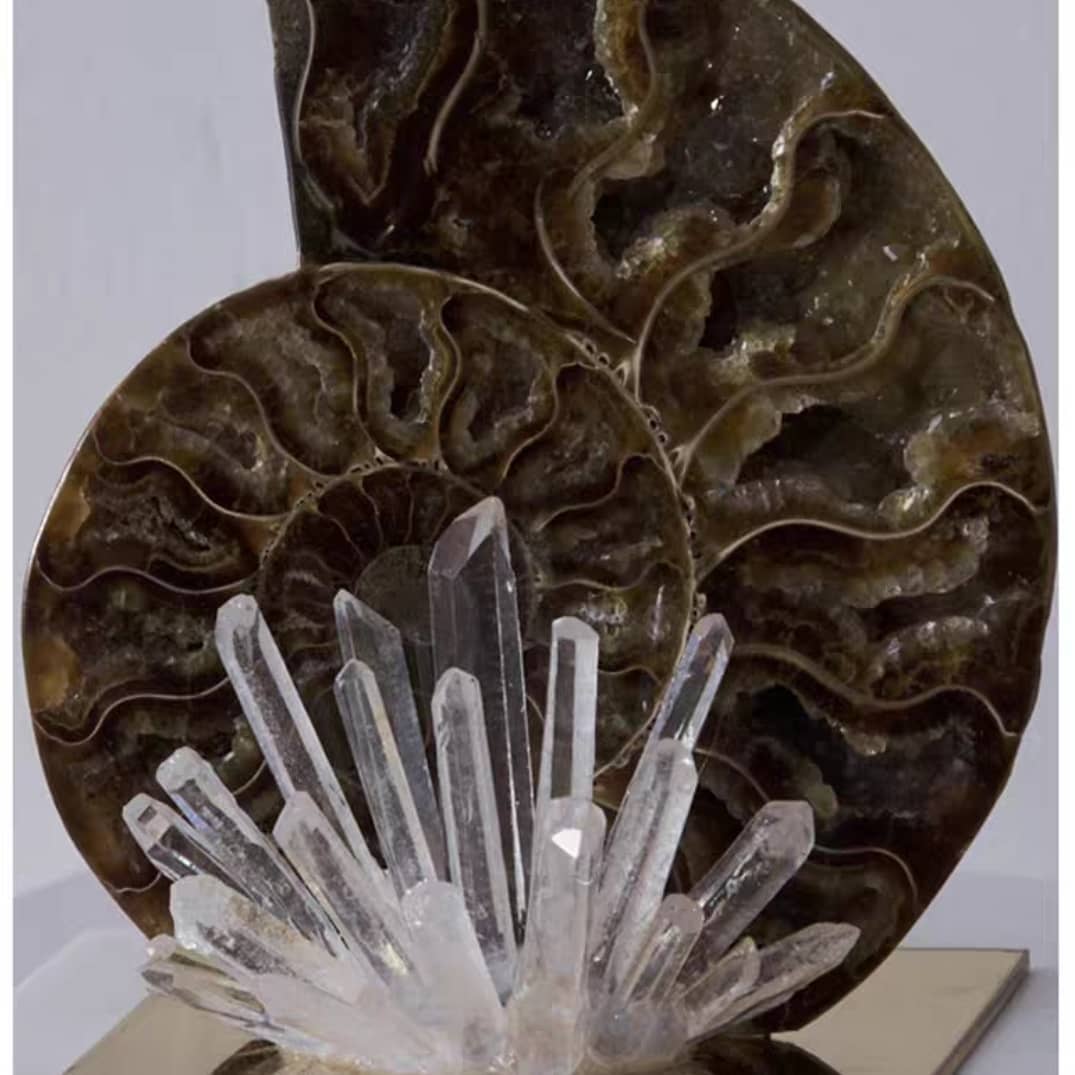 Статуэтка Раковина аммонита с кристаллами горного хрусталя правая на подставке