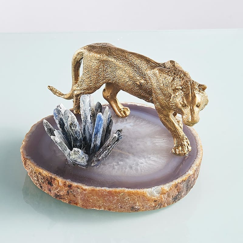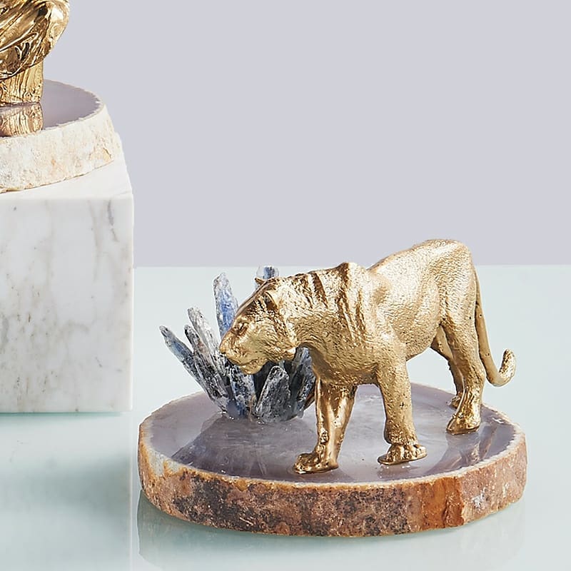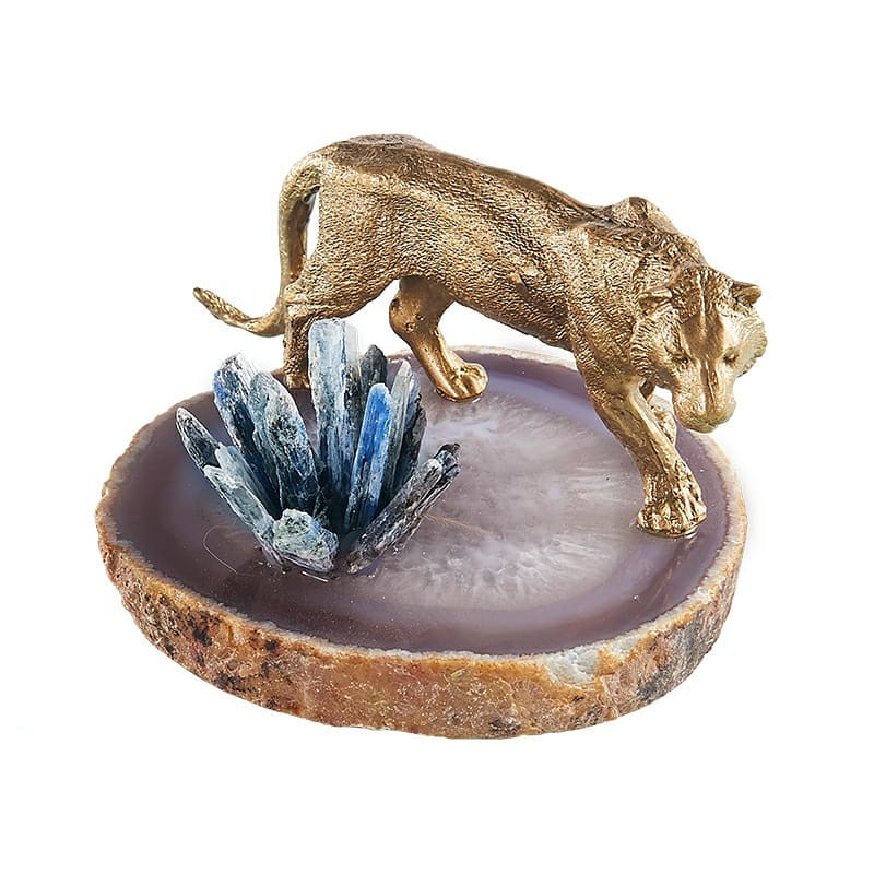 Статуэтка Тигр с кристаллами селенита на срезе агата