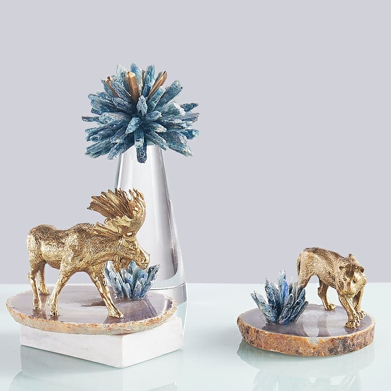 Роскошный лось и величественный тигр – из латуни, натуральные кристаллы селенита, подставки – из среза отборного агата. Отличные новинки нашей серии «кристаллического» декора. Яркие композиции для украшения домашнего и (или) коммерческого интерьера.