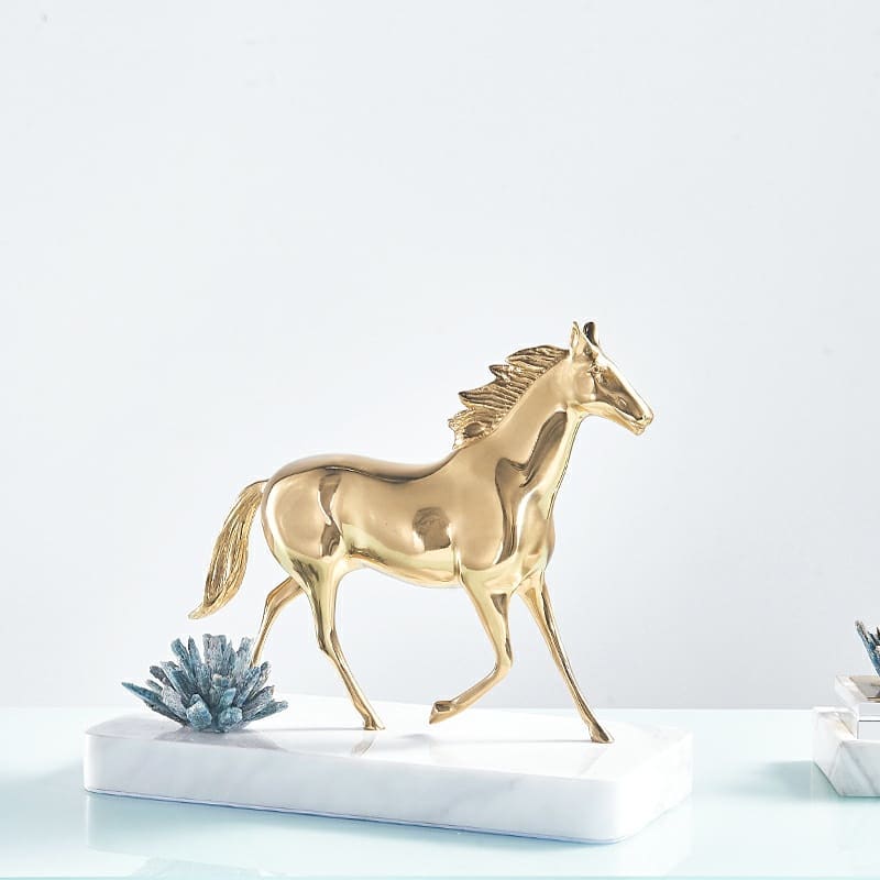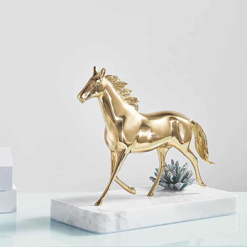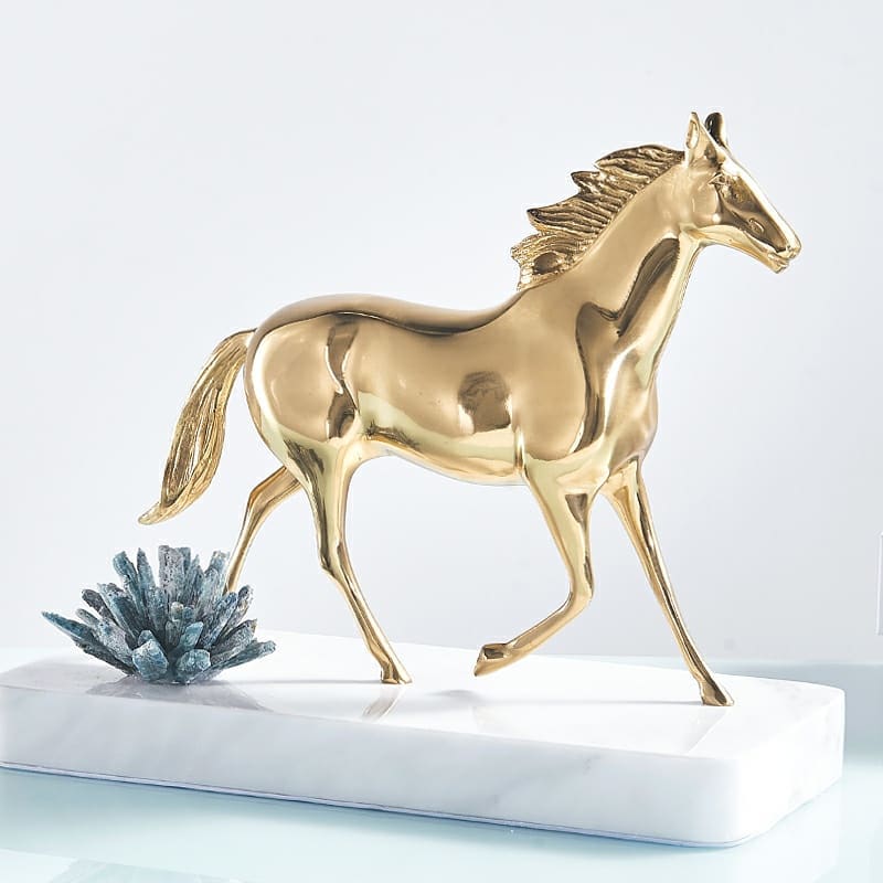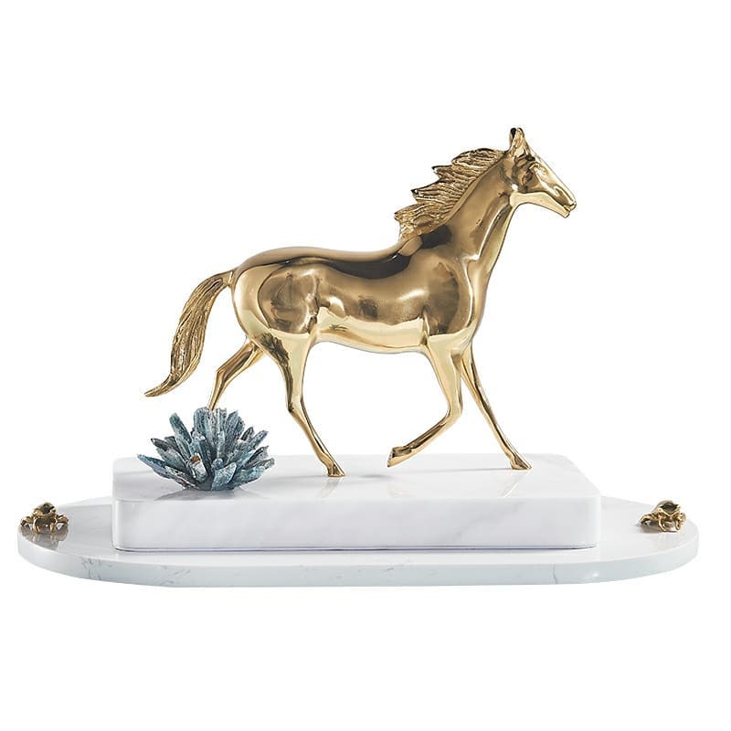 Изящная лошадка из благородной латуни на белоснежном мраморе, натуральные кристаллы селенита. Яркая композиция, которая добавит в ваш интерьер ещё больше красоты и роскоши. Отличный декор для домашнего и (или) делового интерьера.