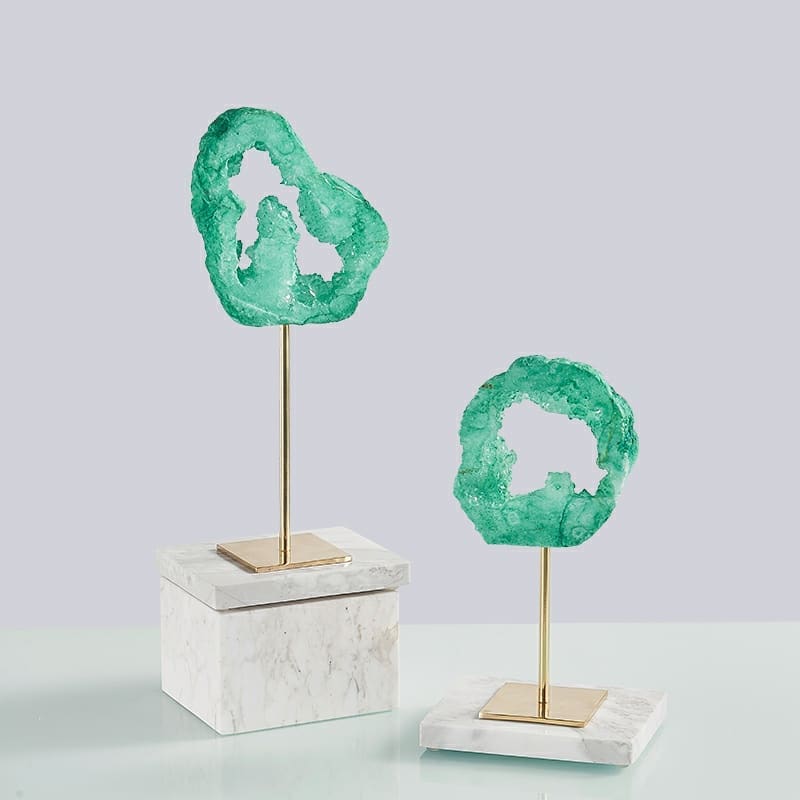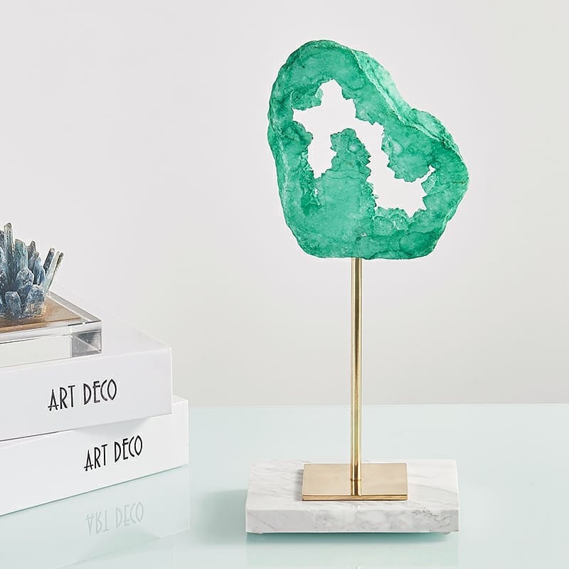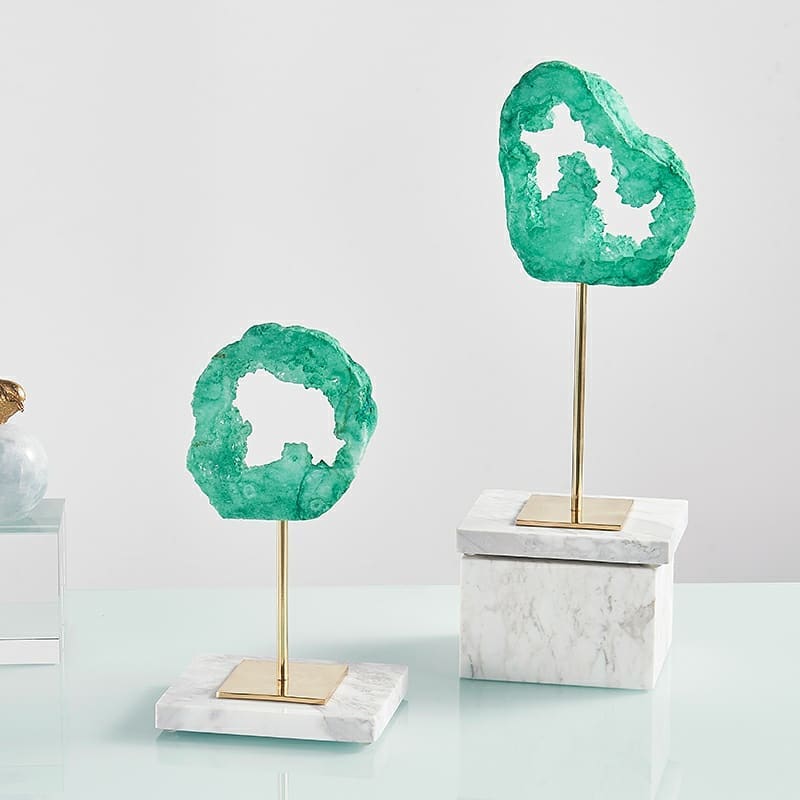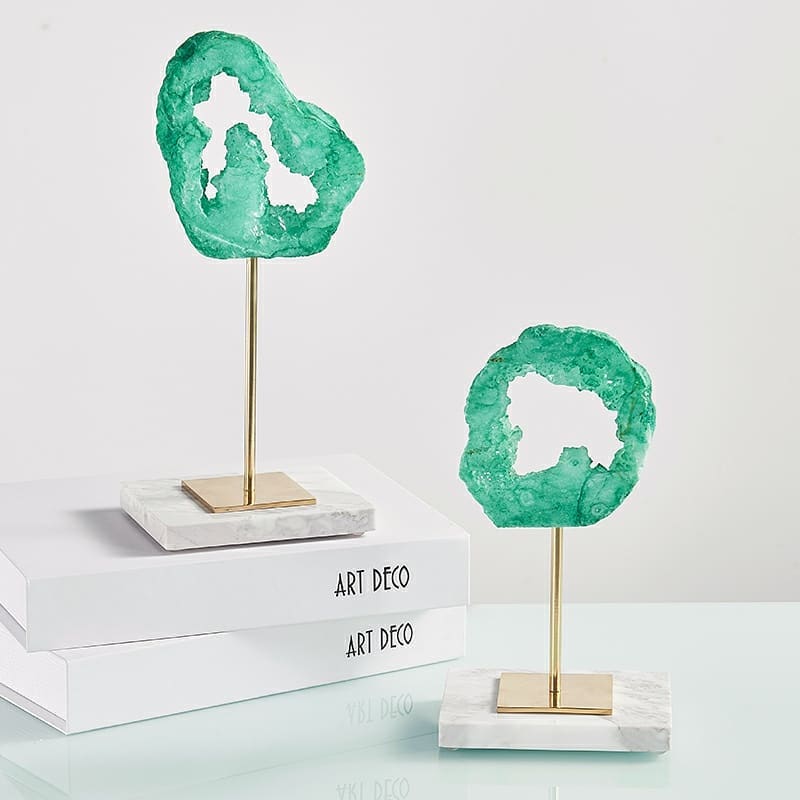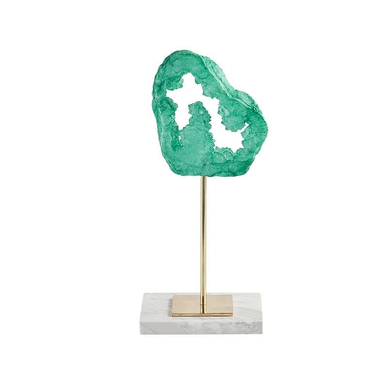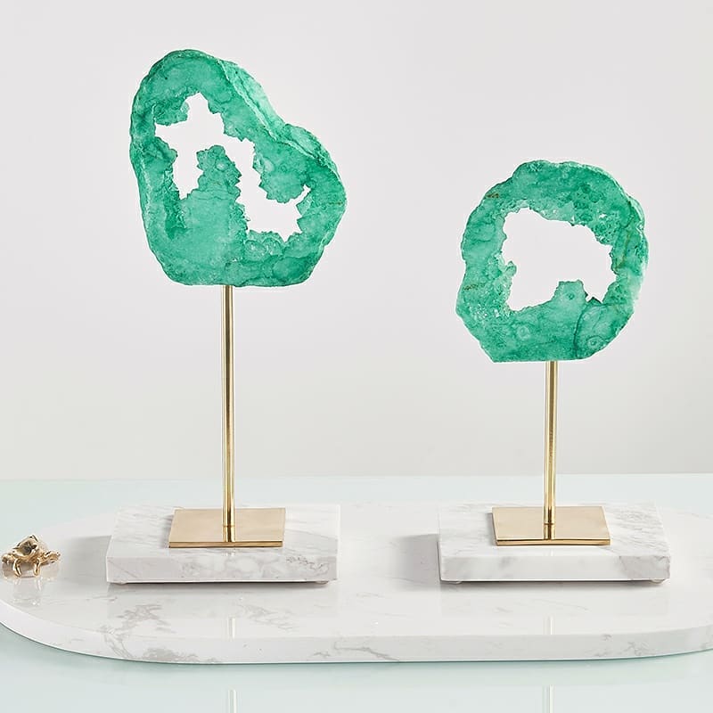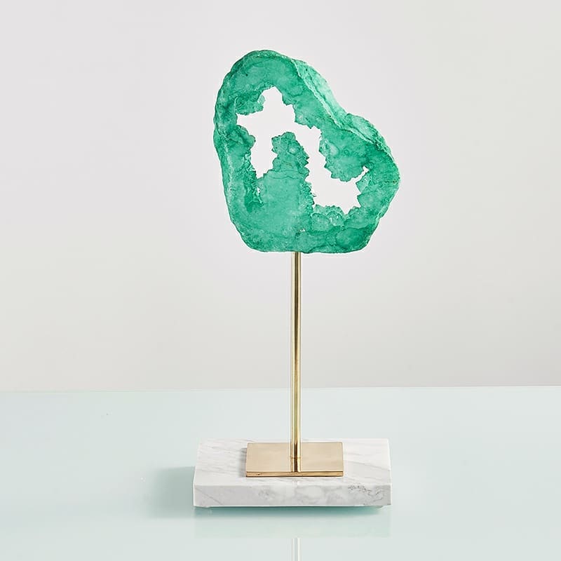 Жеода зелёного флюорита, срезы, благородная латунь и подставка из белоснежного мрамора. Декор для вашего интерьера, который выглядит очень «вкусно»! Чем-то похоже на яркие и прозрачные леденцы на палочках, да. Оригинальная вещь, восприятие которой меняется в зависимости от освещения.