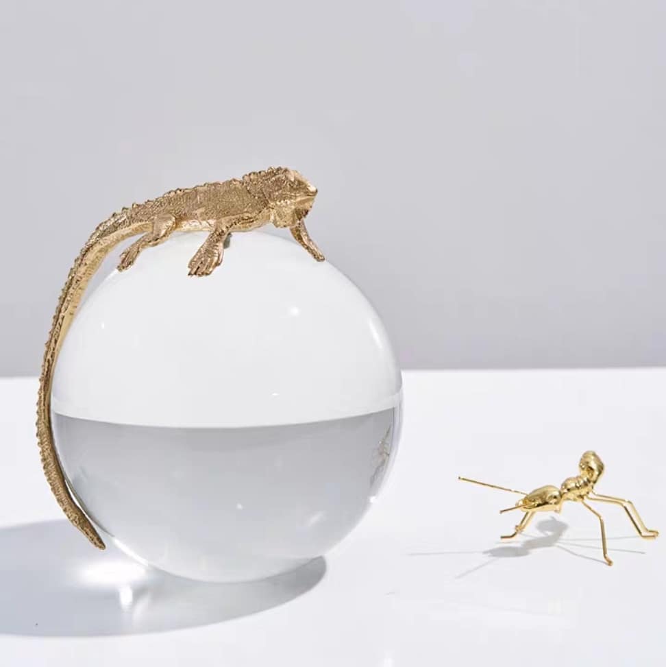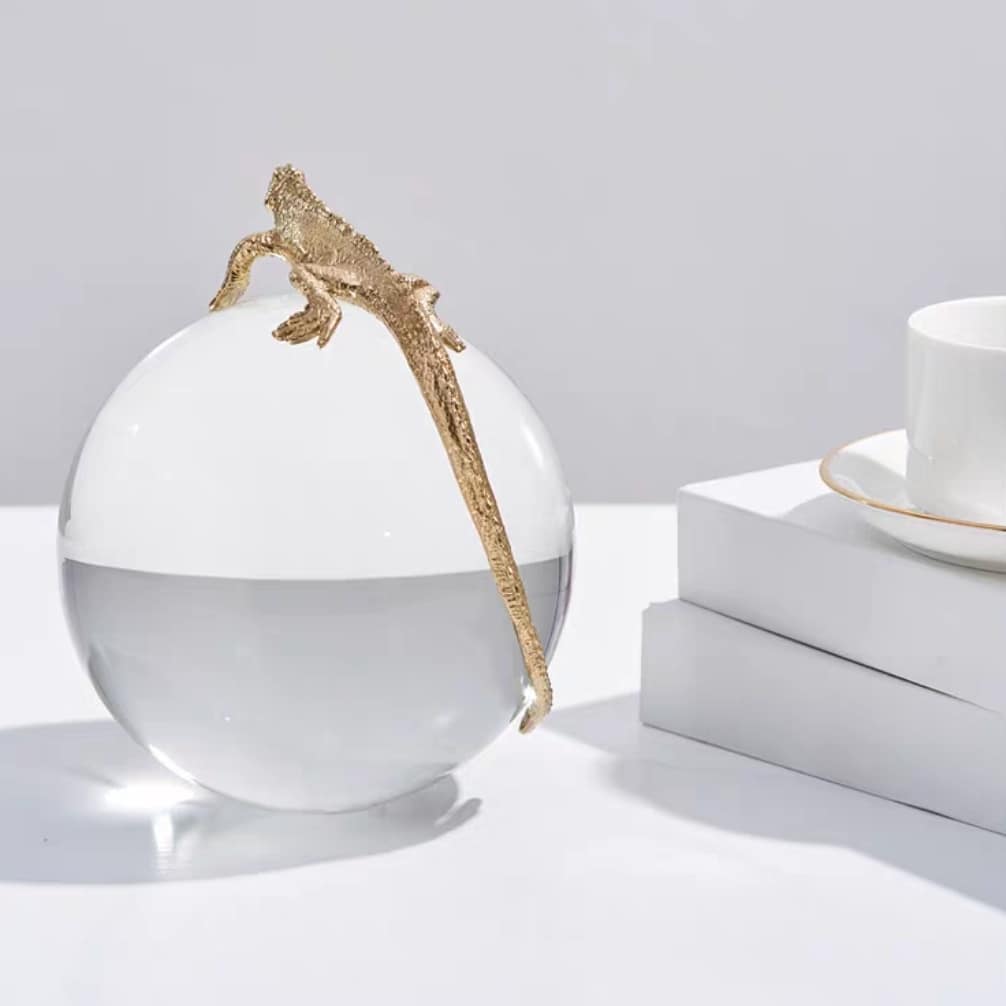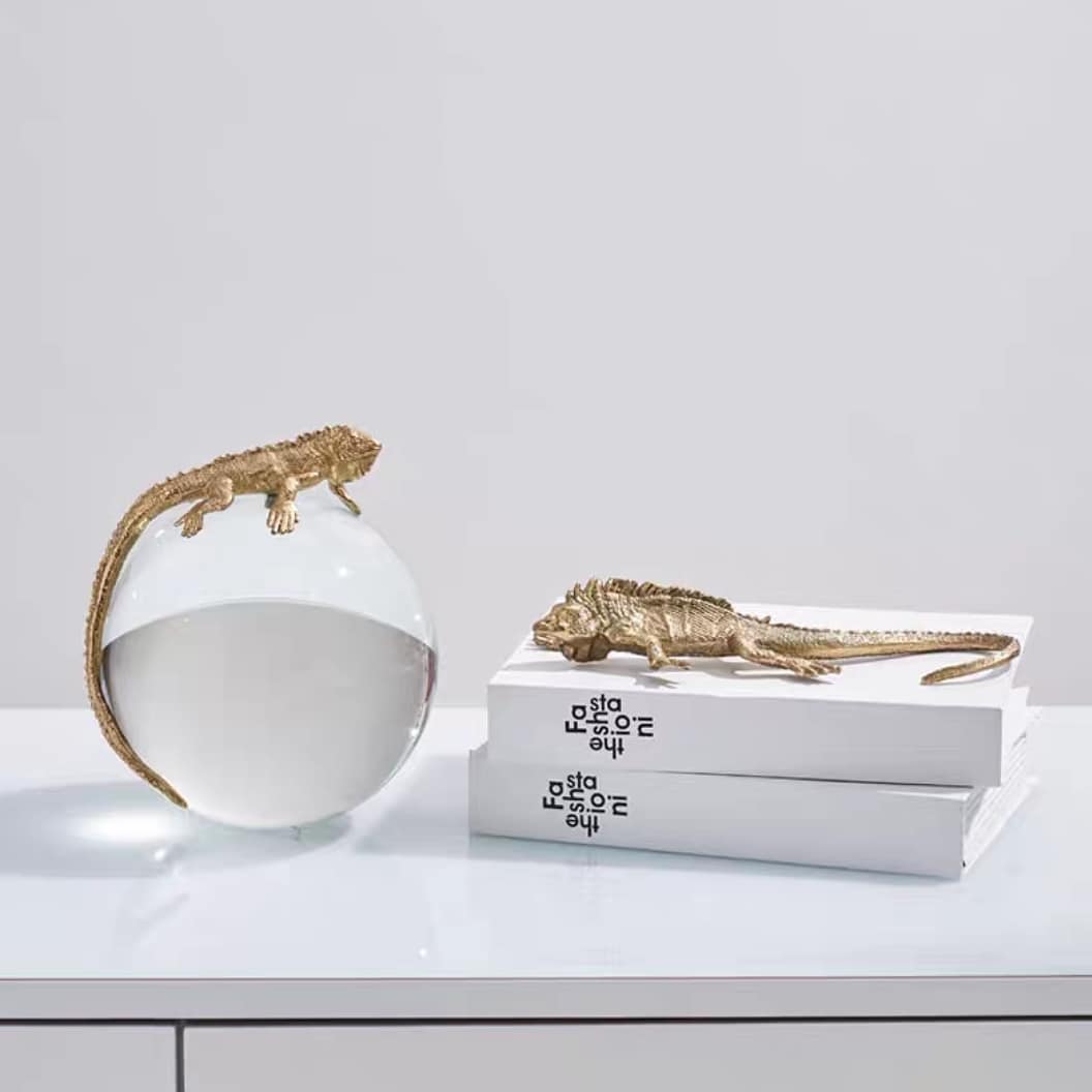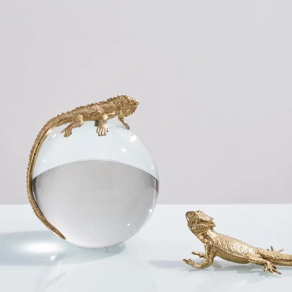 Игуаны похожи на мимимишных, прелестных дракончиков, и многие люди испытывают к ним искренние симпатии, а некоторые даже фанатеют от них. Содержать живую игуану – дело хлопотное, и всем желающим обзавестись ими, предлагаем восхитительный декор в виде двух роскошных игуанок из латуни, одна из которых восседает на настоящем хрустальном шаре. Выбрав игуану на шаре, вы сможете, заодно, проверить свои мантические способности, заглянув в будущее.