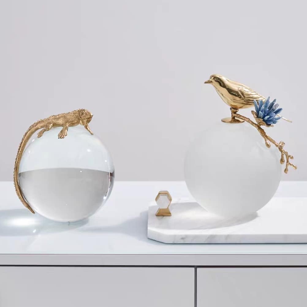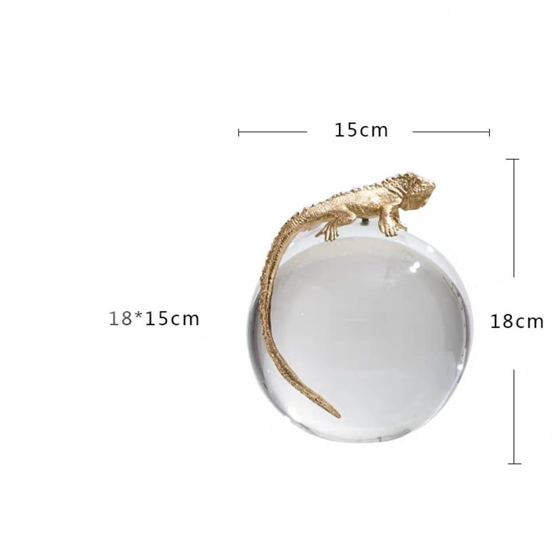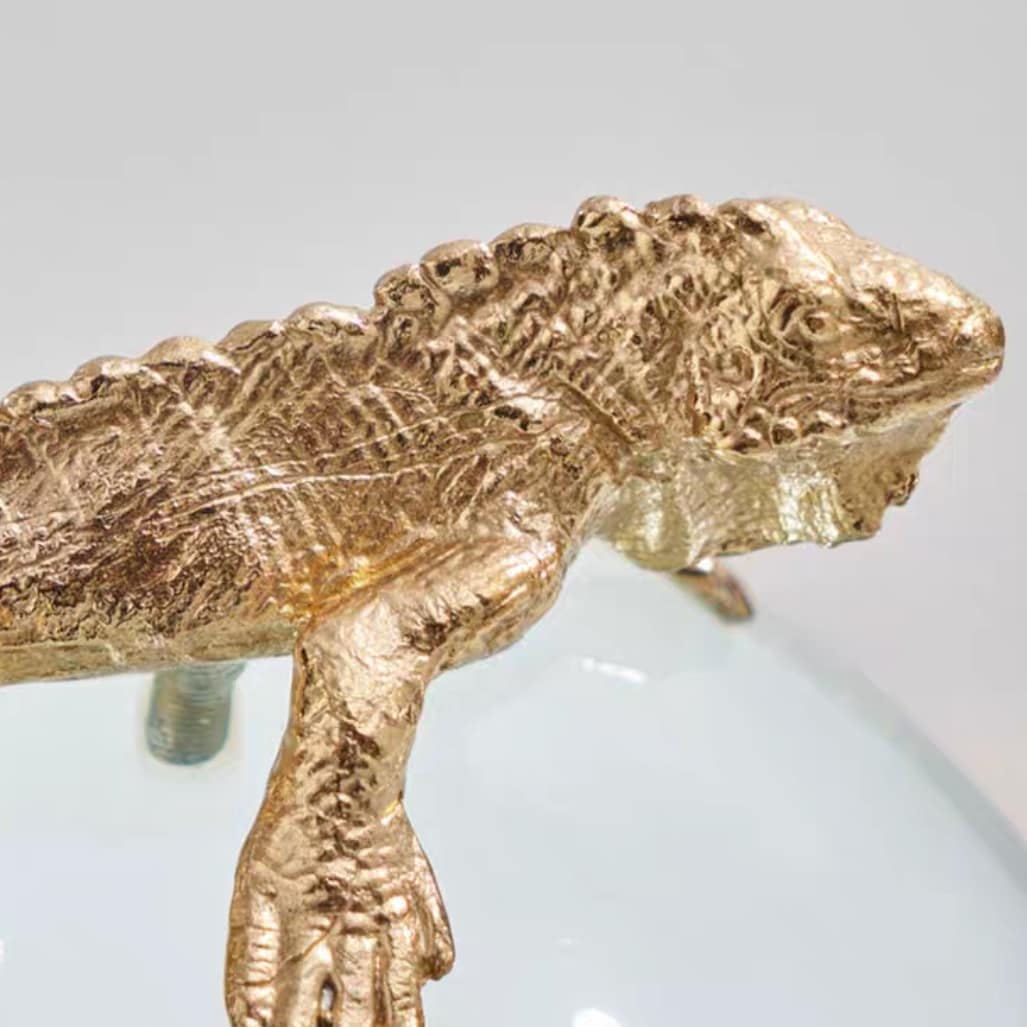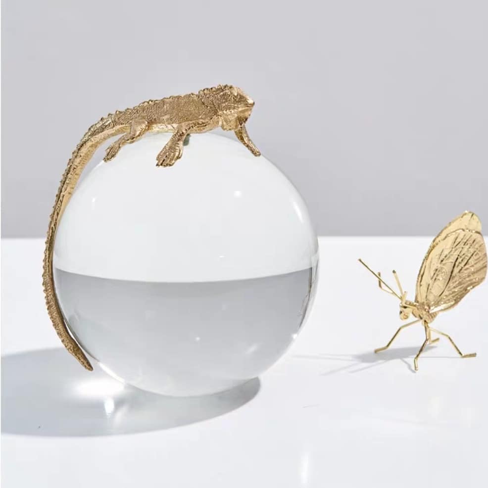 Игуаны похожи на мимимишных, прелестных дракончиков, и многие люди испытывают к ним искренние симпатии, а некоторые даже фанатеют от них. Содержать живую игуану – дело хлопотное, и всем желающим обзавестись ими, предлагаем восхитительный декор в виде двух роскошных игуанок из латуни, одна из которых восседает на настоящем хрустальном шаре. Выбрав игуану на шаре, вы сможете, заодно, проверить свои мантические способности, заглянув в будущее.