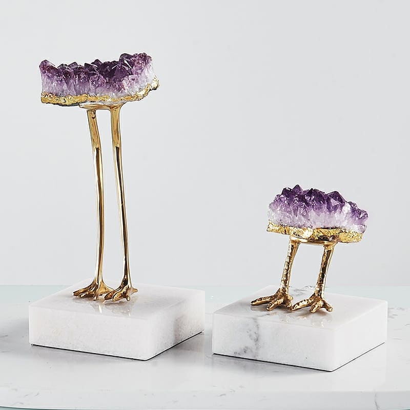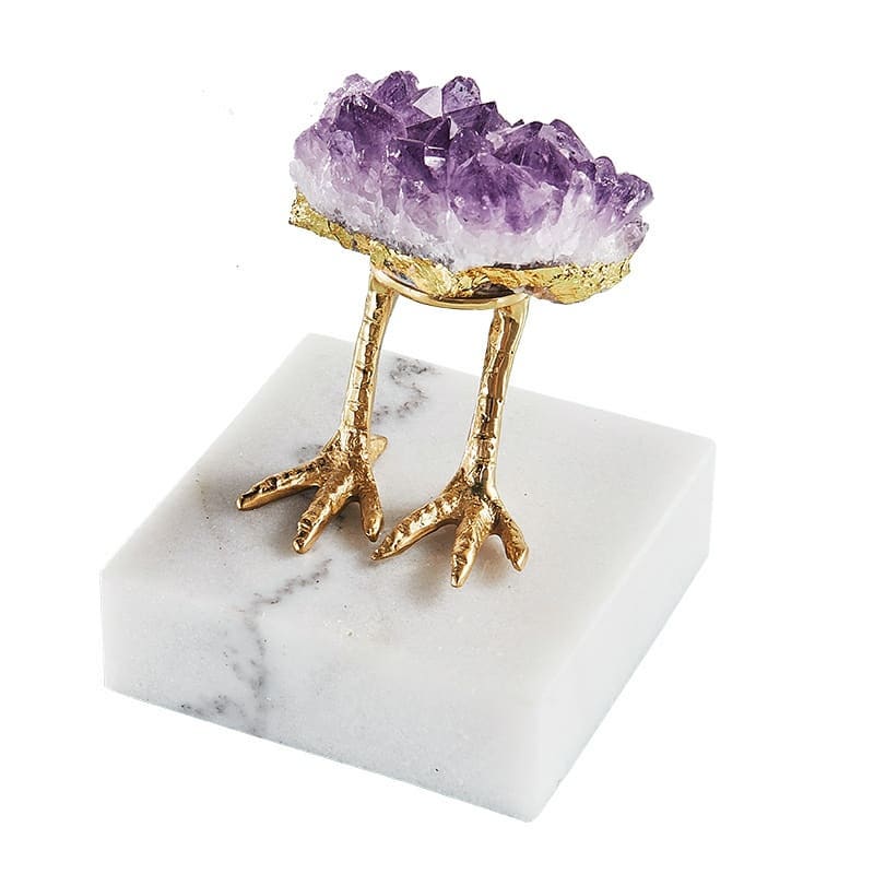 Роскошные, натуральные друзы аметиста, на латунно-куриных (и не только!) ножках. Наверное, где-то в других – параллельных мирах, самоцветы могут передвигаться самостоятельно, и небольшая их стайка прорвалась к нам, чтобы вдохновить дизайнера на создание такого уникального декора.