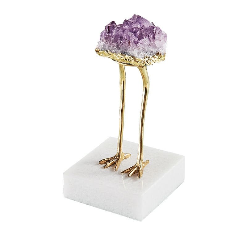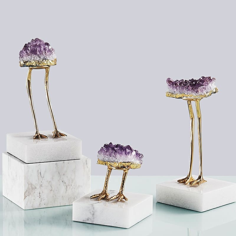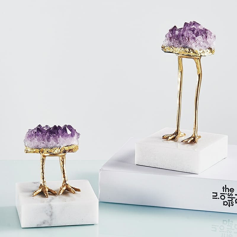 Роскошные, натуральные друзы аметиста, на латунно-куриных (и не только!) ножках. Наверное, где-то в других – параллельных мирах, самоцветы могут передвигаться самостоятельно, и небольшая их стайка прорвалась к нам, чтобы вдохновить дизайнера на создание такого уникального декора.