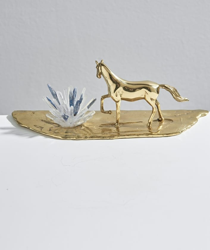Статуэтка Лошадь с кристаллами кианита и селенита на угловой подставке из латуни