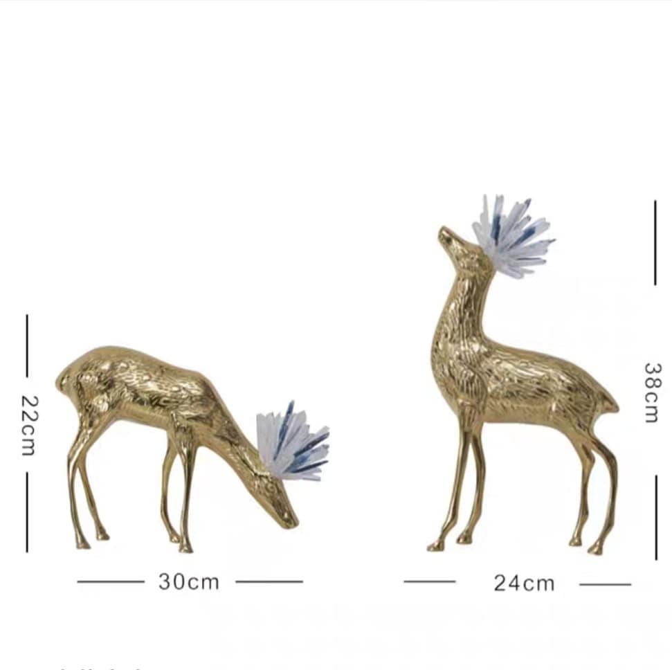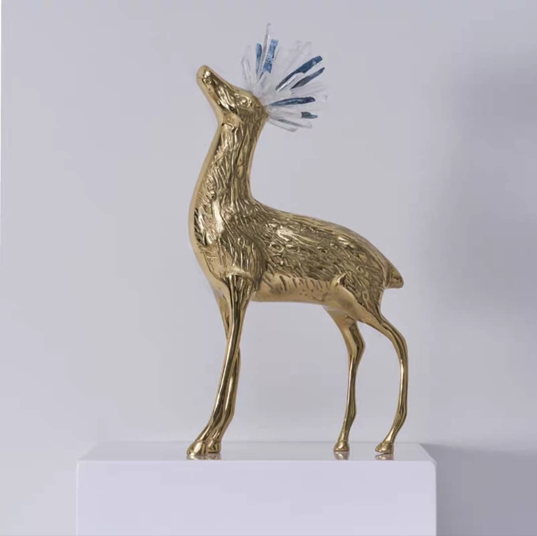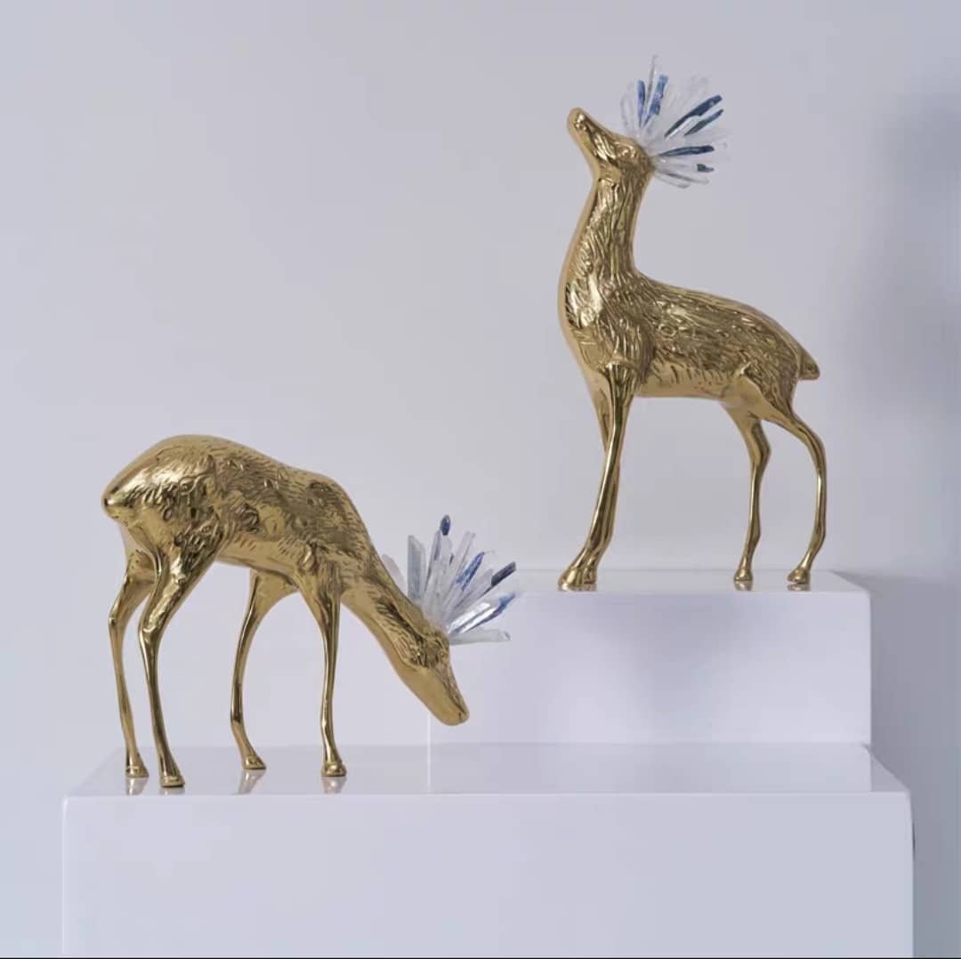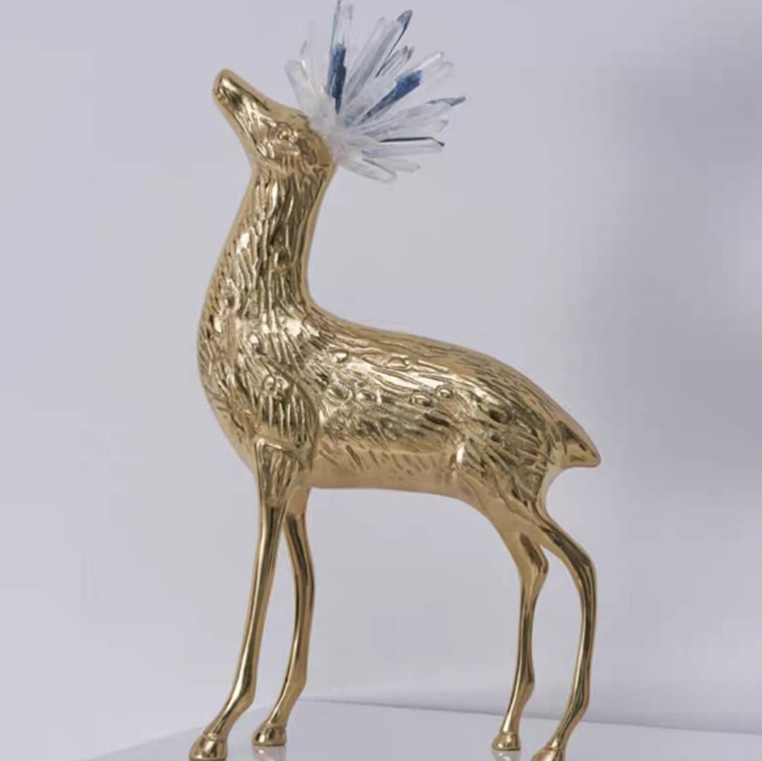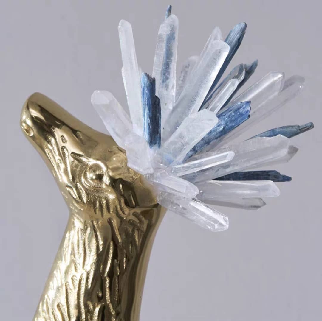 Милые оленята из латуни, увенчанные роскошными кристаллами горного хрусталя и кианита – очень любимыми людьми минералами, которые обладают многочисленными полезными свойствами.