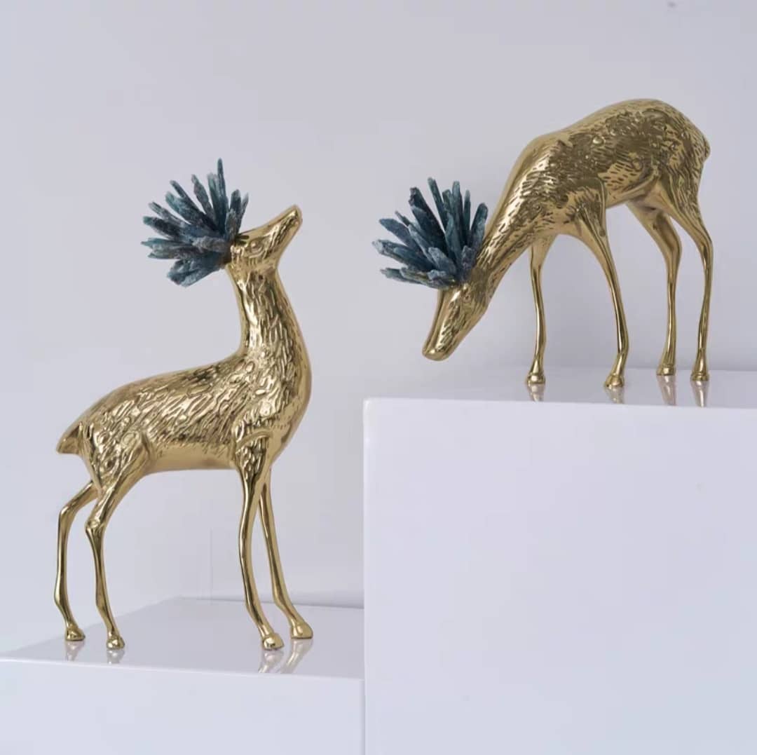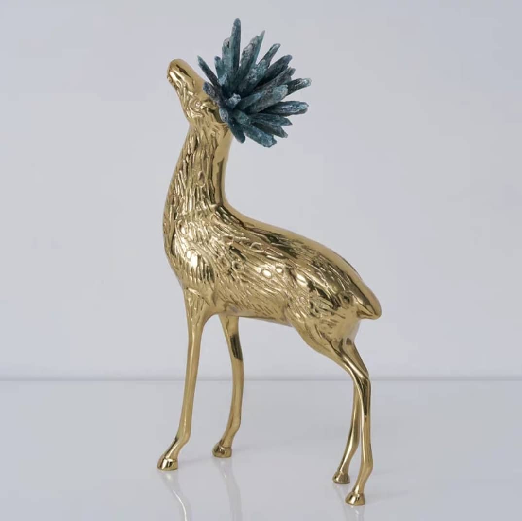 Милые оленята из латуни, увенчанные роскошными кристаллами горного хрусталя и кианита – очень любимыми людьми минералами, которые обладают многочисленными полезными свойствами.