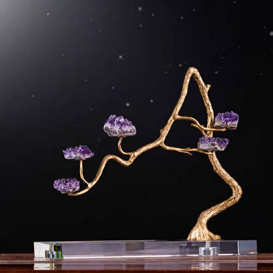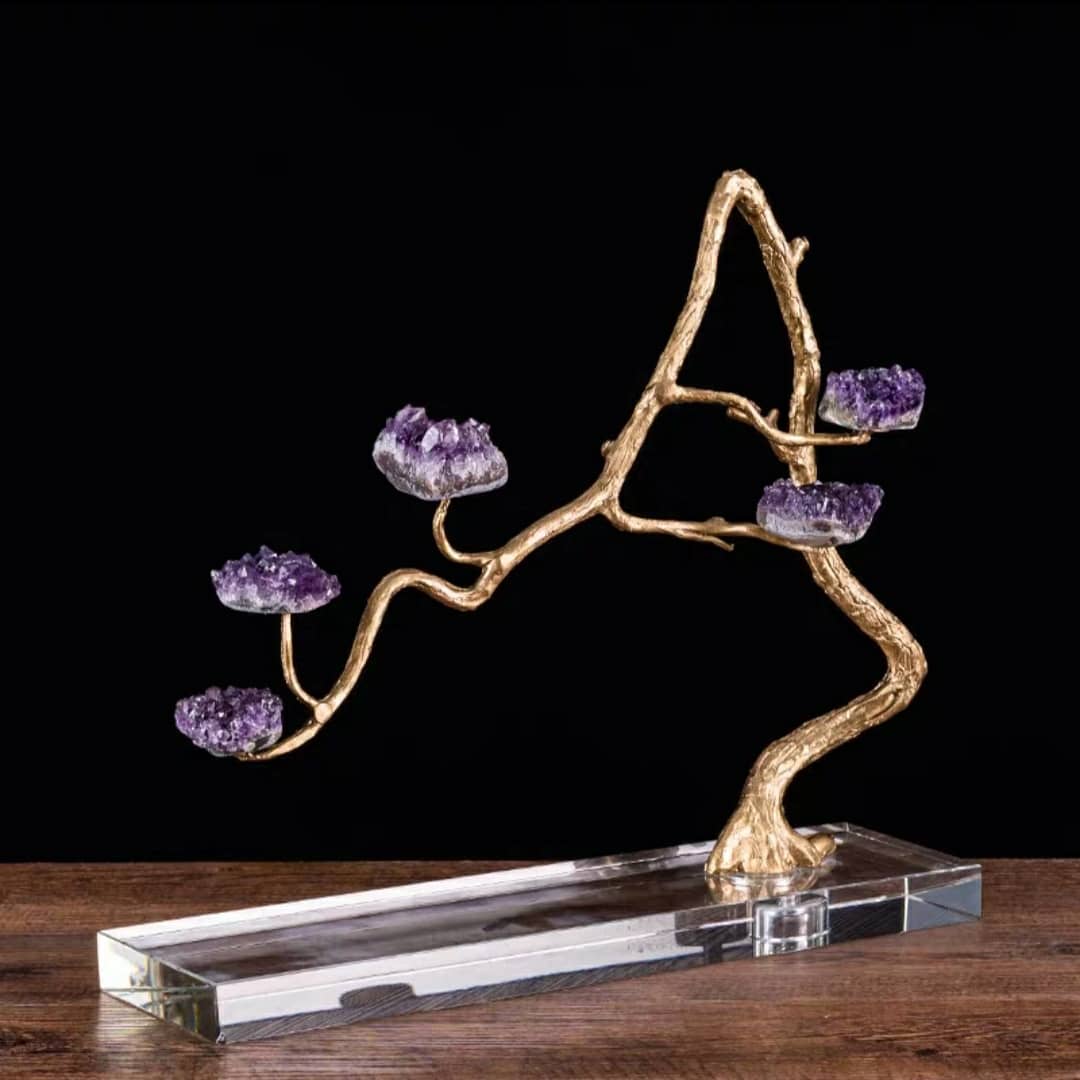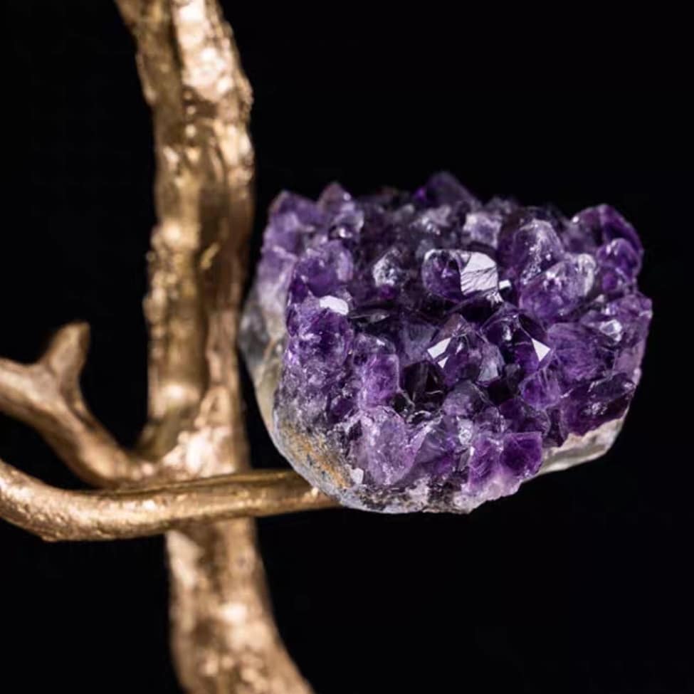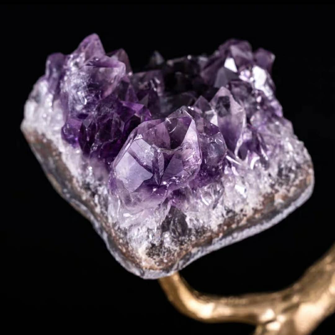 Насыщенно-фиолетовые, сверкающие друзы аметиста, в виде роскошных цветов, на блестящем латунном стебле. Яркая премьера в нашей кристаллической коллекции! Изысканный премиум-декор для красоты и уюта в вашем домашнем и (или) рабочем интерьере.