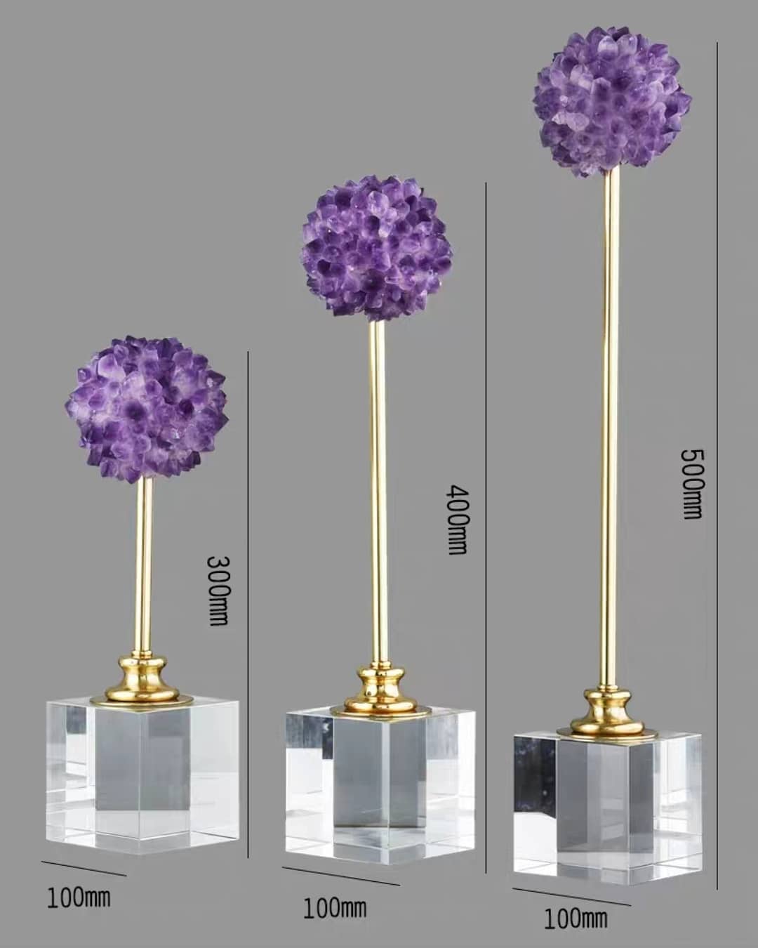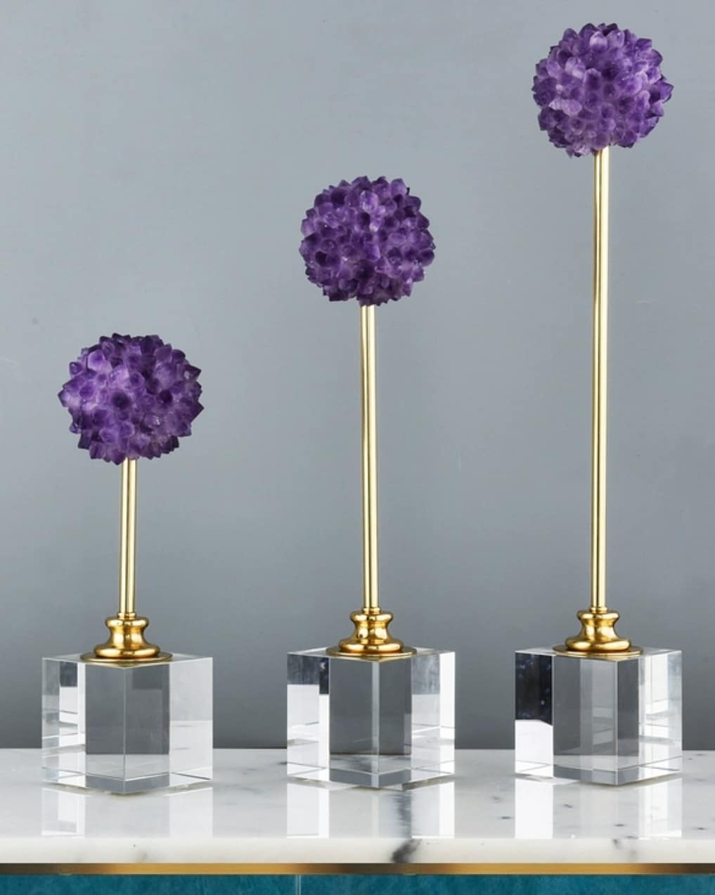 Сверкающие кристаллы натурального аметиста, собранные в сочные фиолетовые «соцветия», роскошь благородной латуни, и всё это – на хрустальной подставке, которая имеет идеальную форму куба. Размеры – на фото.
