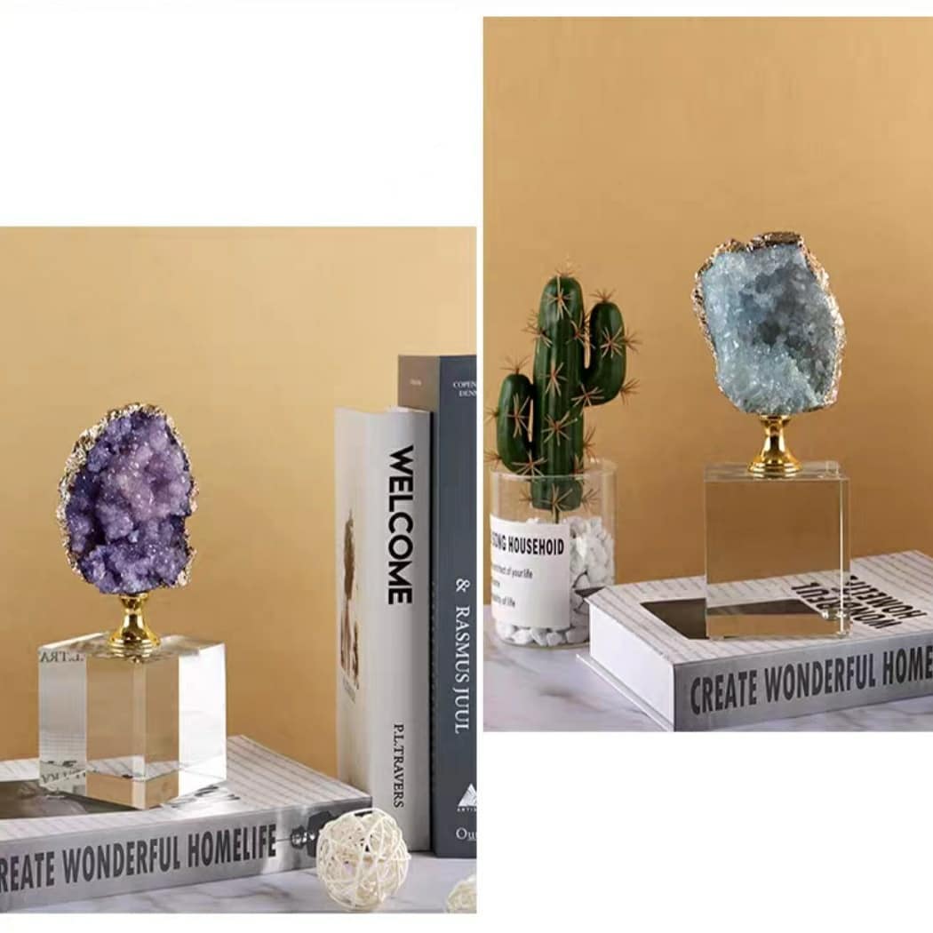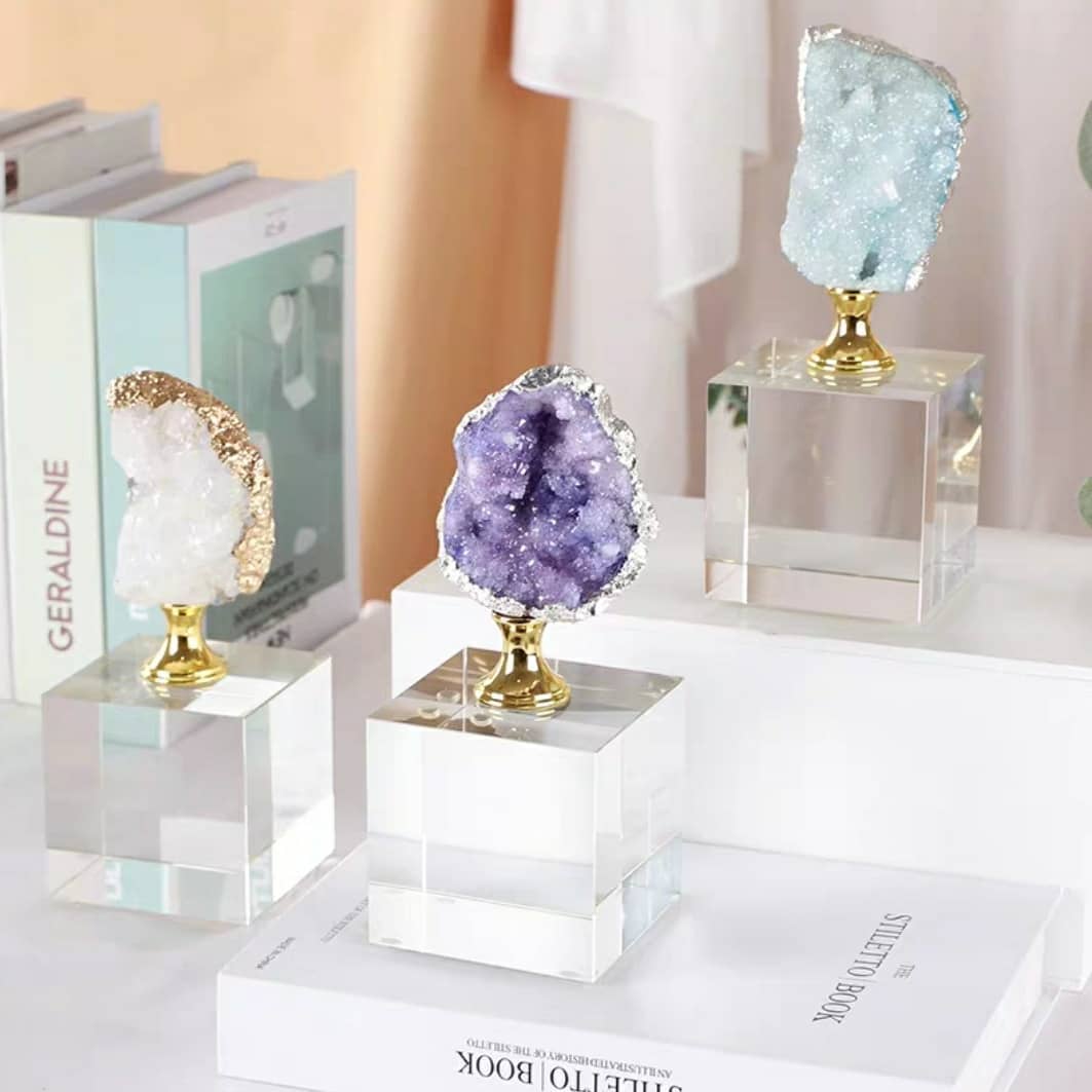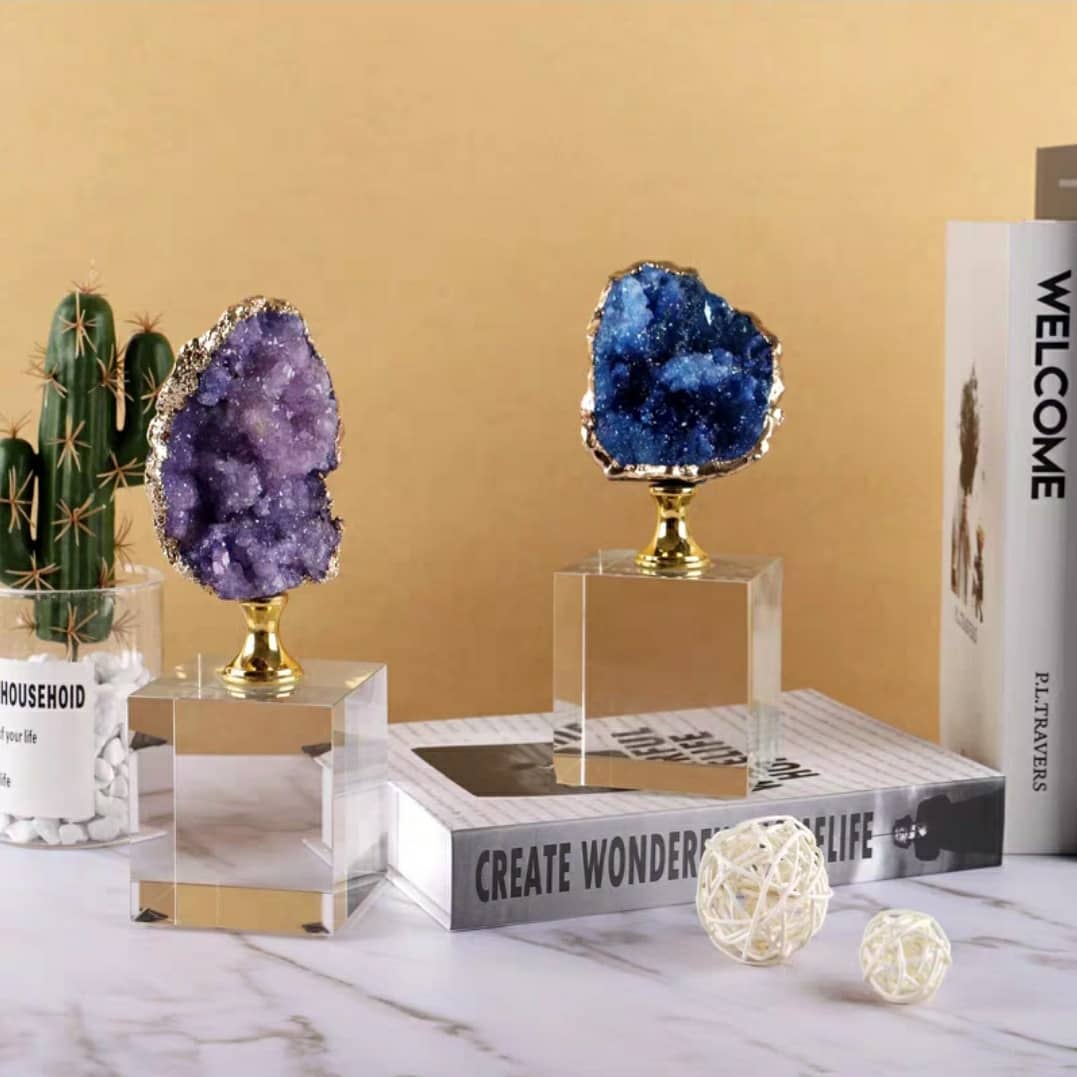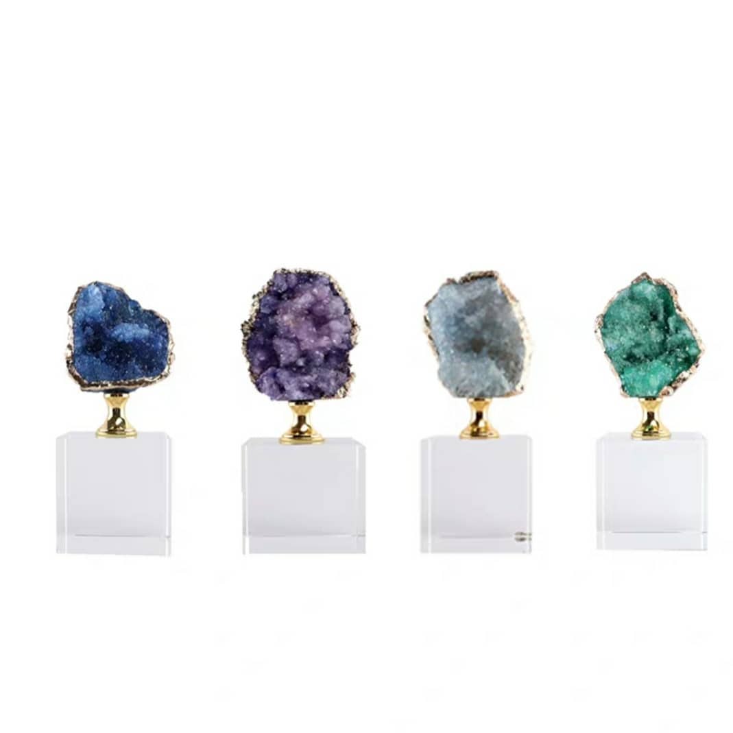 Жеоды агата, различных цветов, наполовину покрытые золотой «глазурью», на подставочках из чистейшего хрусталя и латуни.