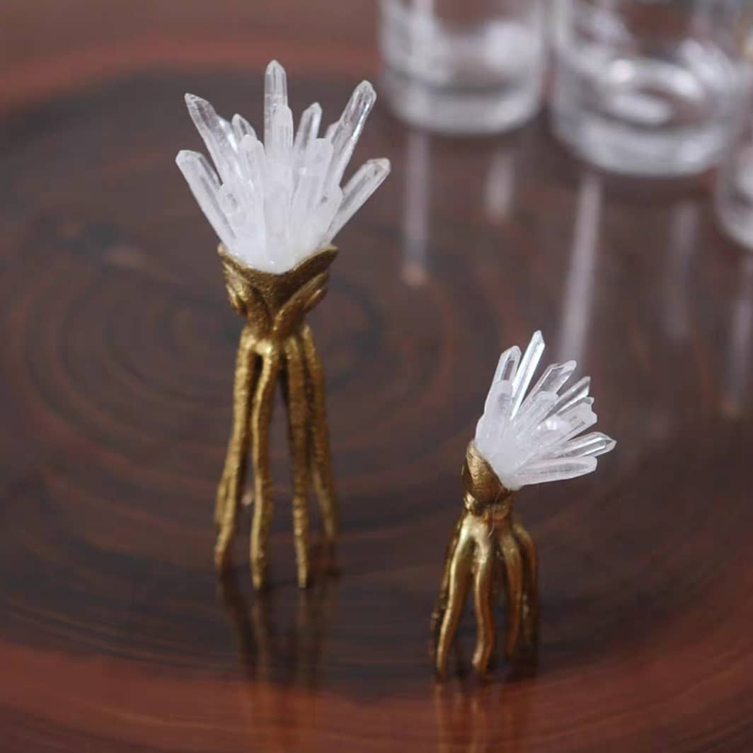 Наши мастера взяли отборные кристаллы горного хрусталя, добавили «ножки» из благородной латуни, и получились такие вот замечательные «осьминожки». Размеры на фото.