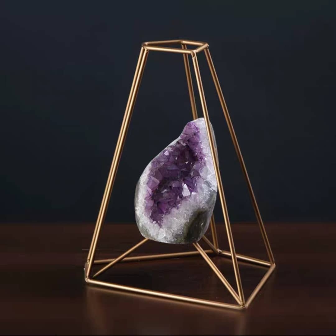 Декоративные усеченные пятиугольные пирамиды из благородной латуни, с роскошной жеодой аметиста в центре.