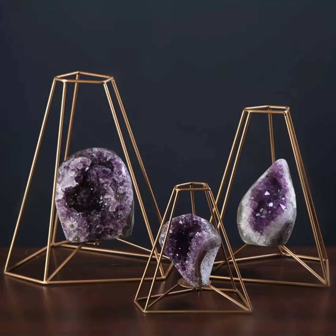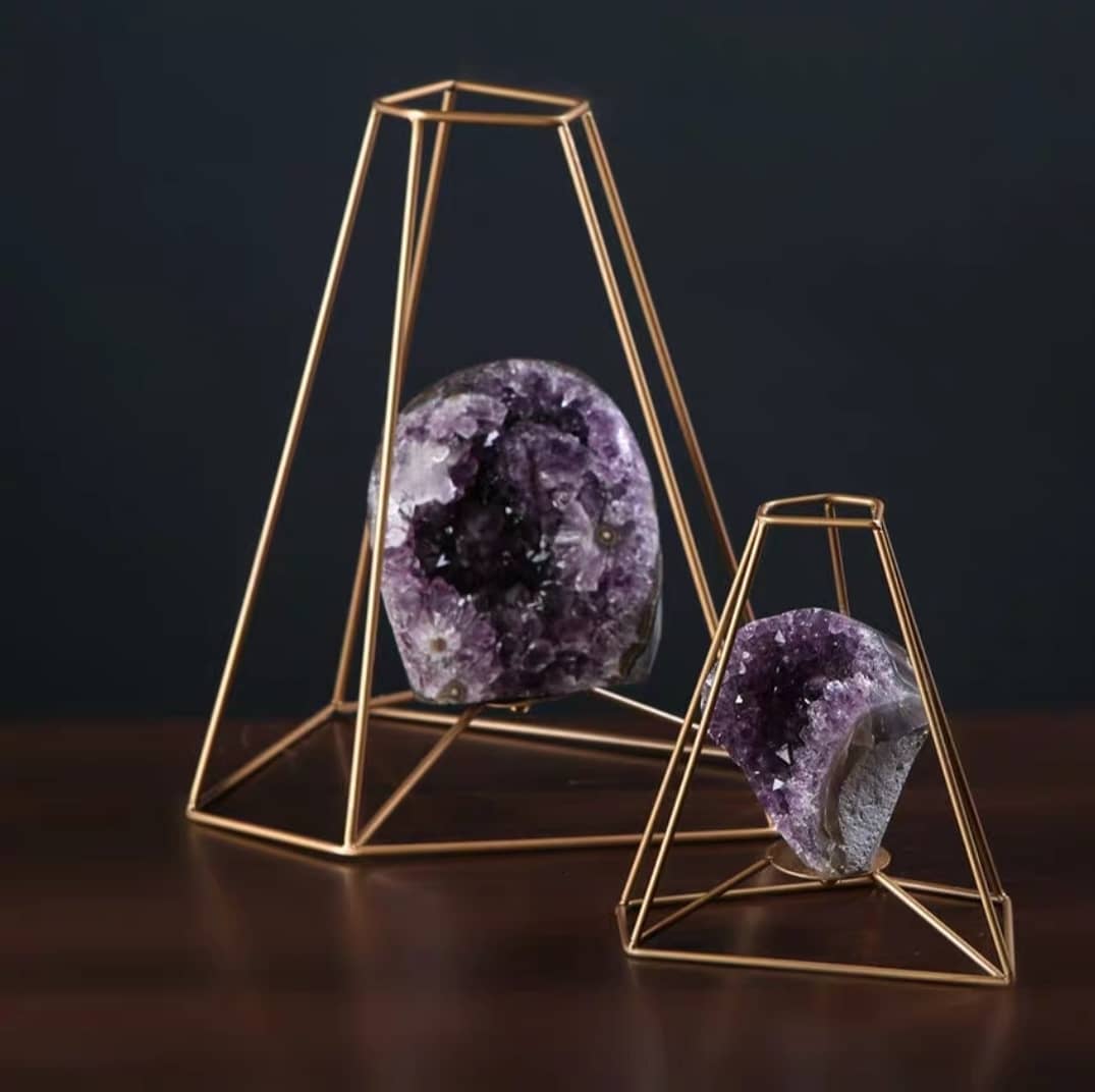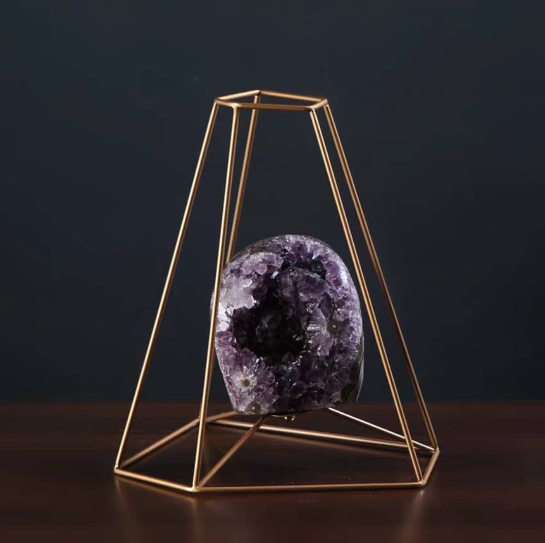 Декоративные усеченные пятиугольные пирамиды из благородной латуни, с роскошной жеодой аметиста в центре.