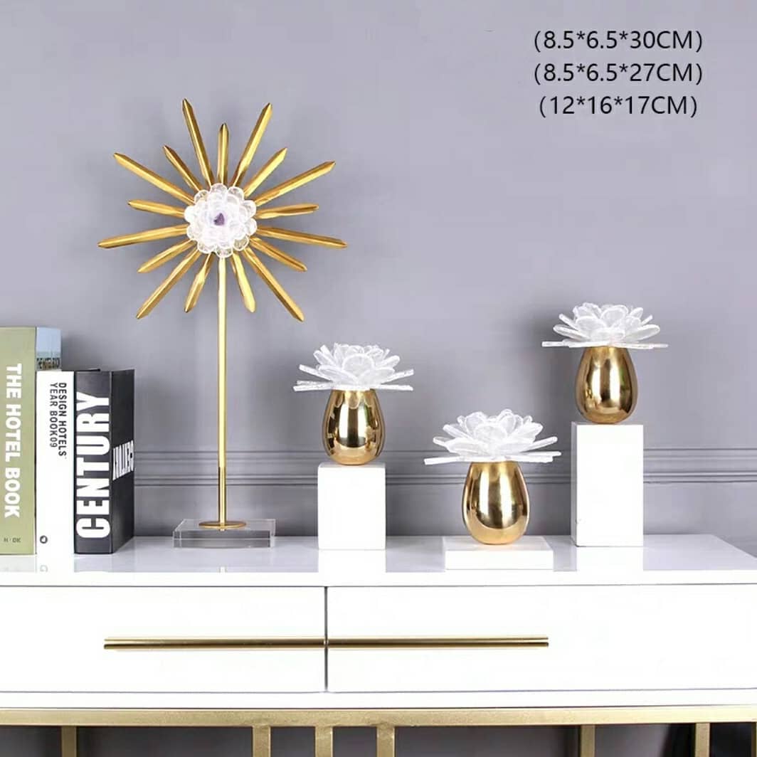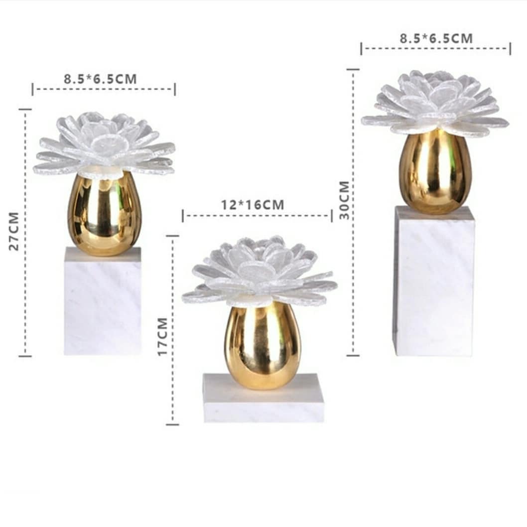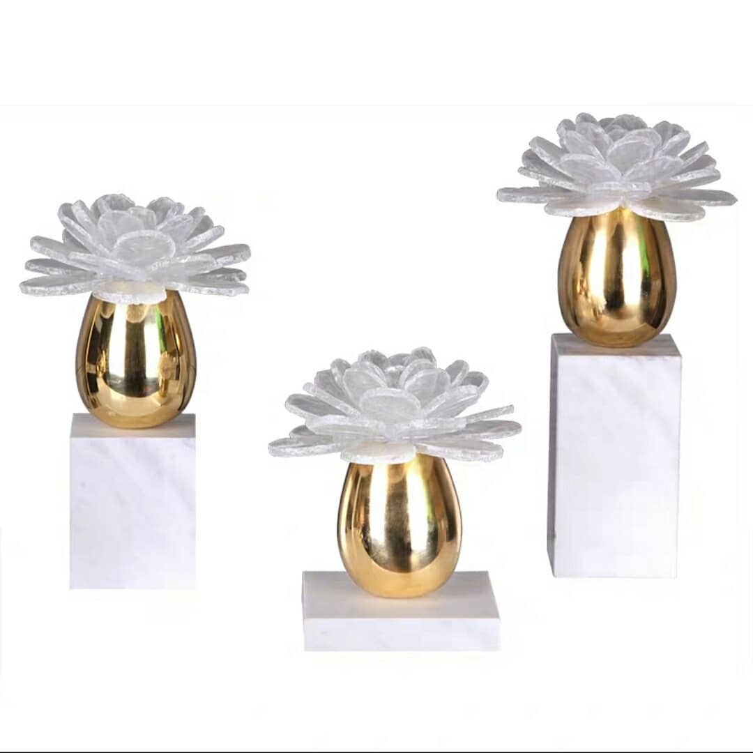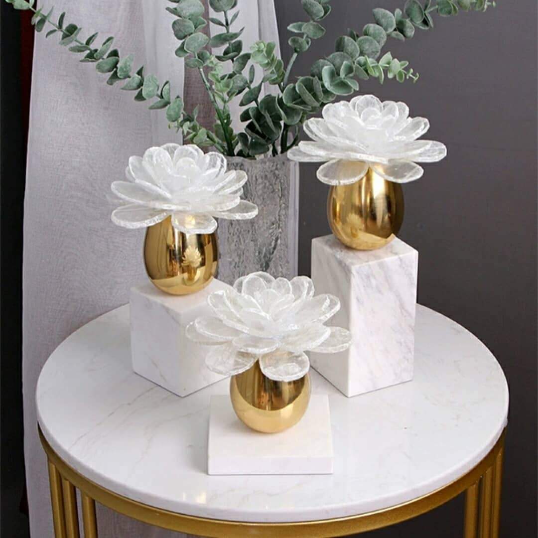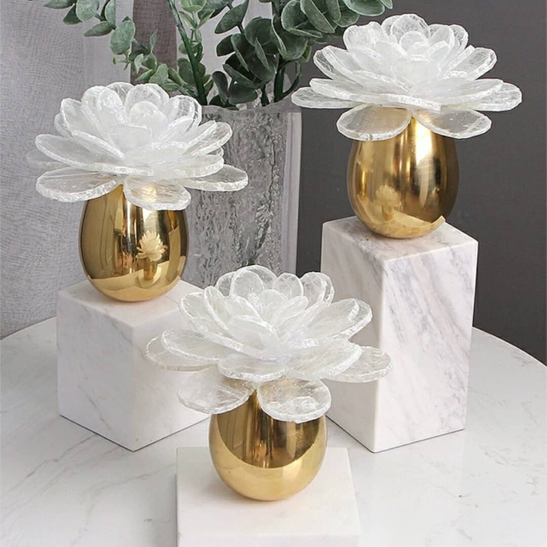 В нашей кристаллической коллекции премиум-декора – удивительная, яркая вещь. Фантастические, экзотические цветы, которые будут прекрасно, роскошно смотреться на вашем любимом столике, на полочке, посреди живых растений и т.д. Белоснежные кристаллы кварца, её благородное сиятельство – латунь, и классический мрамор – в основании!