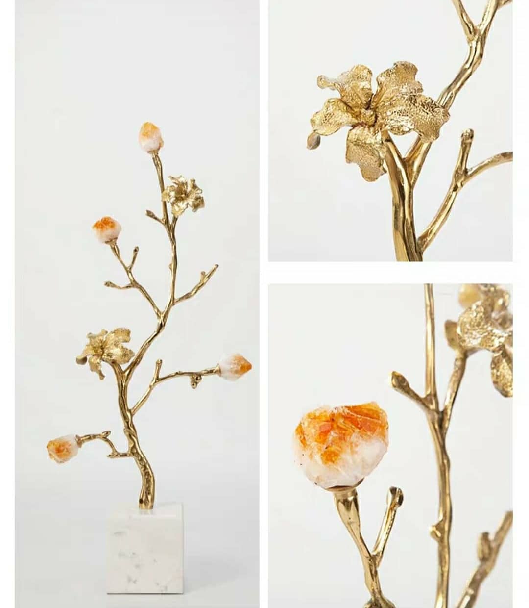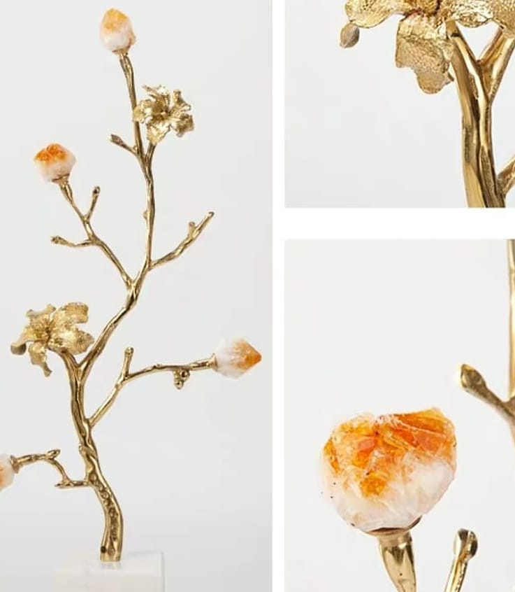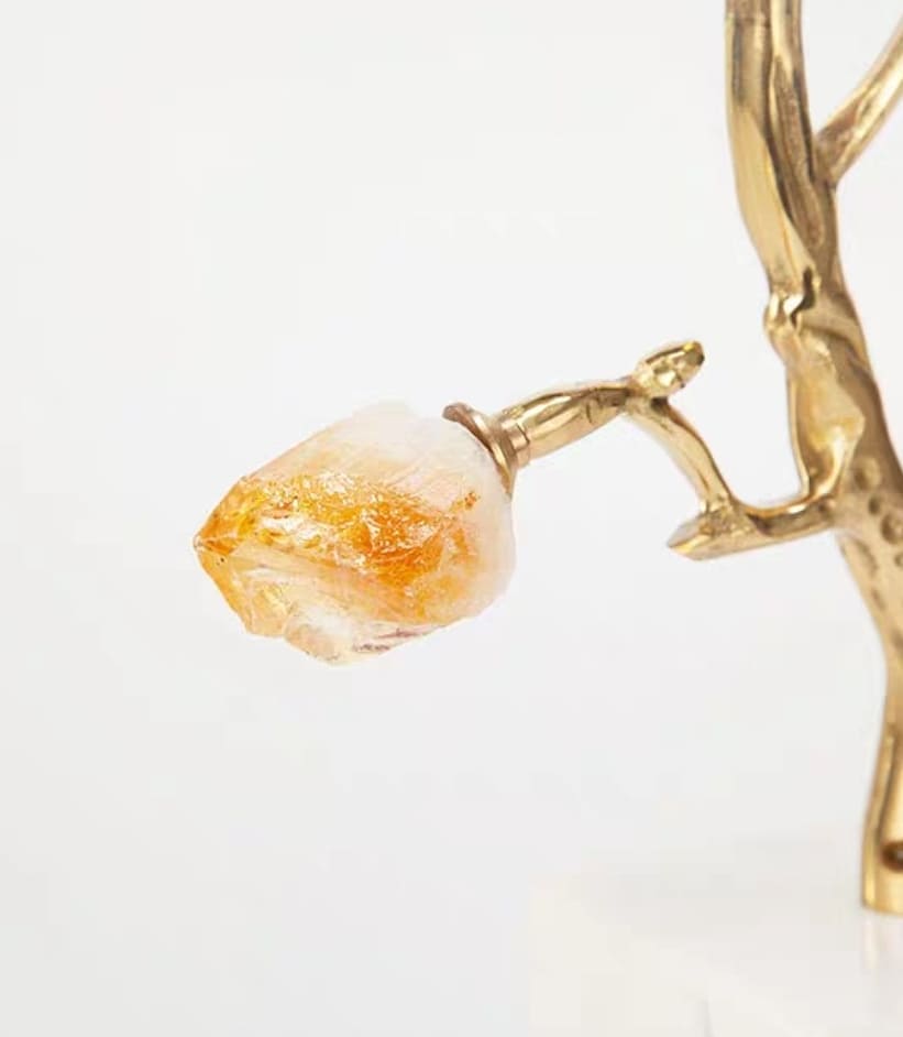 Кристаллы цитрина, латунные веточки, мраморное основание. С давних пор люди верят в то, что кристаллы цитрина очень способствуют качественным коммуникациям, и даже развивают ораторские способности. Мы облагораживаем полудрагоценные камни, создаем великолепные композиции, и самоцветы превращаются в роскошный декор, не теряя при этом свои волшебные свойства для тех, кто верит в «магию камней».