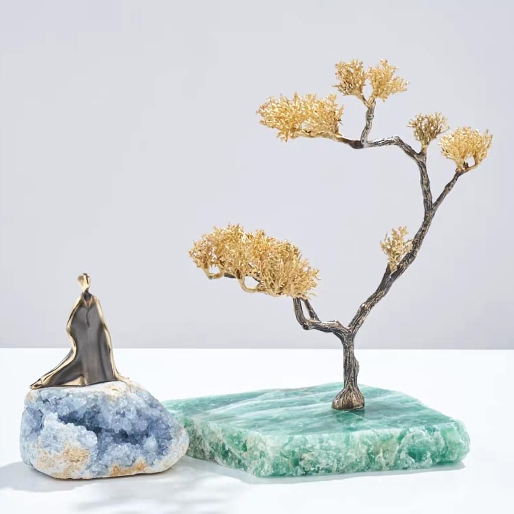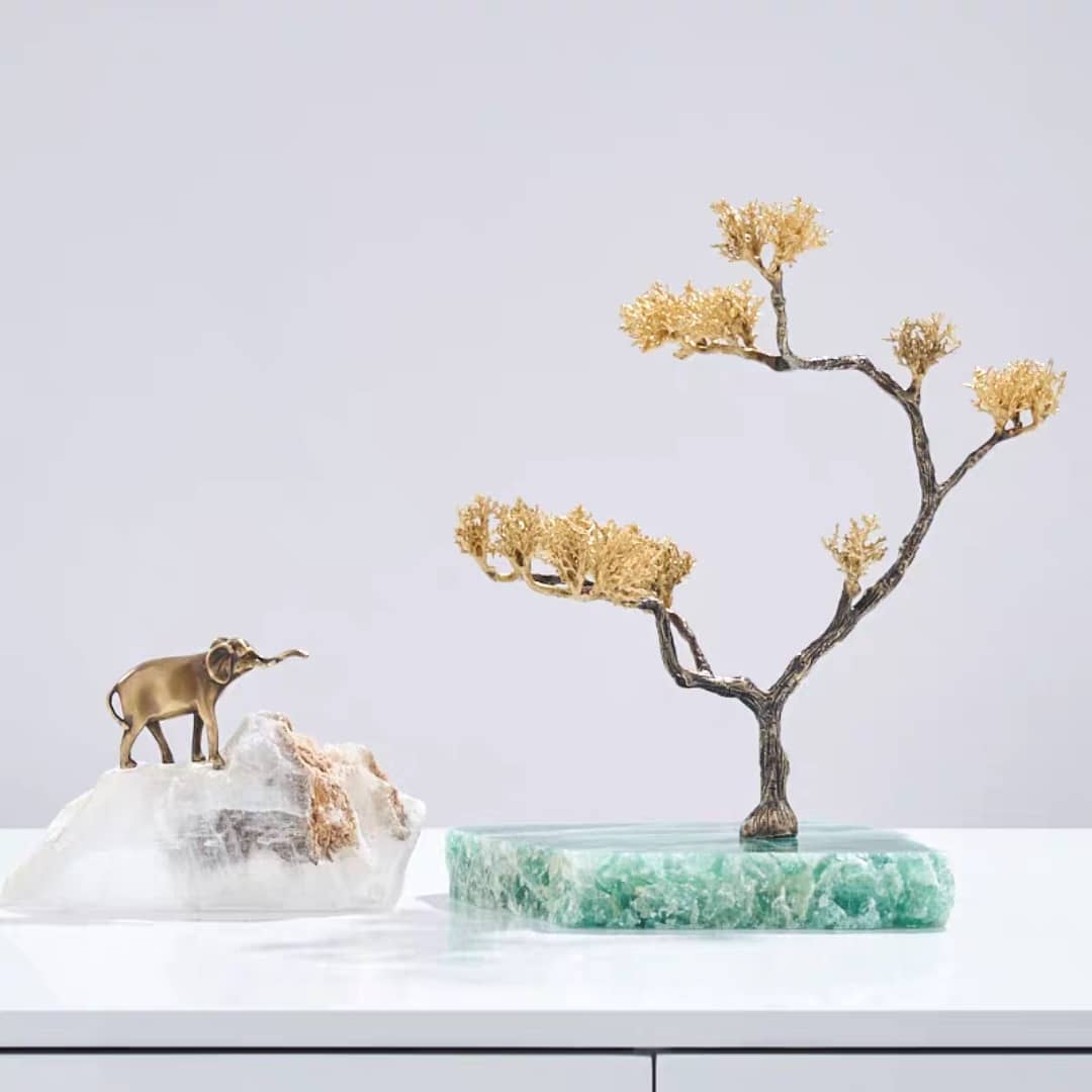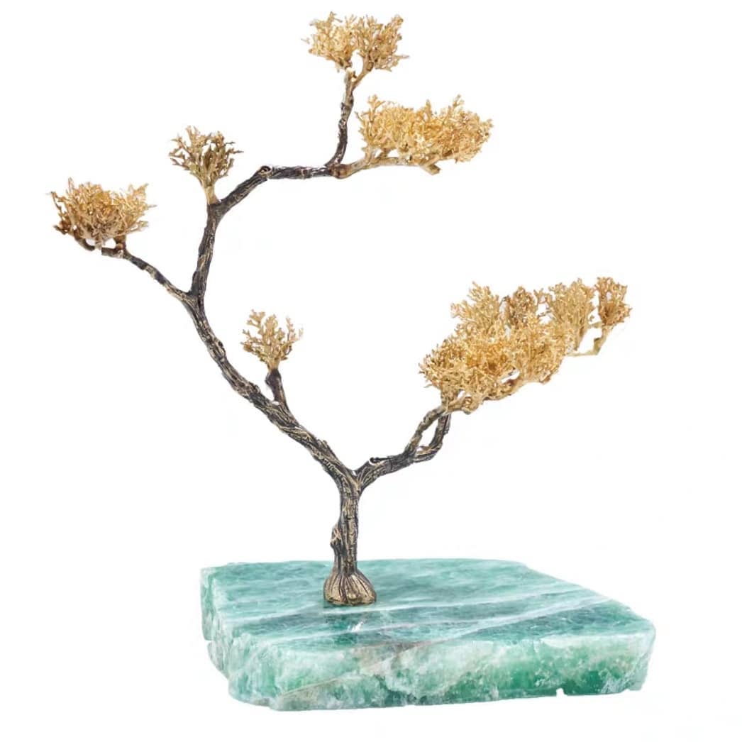 Изящные фэнтезийные деревца на подставке из натурального флюорита. Премиум-декор нашей кристаллической коллекции – для красоты вашего дома! Есть деревце с великолепной лошадкой, а есть – без неё, на выбор. Размеры: 30×35 см, 33×32 см.