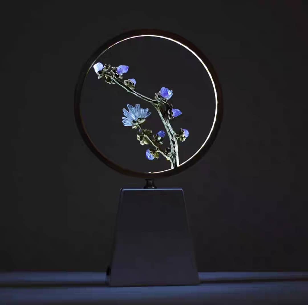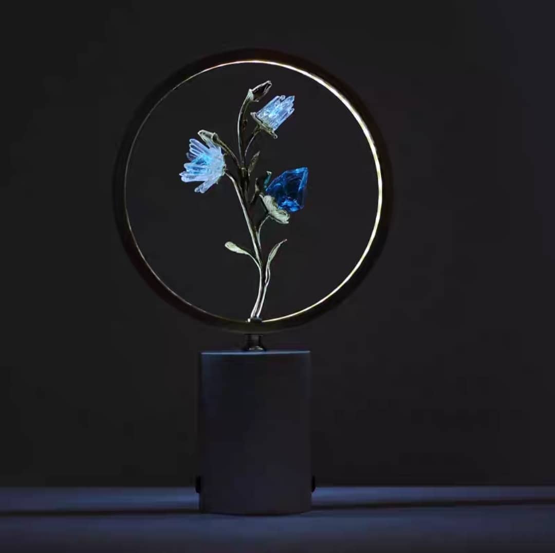Днем – это замечательный декор, а когда стемнеет, когда станет совсем темно, он превращается в уютный светильник, или как раньше говорили – «ночник», «ночничок». Подставка из натурального мрамора, латунь, великолепные кристаллы. И да – они светятся в темноте!