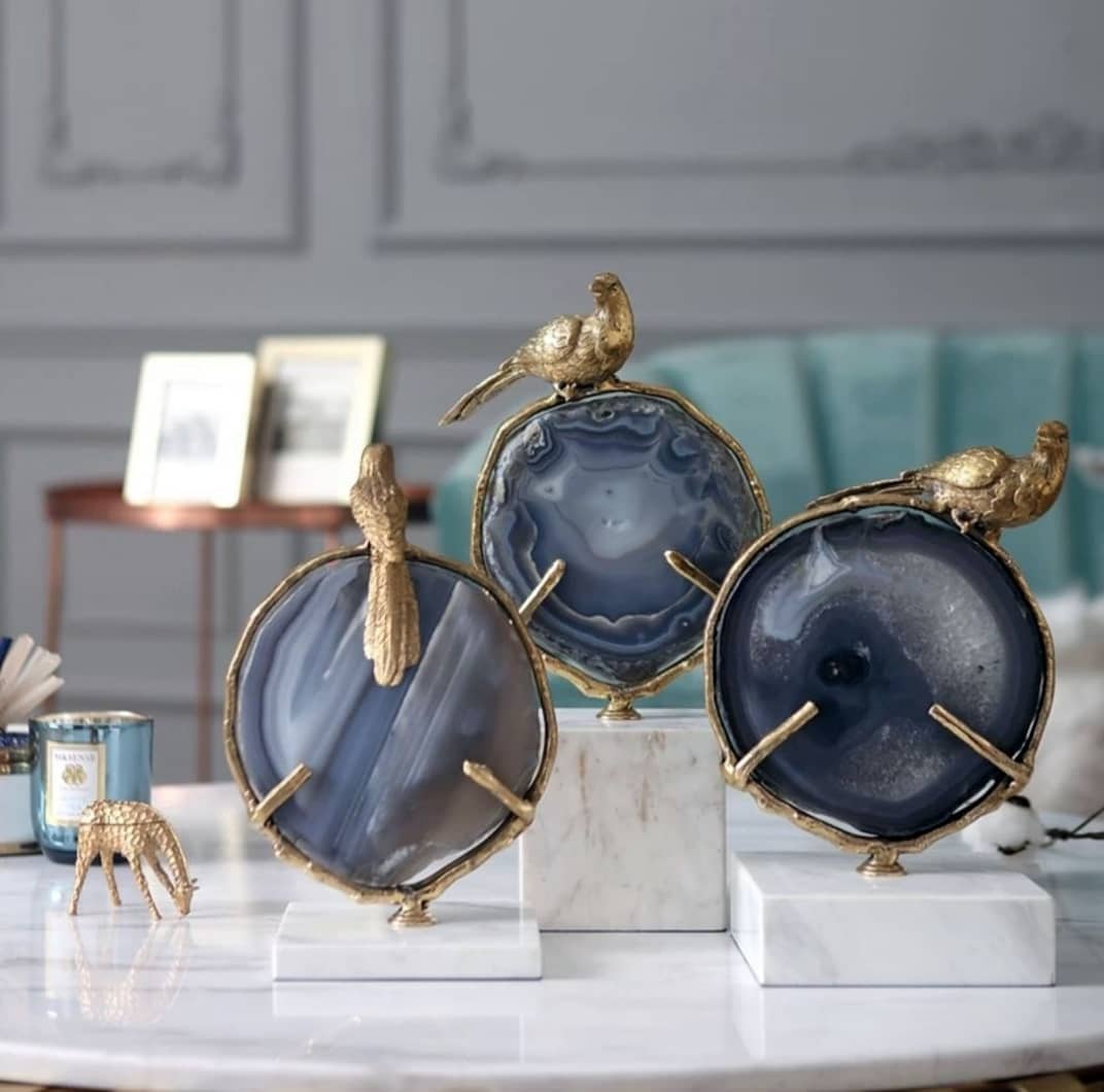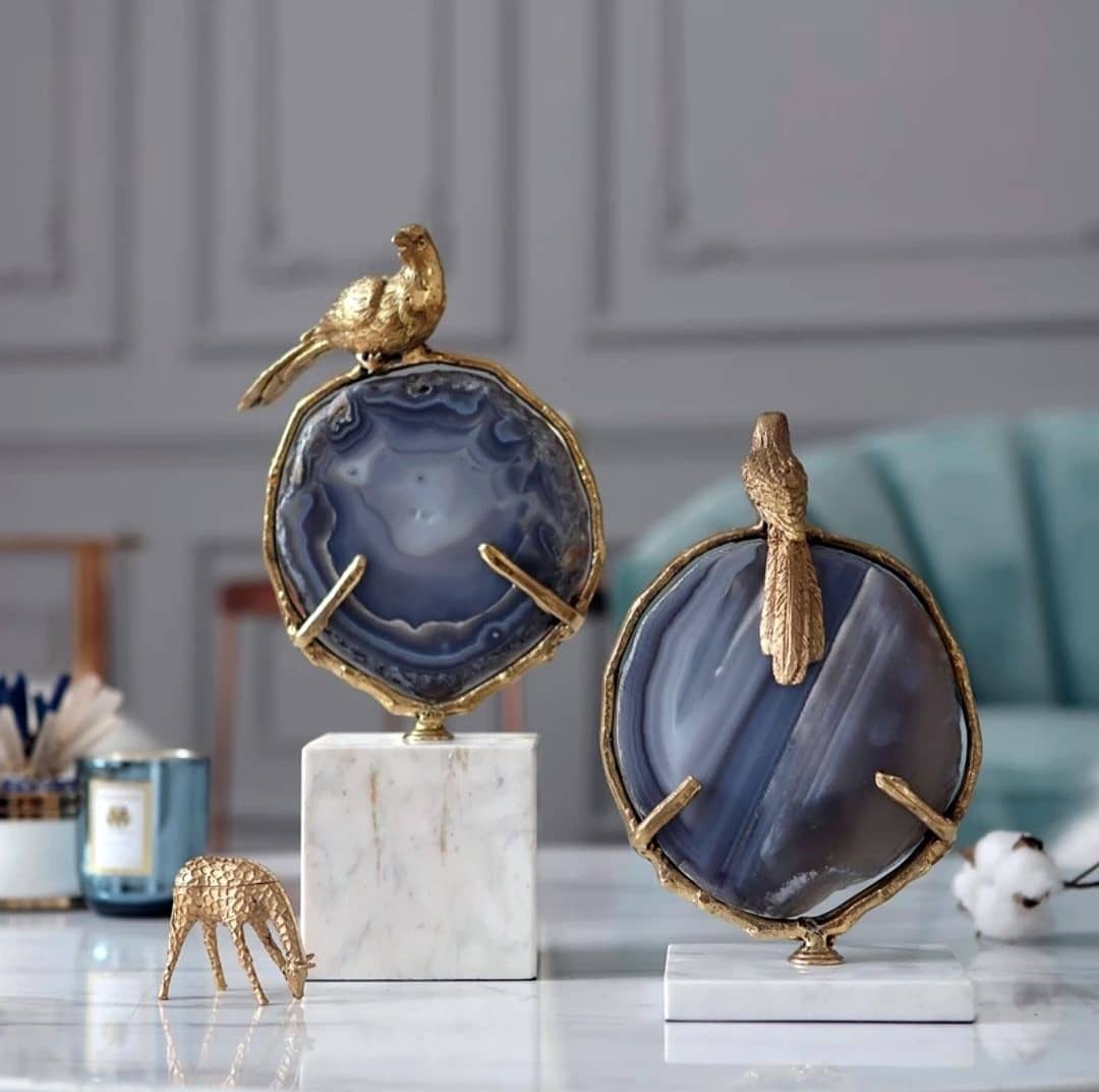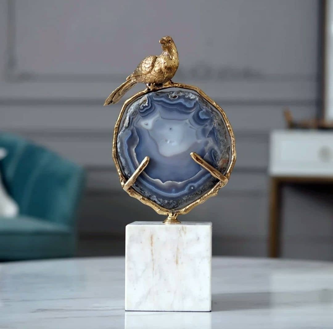 Статуэтка Бронзовая птица на срезе агата на мраморной подставке