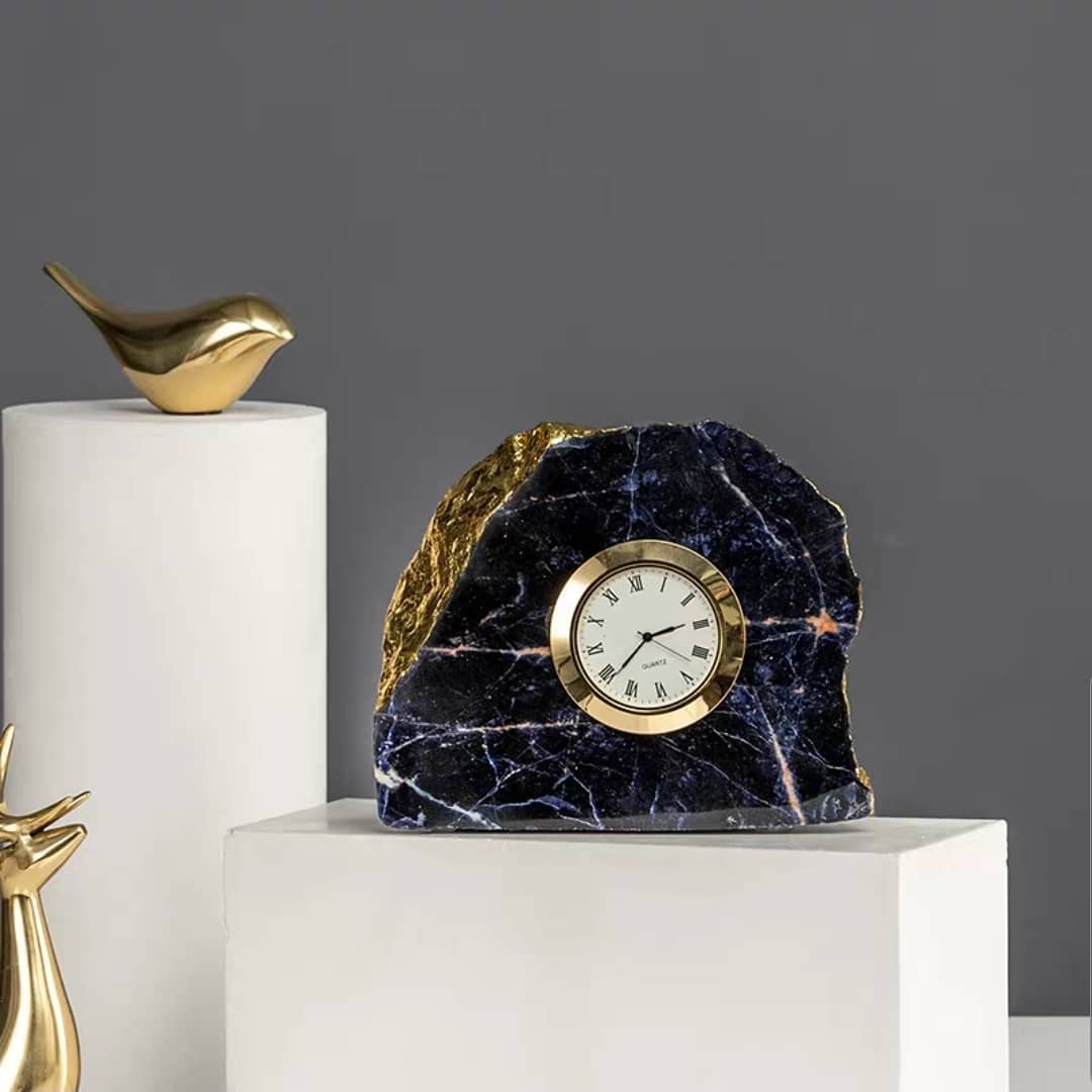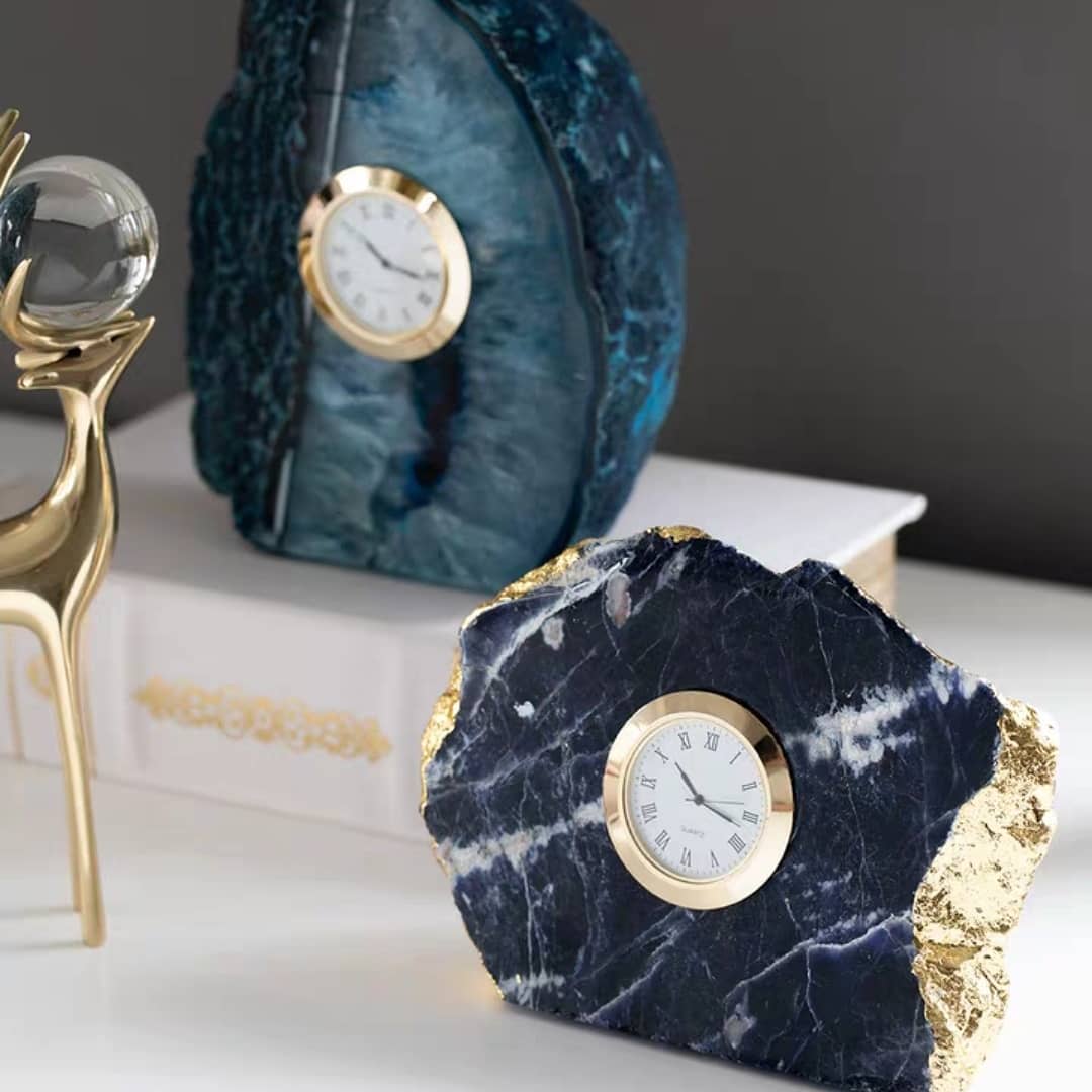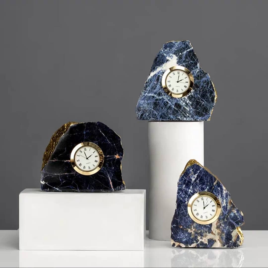 Платон сравнивал время с движущимся подобием вечности, а земным символом вечности всегда были камни. Людям казалось, что они не подвластны времени! А если талантливо совместить часы и камни, да не простые, а самоцветные? Получится красота! Эту замечательную коллекцию декора можно смело назвать: «Время и вечность». «Вечность» представлена превосходным голубым агатом и содалитом (на выбор). «Время» — часами классического дизайна. Нам пока не хватило времени, чтобы понять — оказывает ли магия камней влияние на время, но мы точно знаем о том, что на пространство она влияет и очень позитивно!