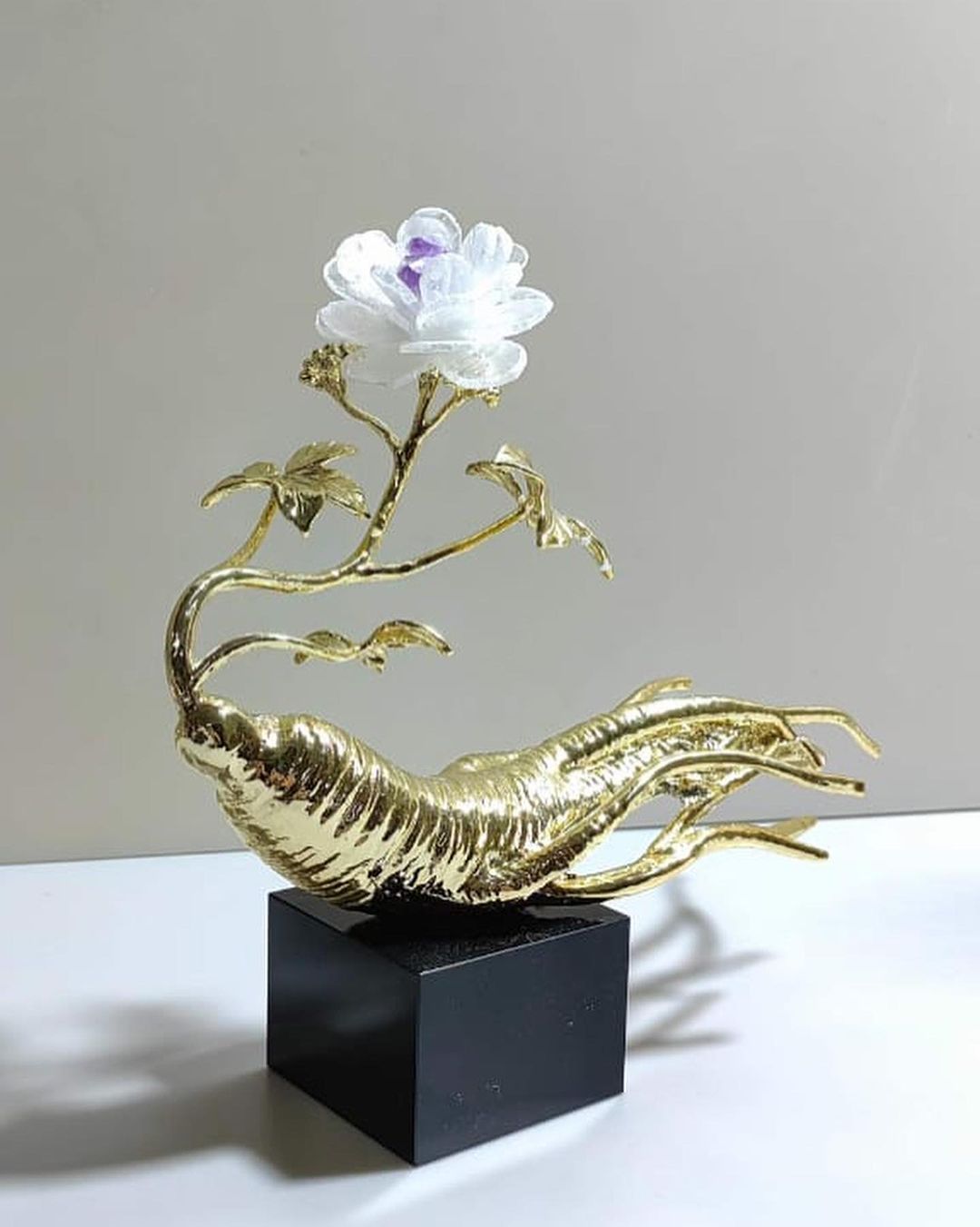 Стильный премиум-декор для вашего дома или офиса. Женьшень из благородной латуни и настоящих кристаллов аметиста/кварца. Подставка из натурального мрамора. Легендарное растение с мощным позитивным символизмом. Отличный и красивый выбор!
