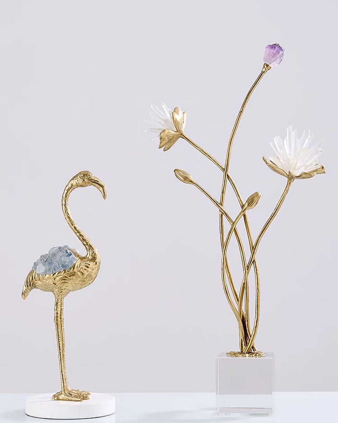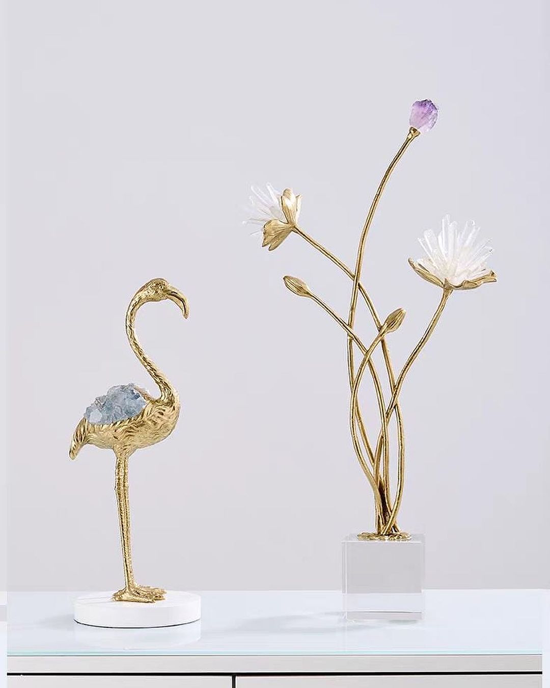 Очаровательная парочка изящных фламинго, как отличный символ счастливой семьи, и другой декор Monsterior Gems. Верное решение, для качественного украшения стильного и уникального интерьера - домашнего и (или) делового. Благородная латунь, настоящие кристаллы и мрамор.