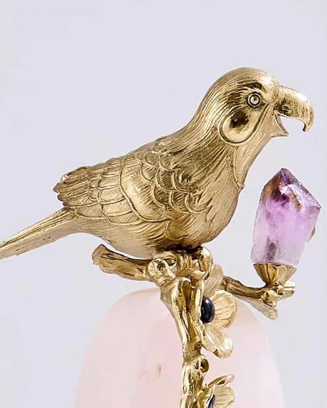 Волшебные птички из благородной латуни, отборные кристаллы аметиста, нежный розовый кварц, натуральный мрамор, гармонично сочетаются в единой композиции. Отличный выбор и позитивный символизм для стильного, современного интерьера.