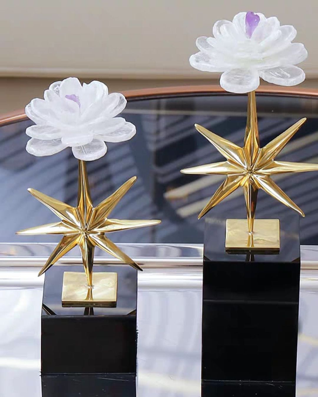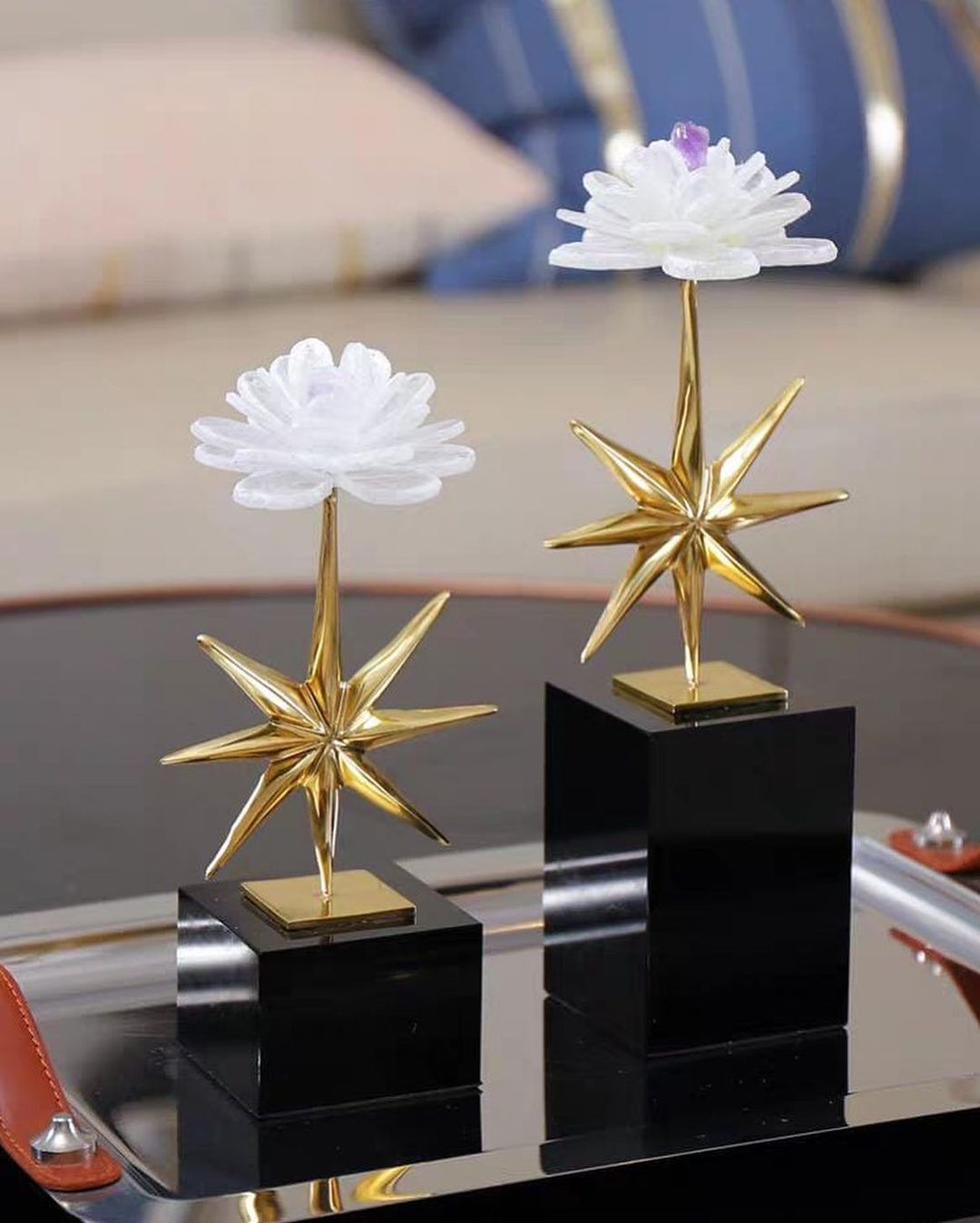 Благородная латунь, отборные кристаллы горного хрусталя и аметиста, натуральный мрамор.
