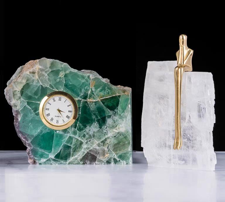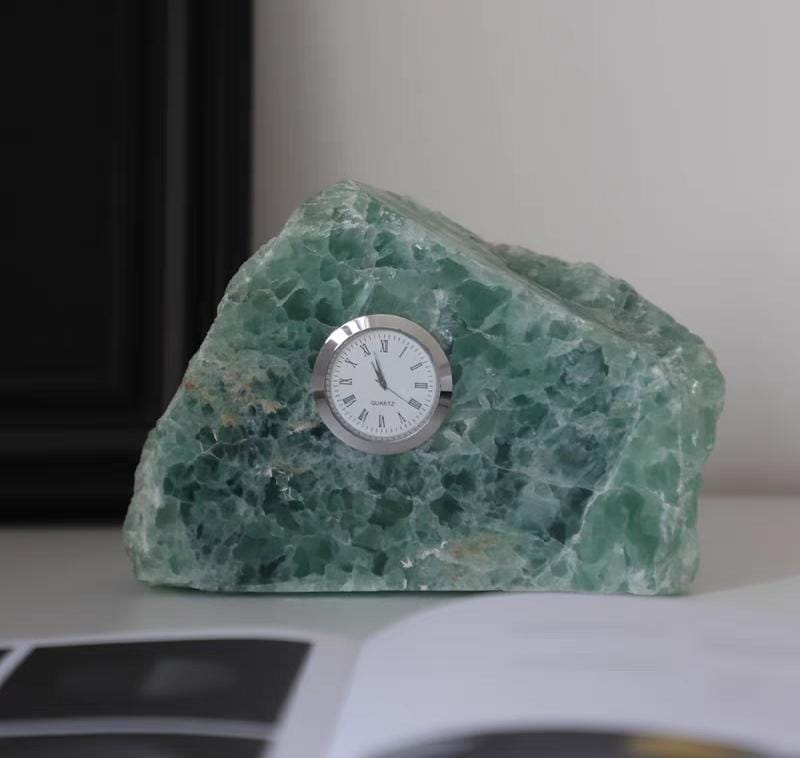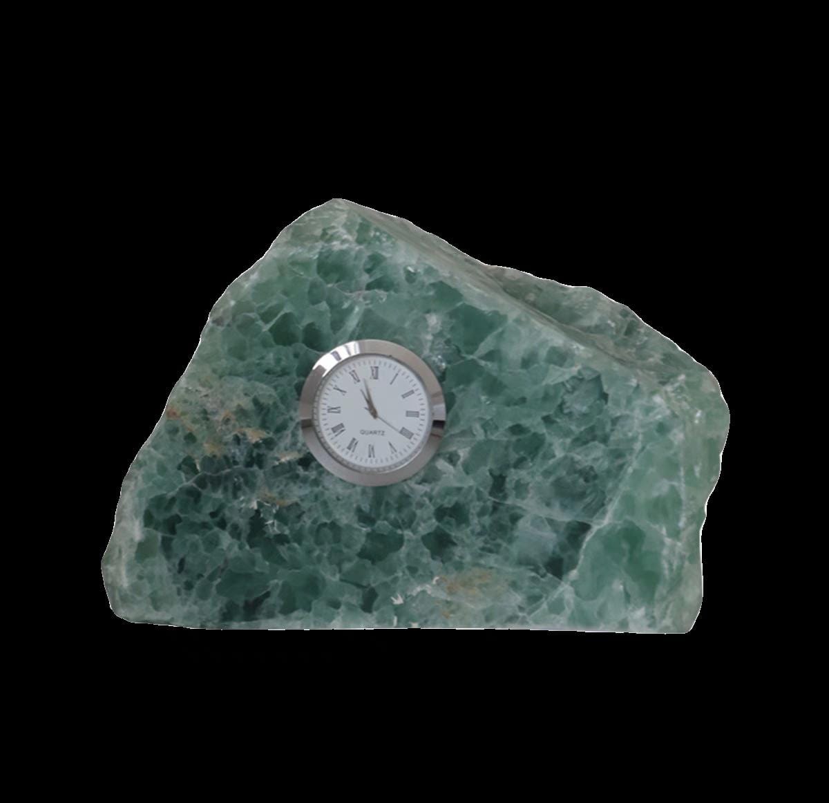 Флюорит, как символ вечности, в который интегрированы часики, отображающие плавное течение, а может быть и ускоряющийся бег времени.