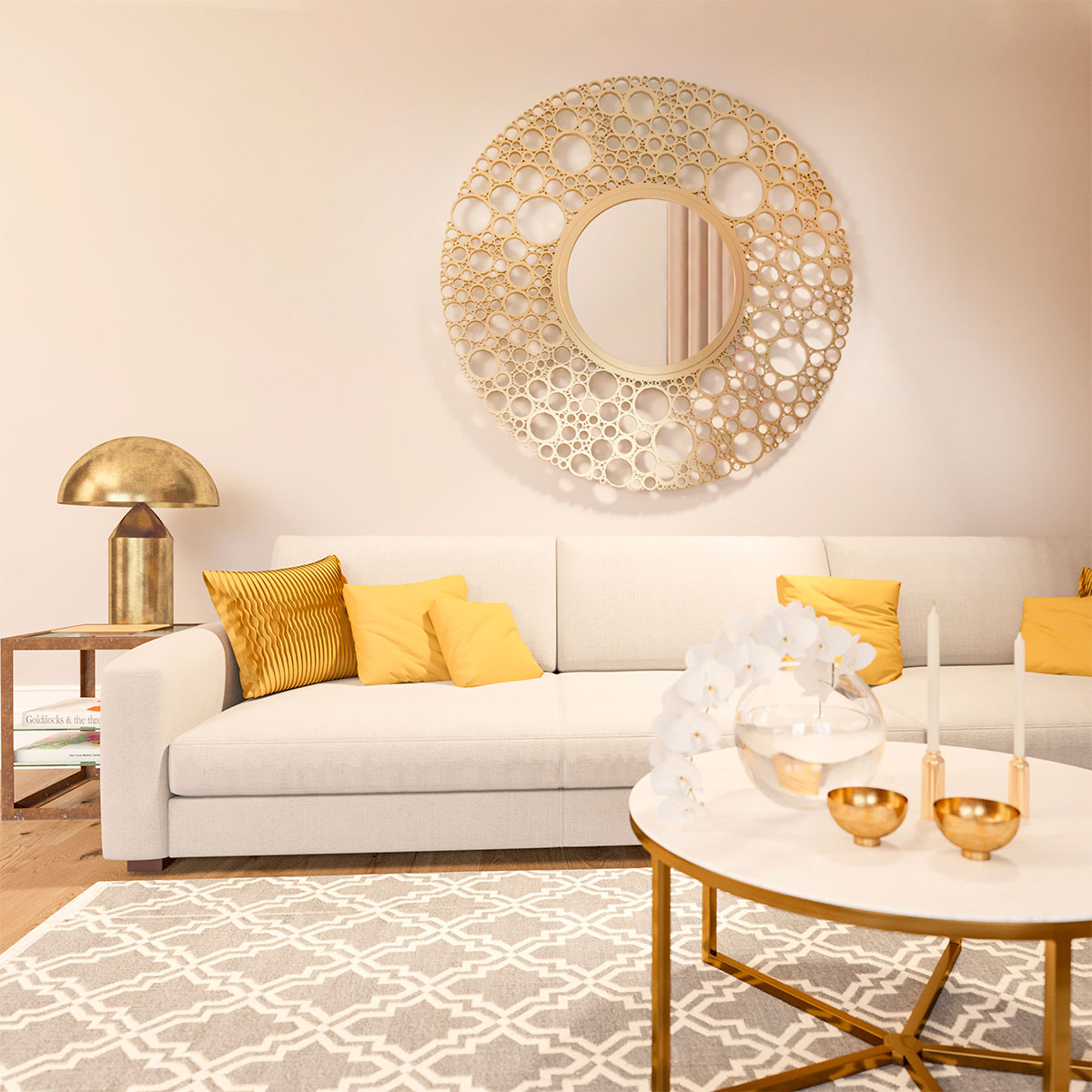 Дизайнерское зеркало для интерьера БАБЛ замысловатым, но графичным рисунком не перегружает помещение, добавляя ему жизни и выступая ярким акцентом в жилом пространстве. Изящная и тонкая рама делают его роскошным декоративным объектом.