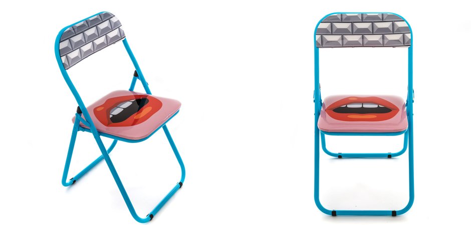 Складные металлические стулья с нестандартными принтами на пластиковом сиденье.