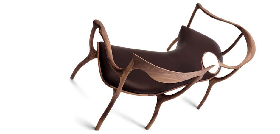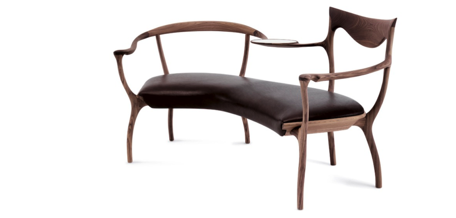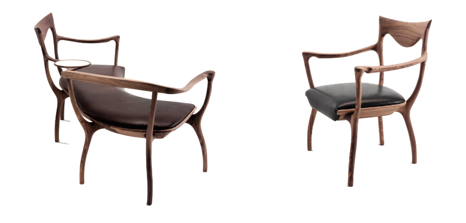 Модель стала гармоничным слиянием двух кресел со спинками разной высоты и миниатюрного журнального столика.