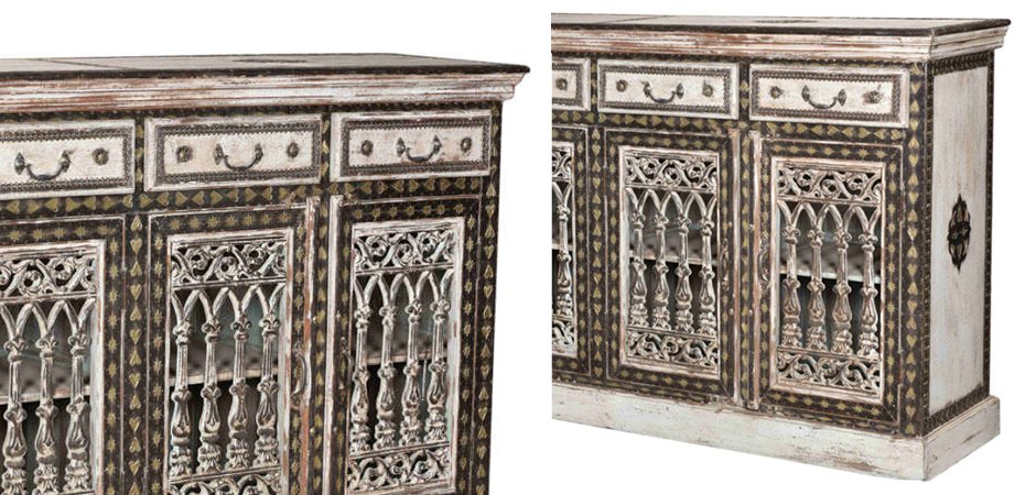 Роскошная тумба из тикового массива, укрепленная металлическими вставками. Благодаря своим размерам, данная модель может служить буфетом для посуды в столовой, или тумбой для хранения в гостиной. Своим шикарным внешним видом буфет обязан раритетным чугунным решеткам, украшающим стеклянные дверцы, и художественной латунной чеканке, обильно покрывающей переднюю часть мебели. Поверхность тумбы цвета слоновой кости состарена, местами из-под краски проглядывает дерево.