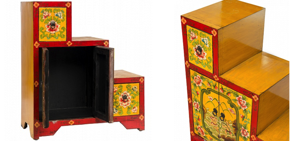 Яркий и экзотичный комод ранее служил удобным хранилищем для обуви. Его многоступенчатая конструкция была также удобна и для сидения, когда человек обувался.