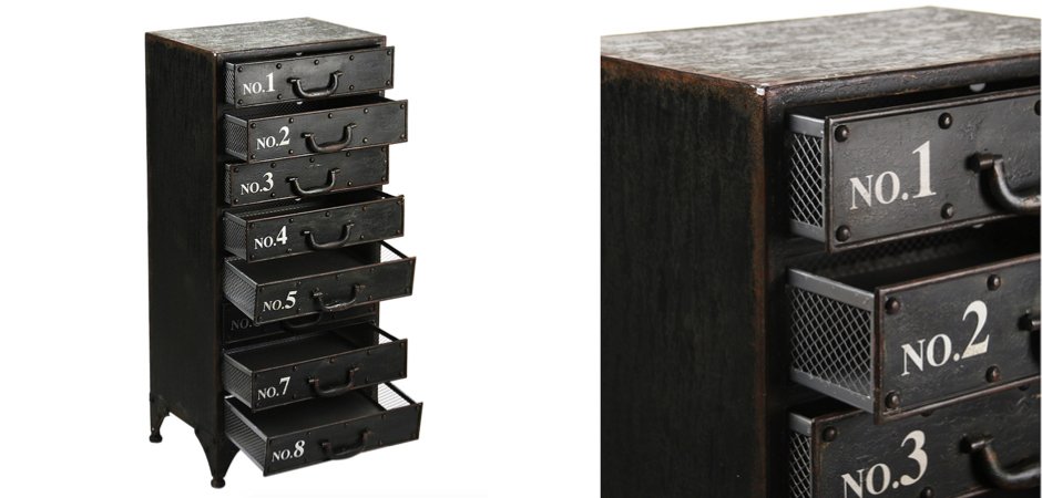 Комод Industrial Loft Rustic Iron 8 Drawer Dresser – это яркий представитель современного промышленного дизайна. Модель полностью сделана из металла и имеет простой дизайн. Среди оригинальных особенностей комода стоит отметить восемь пронумерованных ящиков с удобными ручками. «Несмотря на всю простоту Industrial Loft Rustic Iron 8 Drawer Dresser – очень яркая и динамичная вещь. На наш взгляд, этот комод хорошо подойдет для оформления комнаты молодых телом или душой людей, подчеркнет их открытость и готовность к чему-то новому», –отмечают дизайнеры Loft Concept. Модель Industrial Loft Rustic Iron 8 Drawer Dresser – хорошее решение для хранения вещей в интерьере в достаточно свободных, эклектичных современных стилях, таких, как лофт и индастриал.
