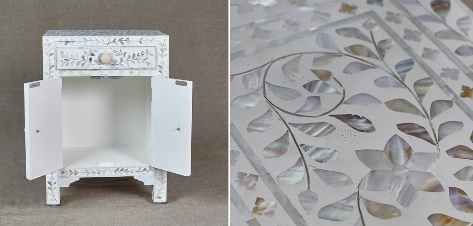 Комод из массива дерева с инкрустацией из перламутра в виде цветочного орнамента. Выполнен в в сочетании двух цветов белого и серого.