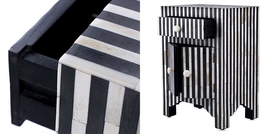 Комод из массива дерева с инкрустацией из натуральной кости в виде вертикальных полос. Полосы выполнены в двух цветах: белом и черном.