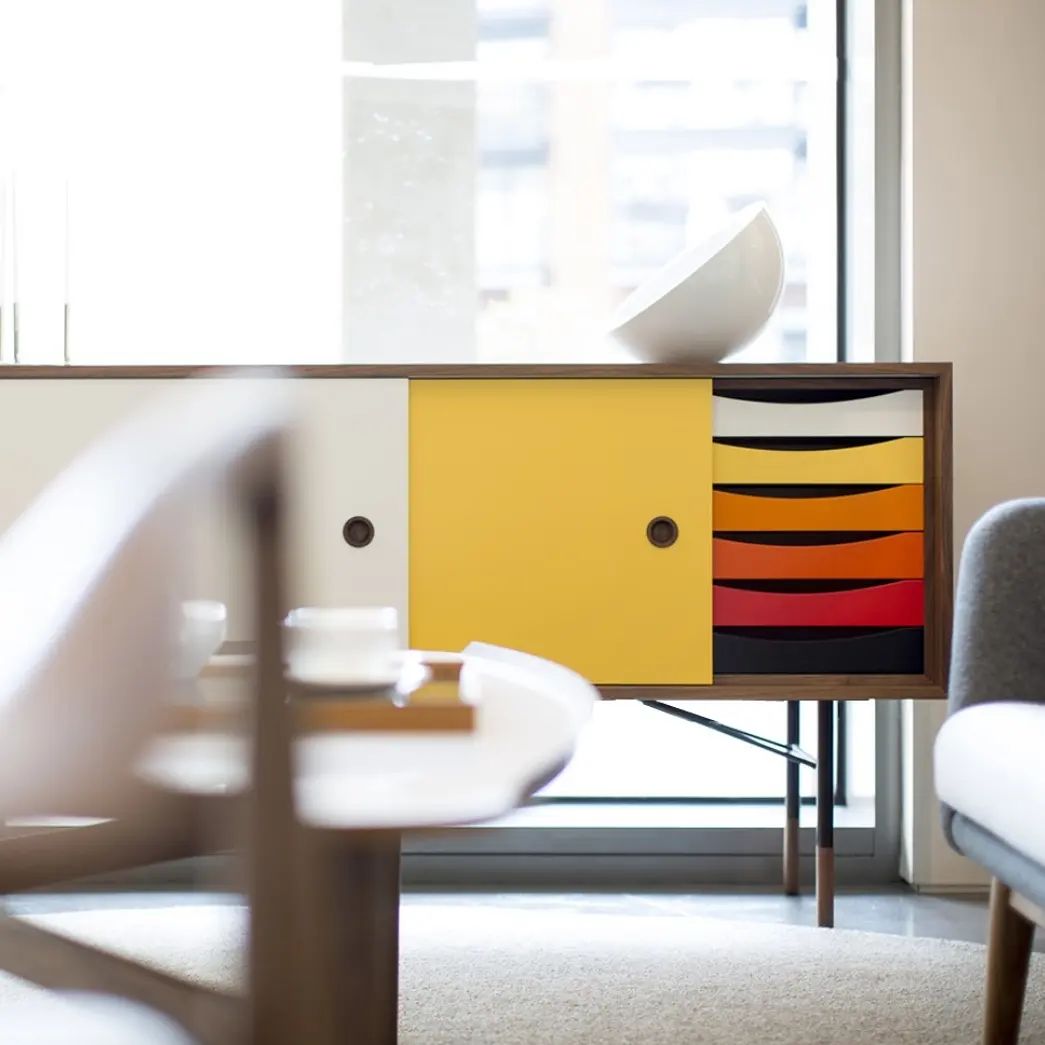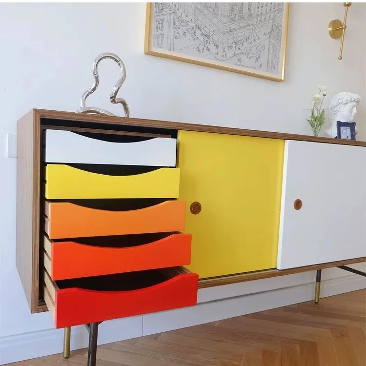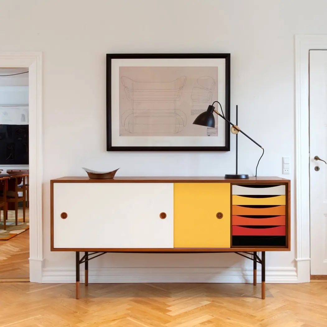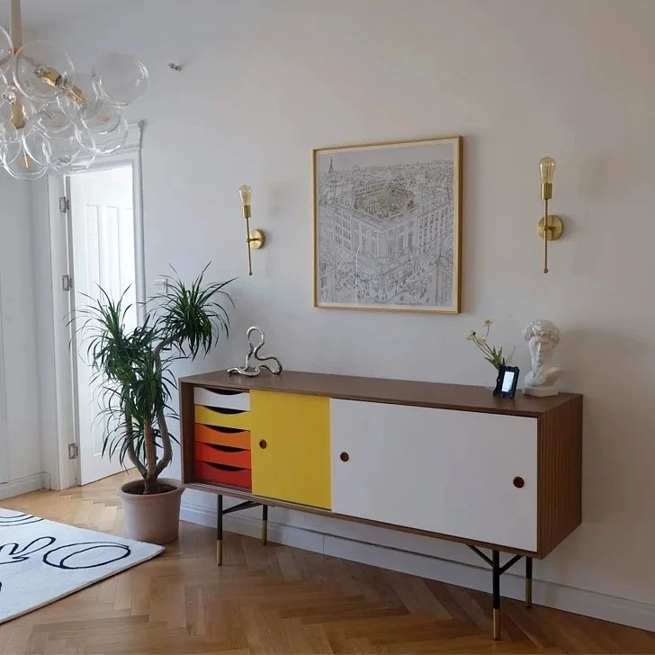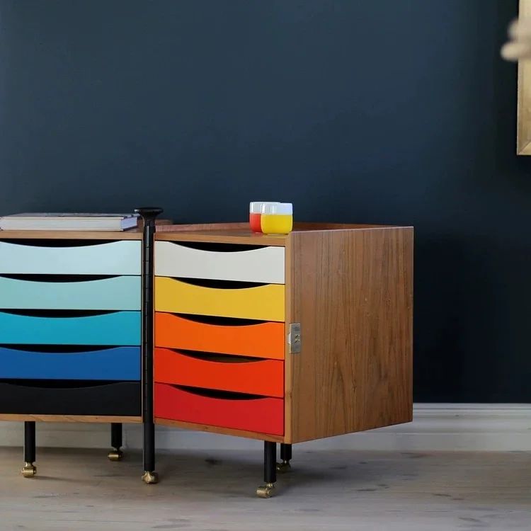 Очаровательные тумбы в стиле mid century! Дизайн, в котором гармонично сочетаются и минимализм, и роскошь. Всё зависит от того, на какой части части фокусировать внимание. Тонкие благородные и «позолоценные» ножки, фасад с яркими полками, и при этом, в целом, всё как-то сдержанно, как и полагается знаменитой эклектике mid century.